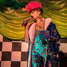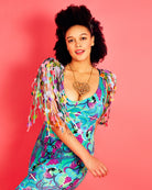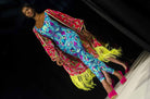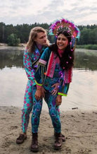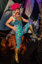Awesome fitted catsuit, with low cut back and thin straps in our Tribal Tales Blue print. A striking symmetrical design in mint green, purple and turquoise, made with the highest quality lycra fabric. Perfect for parties and festivals!