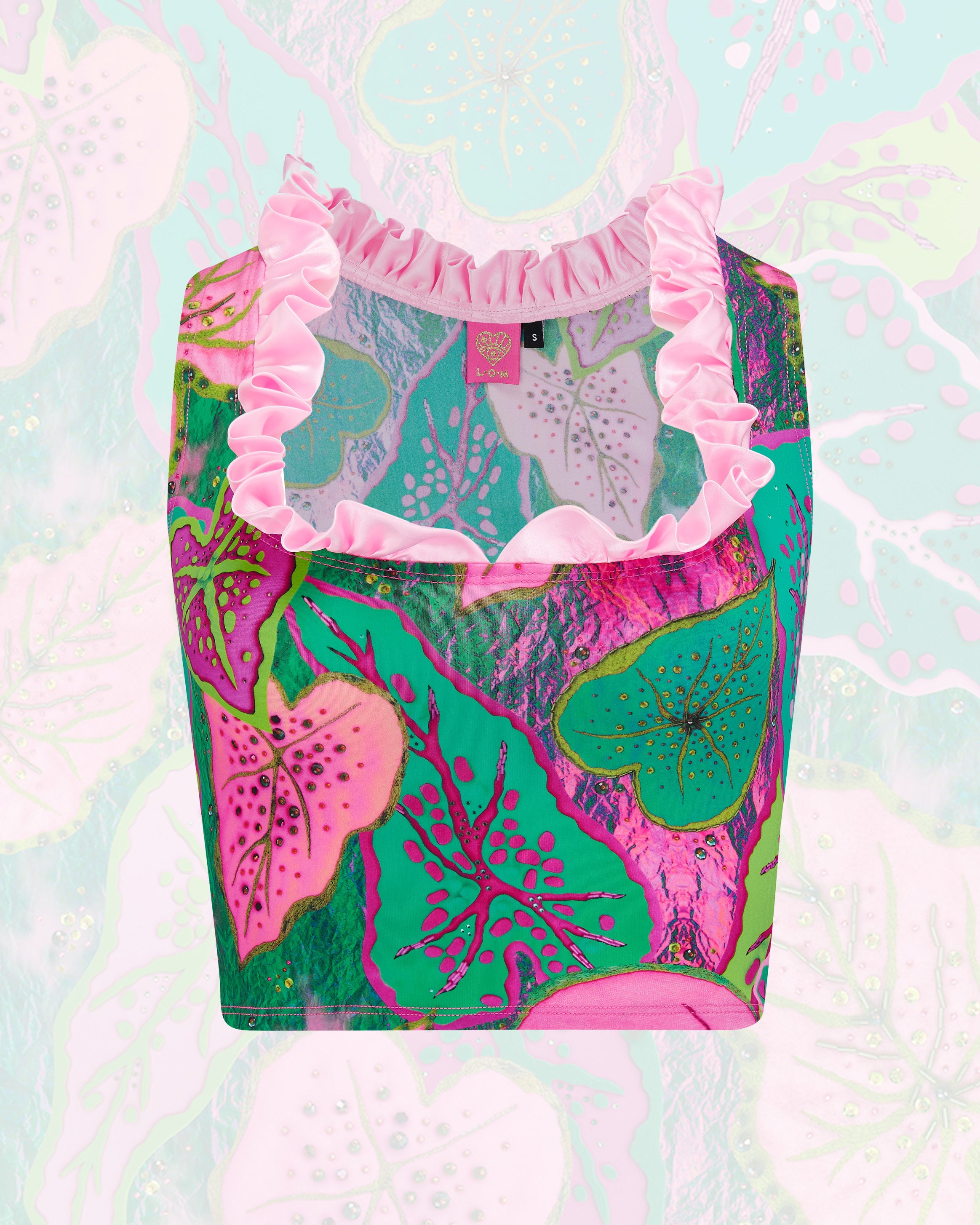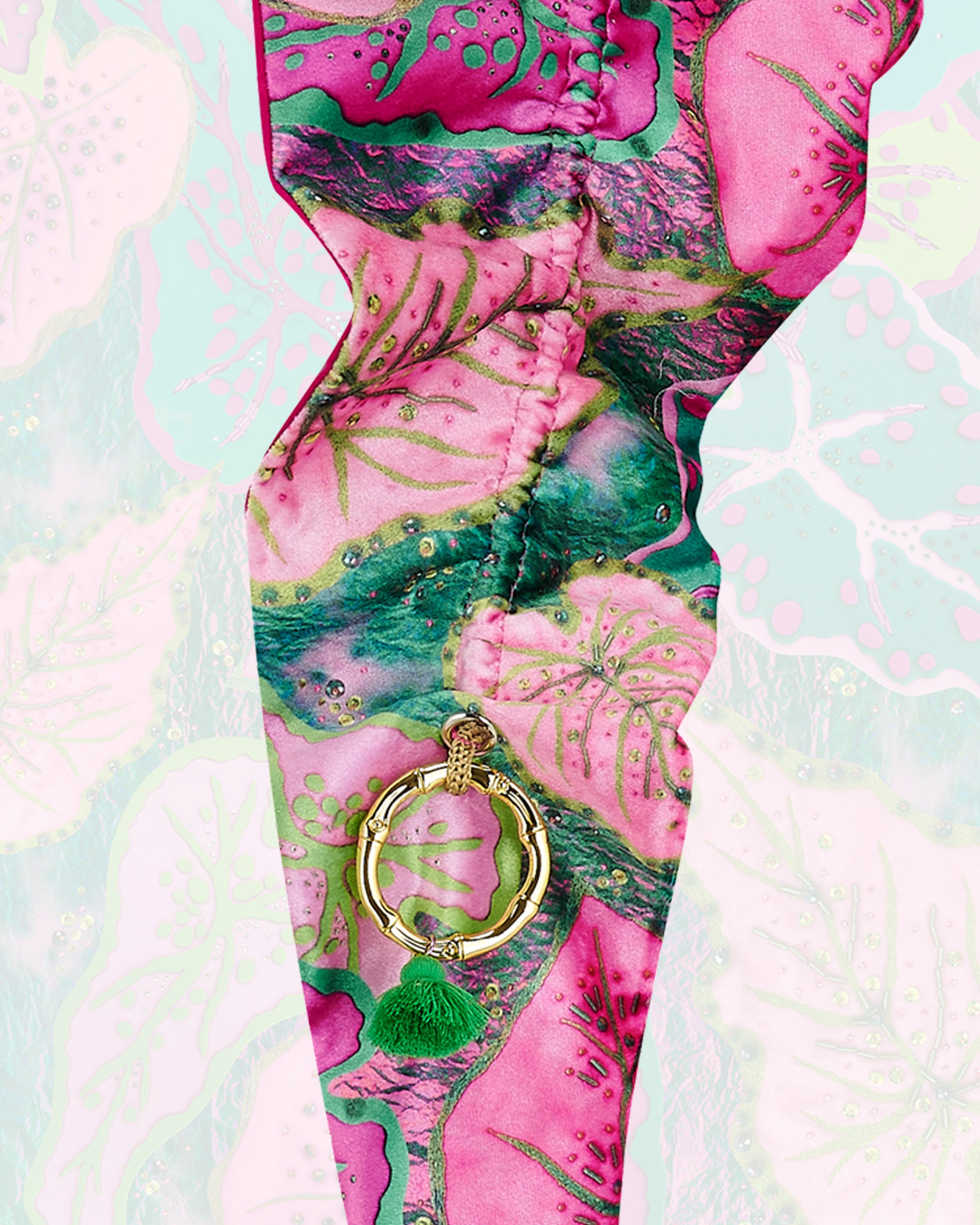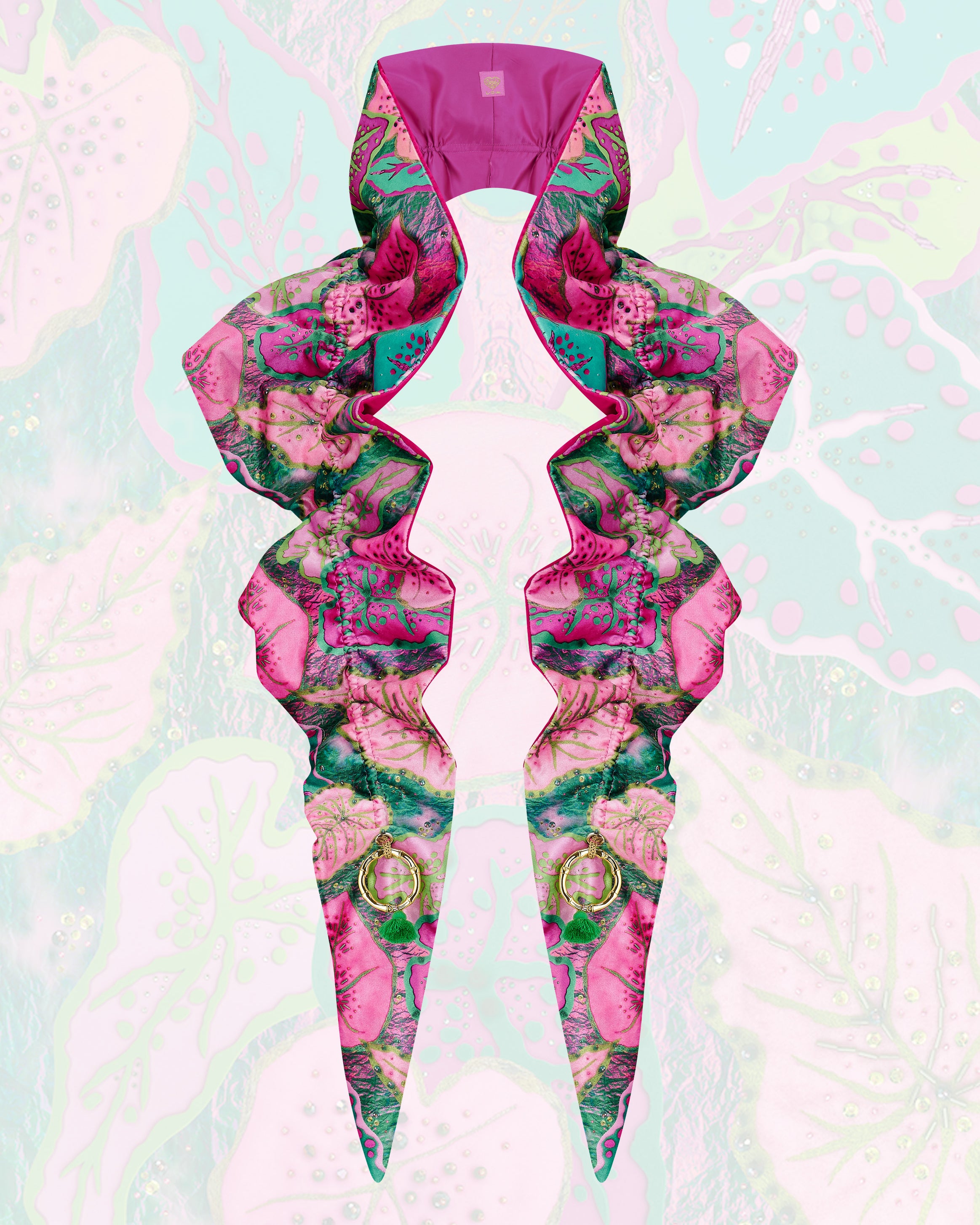 This collection features a gloriously rich tapestry of Caladium leaves, set against a stunning emerald green and pink backdrop. Each leaf, meticulously designed by Louise O'Mahony, embodies a unique blend of hand-cut shapes, machine embroidery, and delicate beadwork.