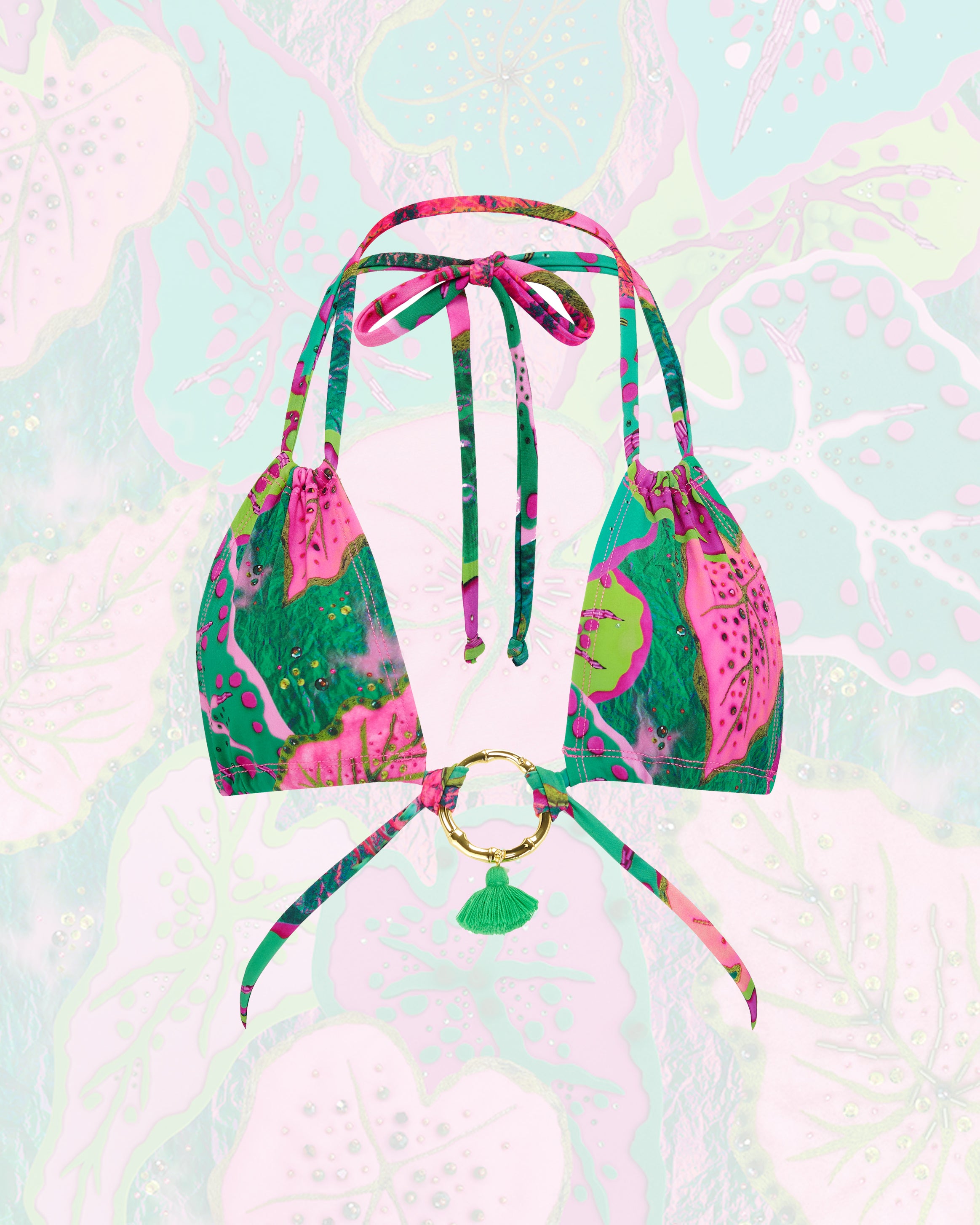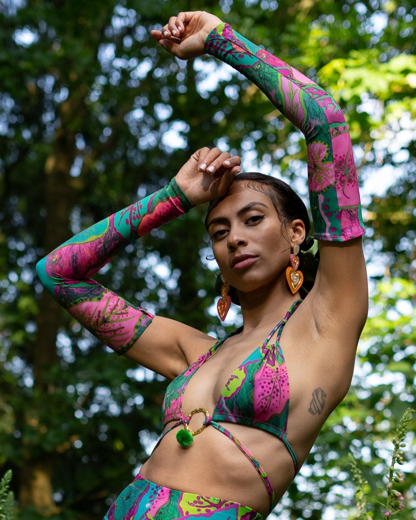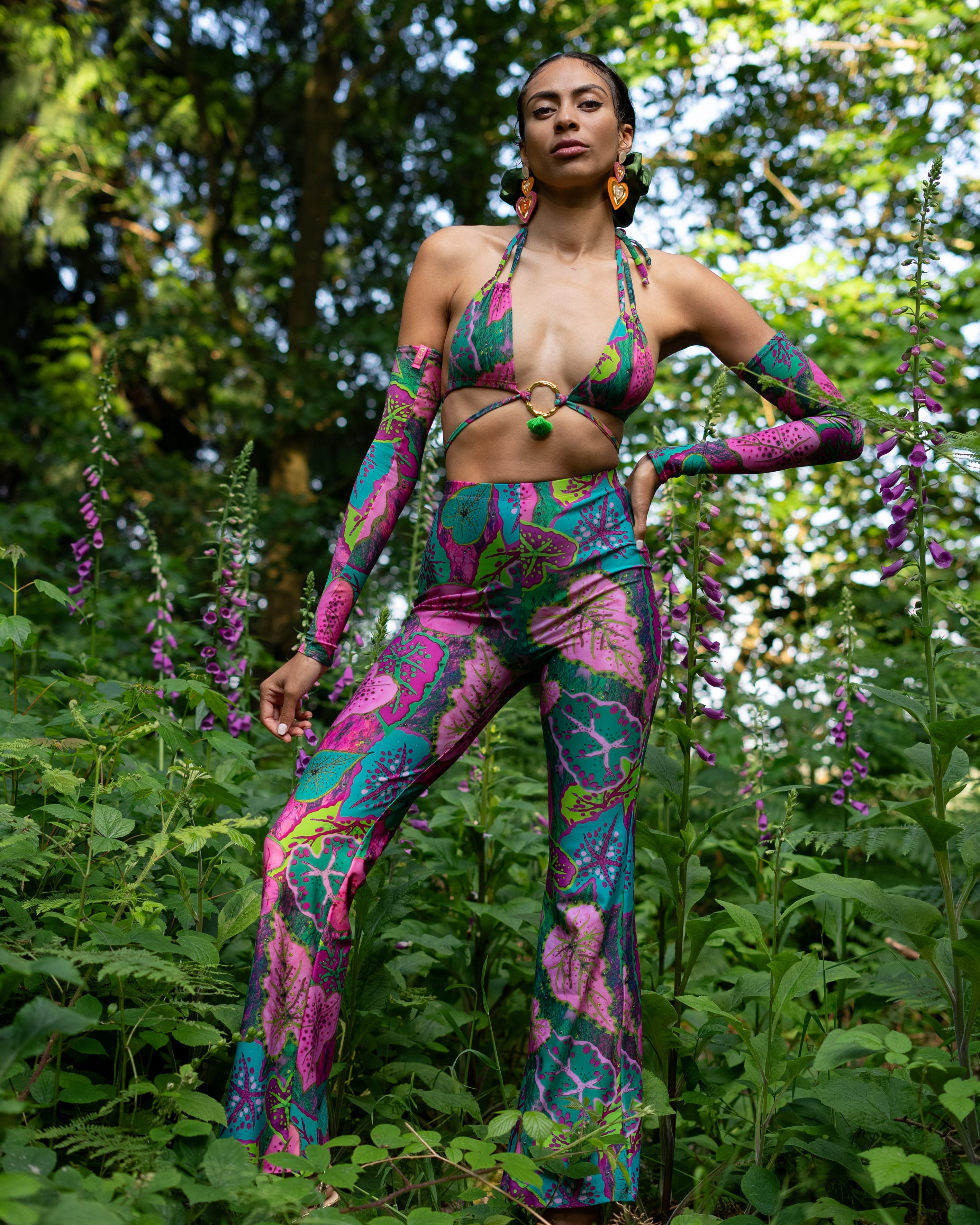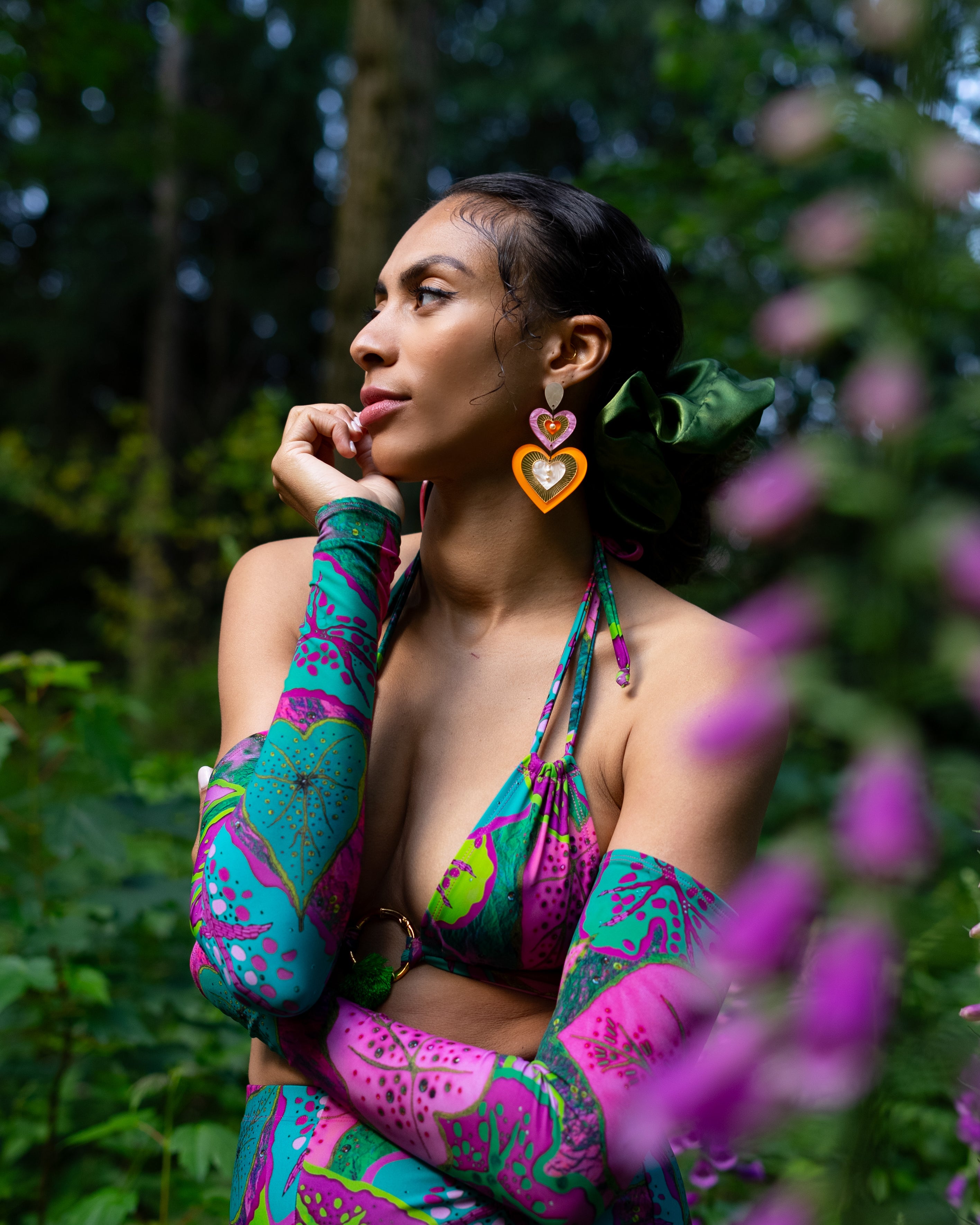 This collection features a gloriously rich tapestry of Caladium leaves, set against a stunning emerald green and pink backdrop. Each leaf, meticulously designed by Louise O'Mahony, embodies a unique blend of hand-cut shapes, machine embroidery, and delicate beadwork.