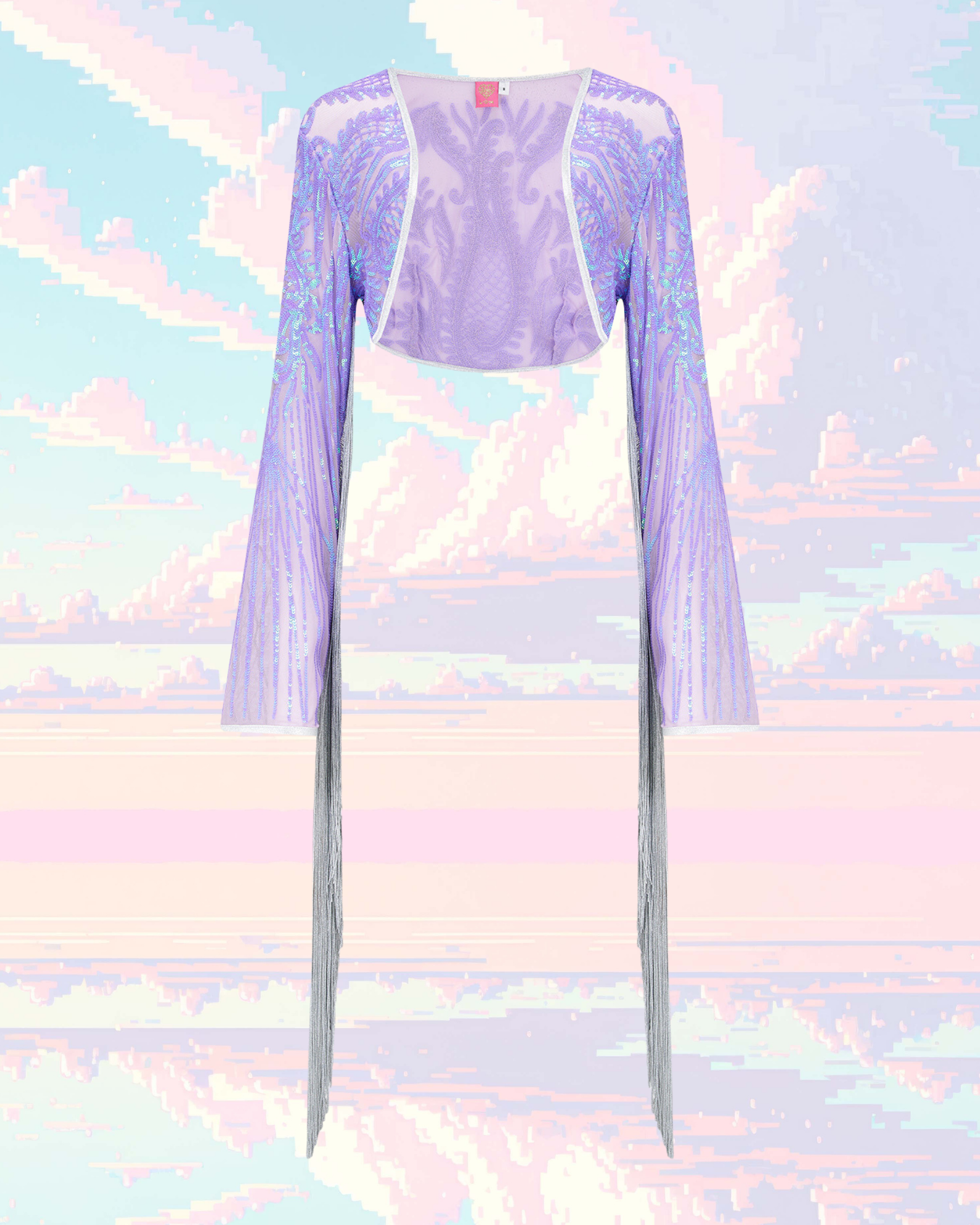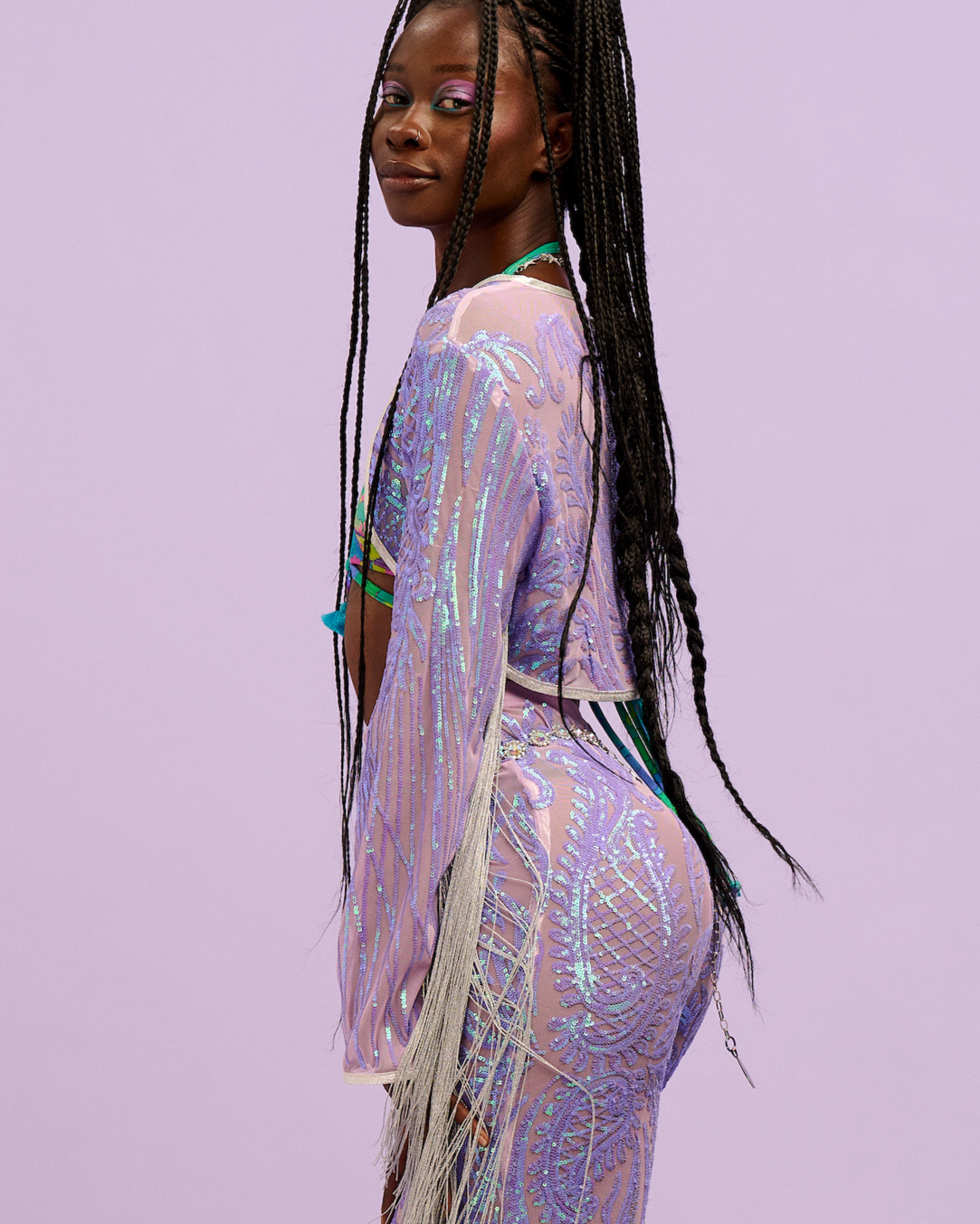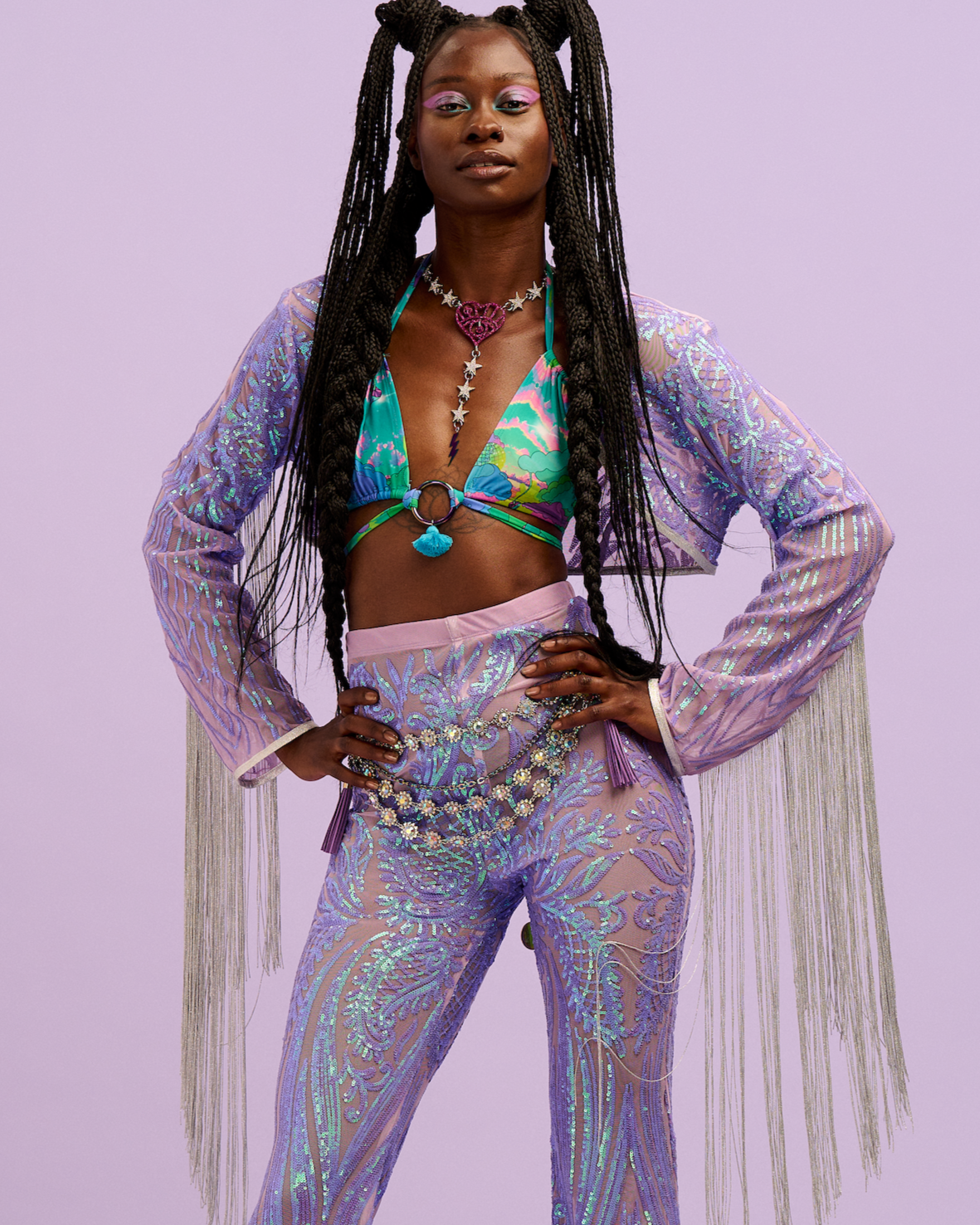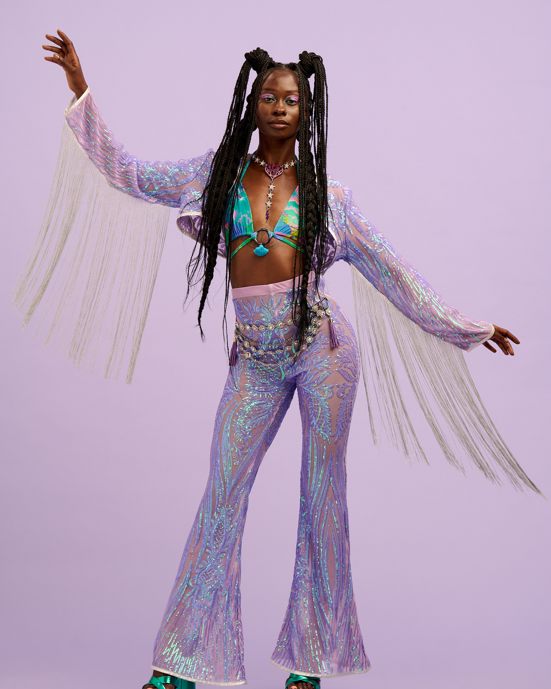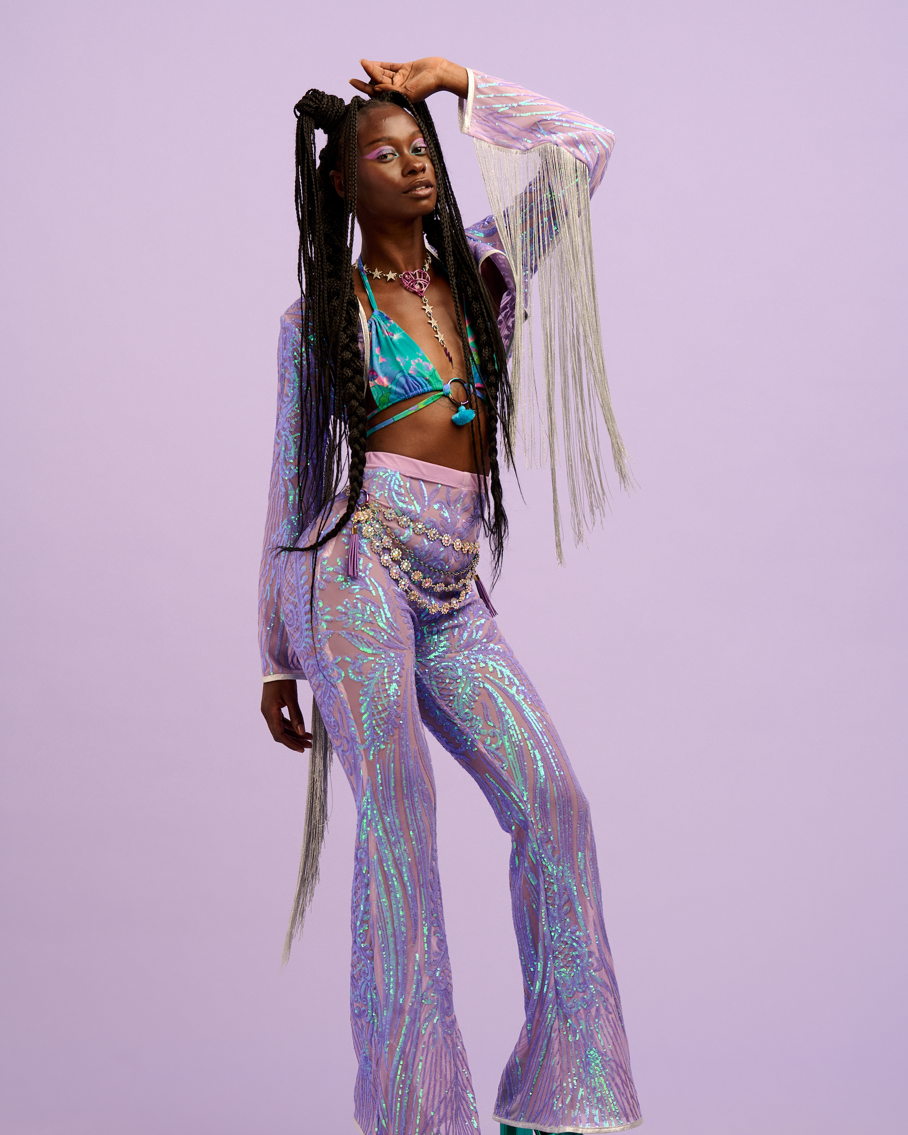 Nothing says party like a fringed arm!! Add a touch of playful flair to your festival outfit with our fringe pieces. From colourful fringed sleeves on our bodysuits and tops, to our shimmy-worthy Dallas trousers, these statement pieces are perfect for adding movement and texture to any outfit. The neon fringes all boldly glow under UV blacklight, and many of our fringed pieces are customisable so that you can choose your own fringe colour when we make your order! Explore our range of colours and styles to find the perfect fringe piece to express your individuality.