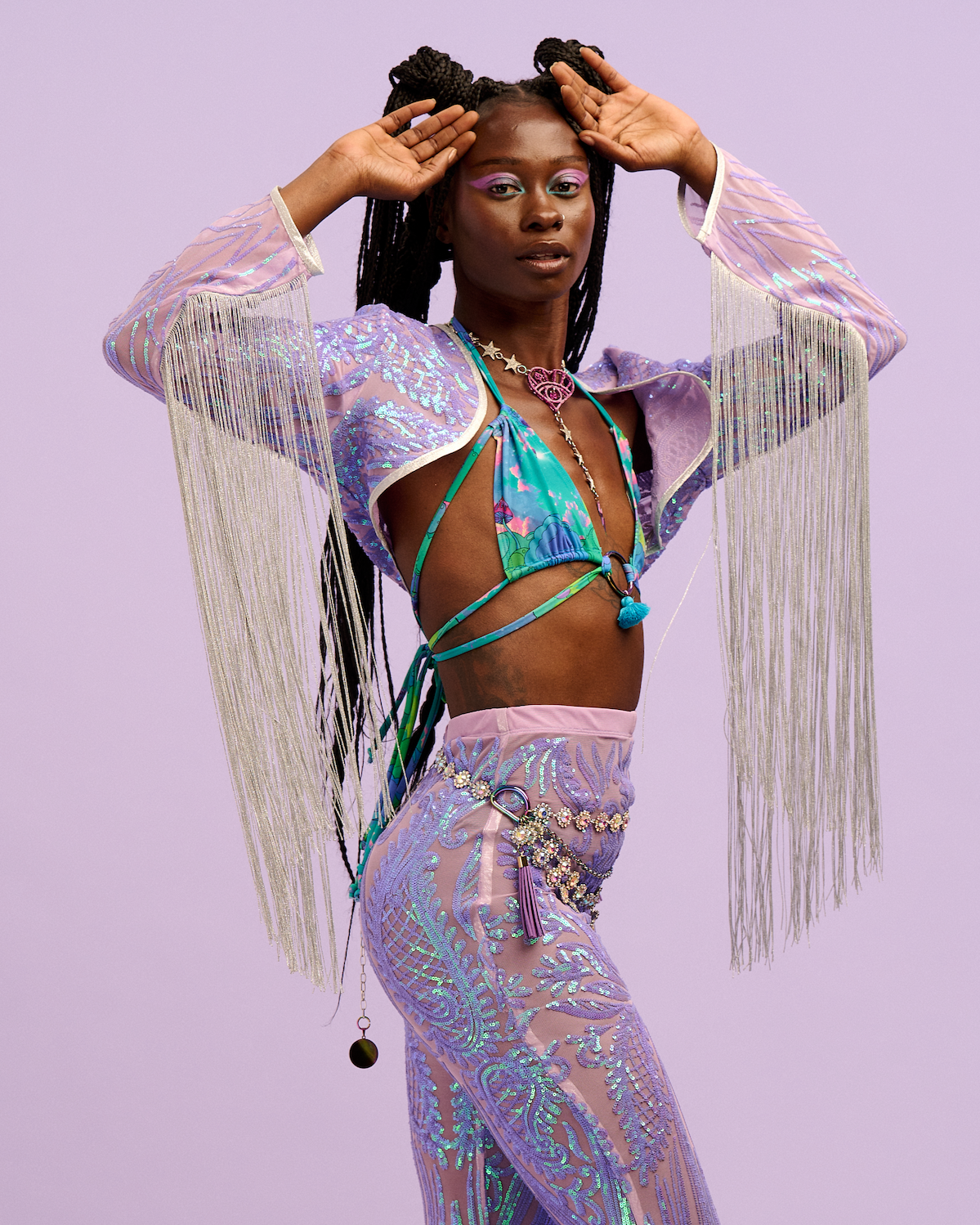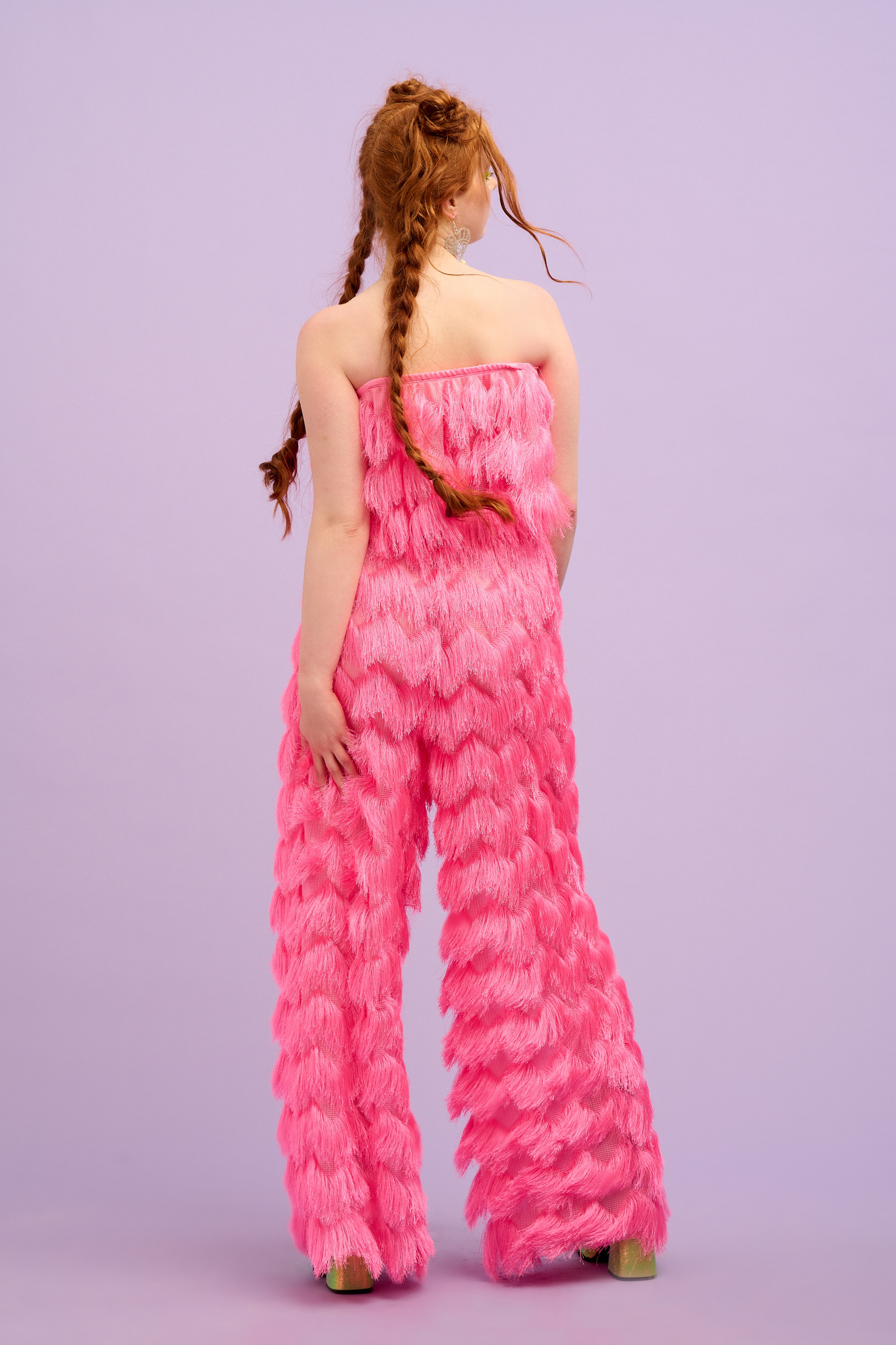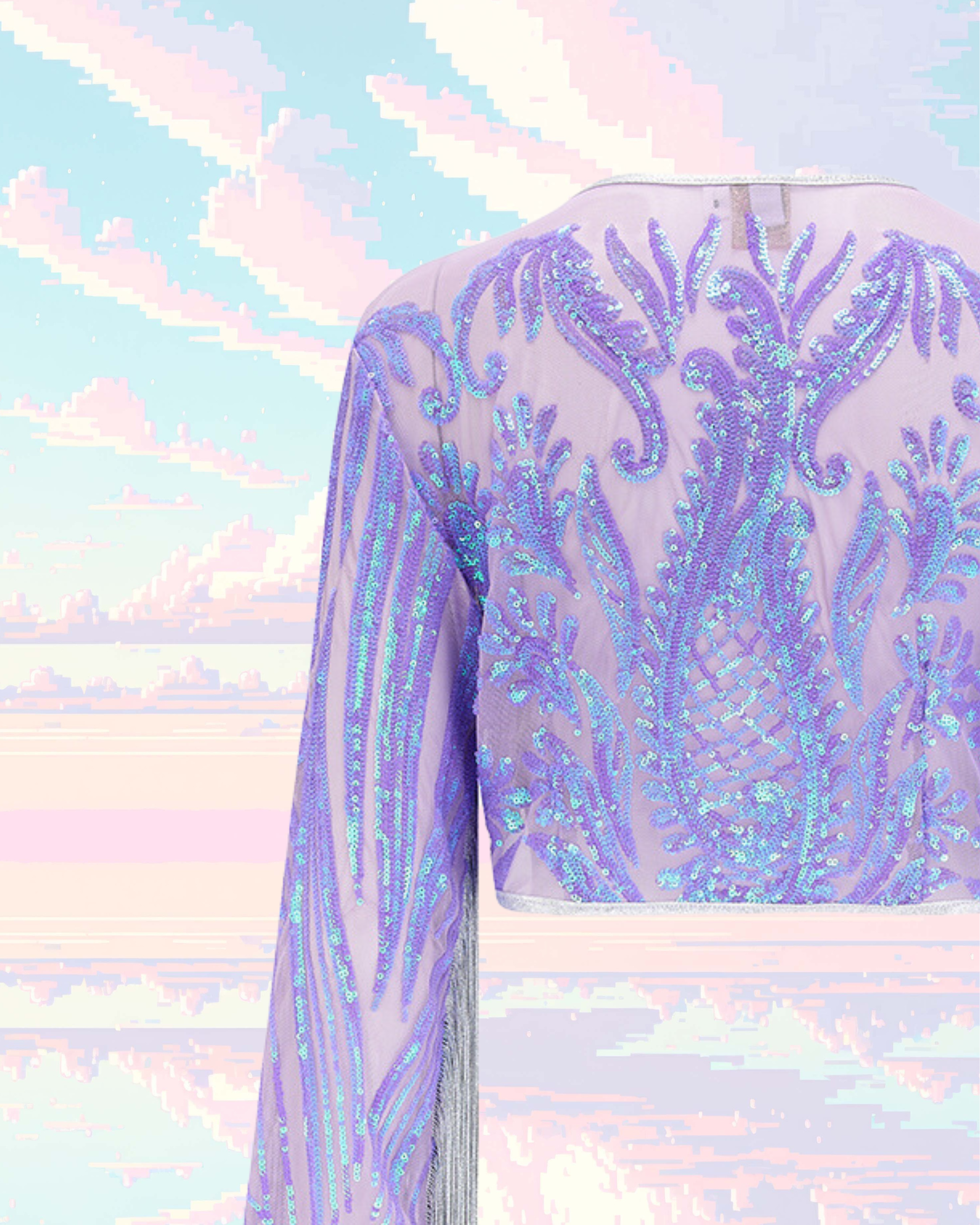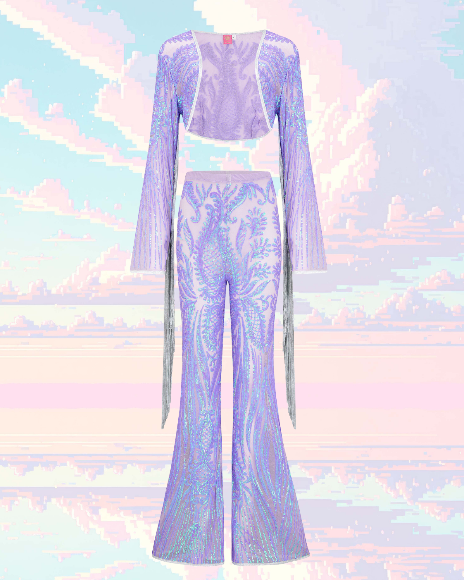 Nothing says party like a fringed arm!! Add a touch of playful flair to your festival outfit with our fringe pieces. From colourful fringed sleeves on our bodysuits and tops, to our shimmy-worthy Dallas trousers, these statement pieces are perfect for adding movement and texture to any outfit. The neon fringes all boldly glow under UV blacklight, and many of our fringed pieces are customisable so that you can choose your own fringe colour when we make your order! Explore our range of colours and styles to find the perfect fringe piece to express your individuality.