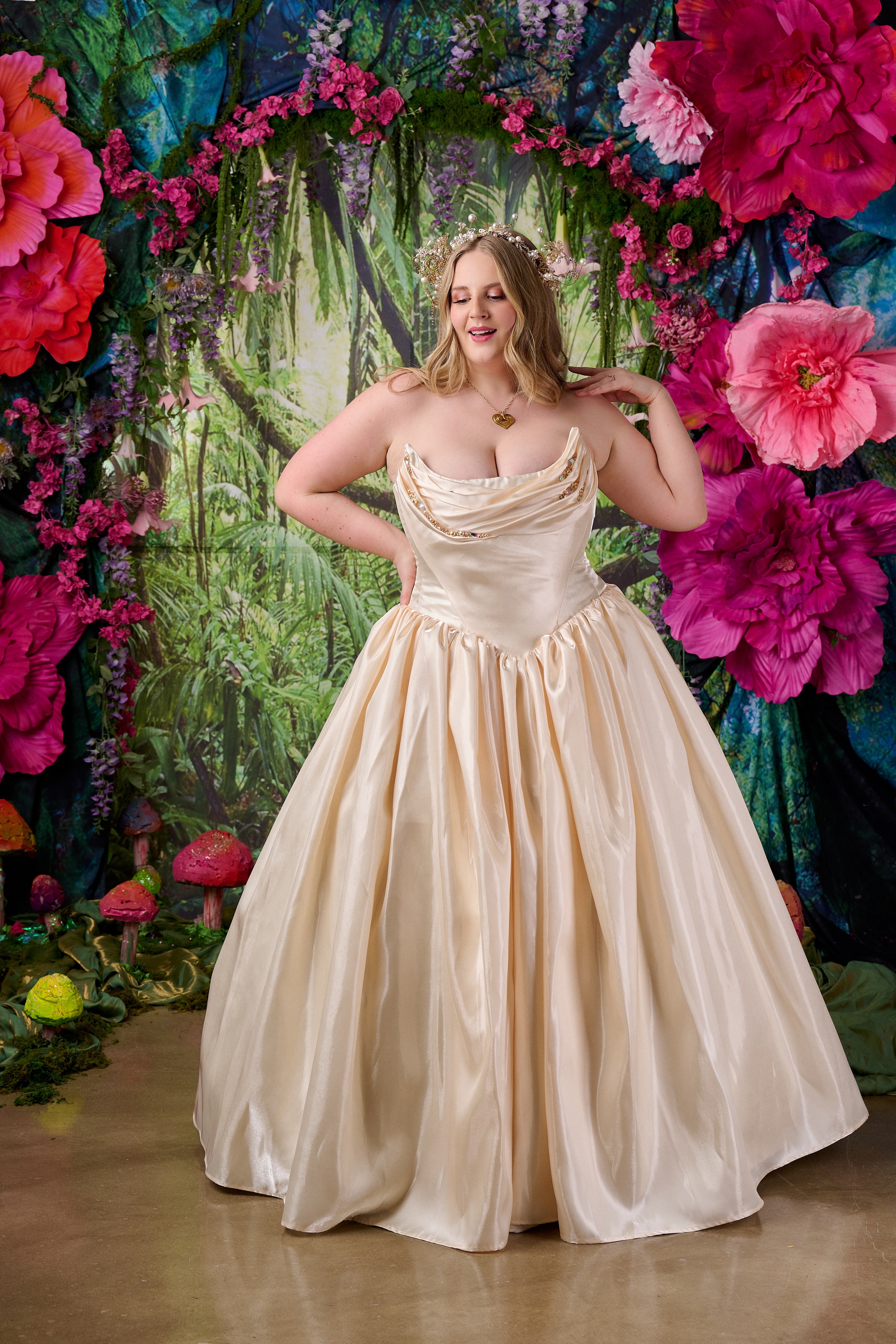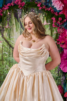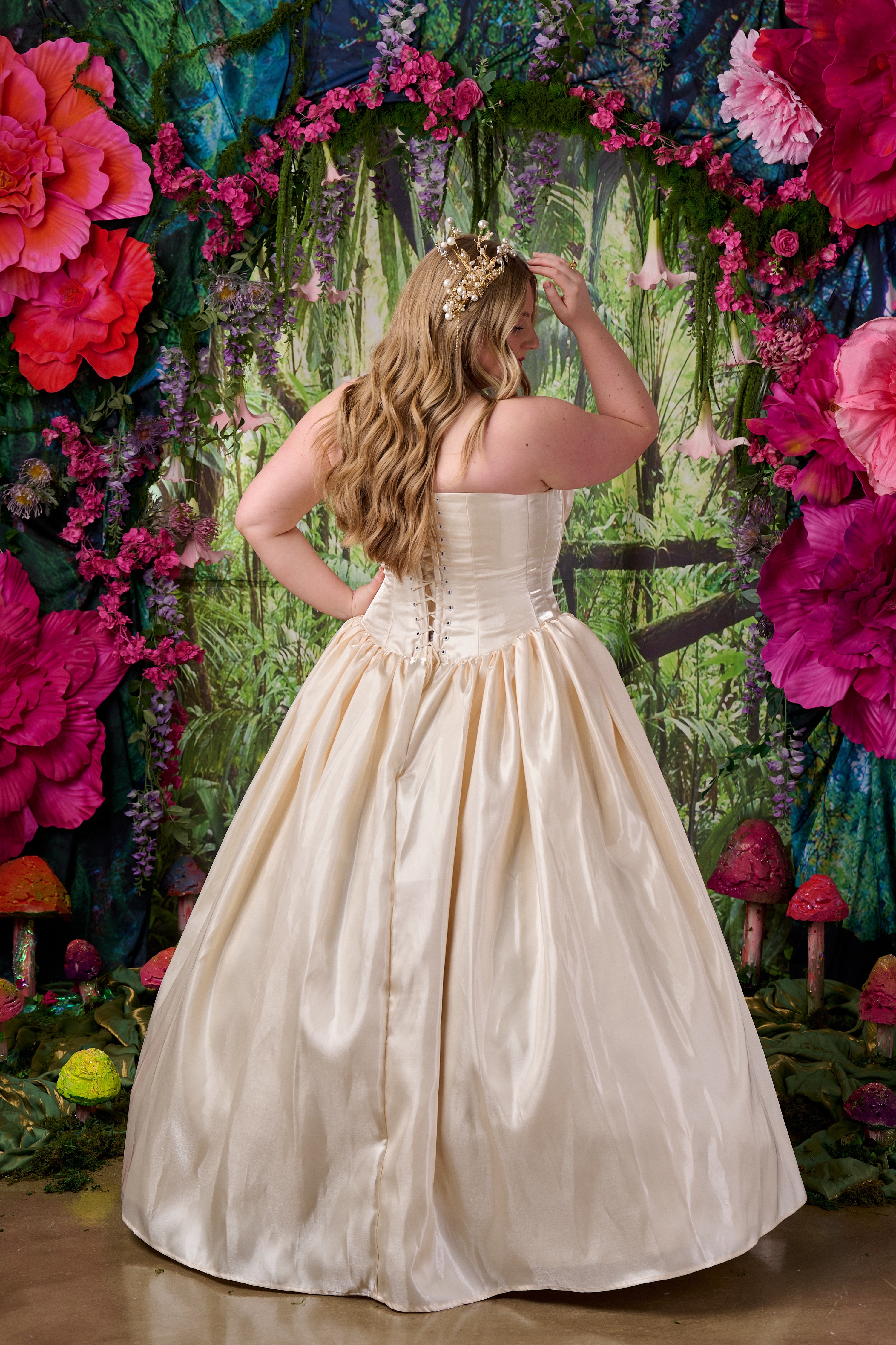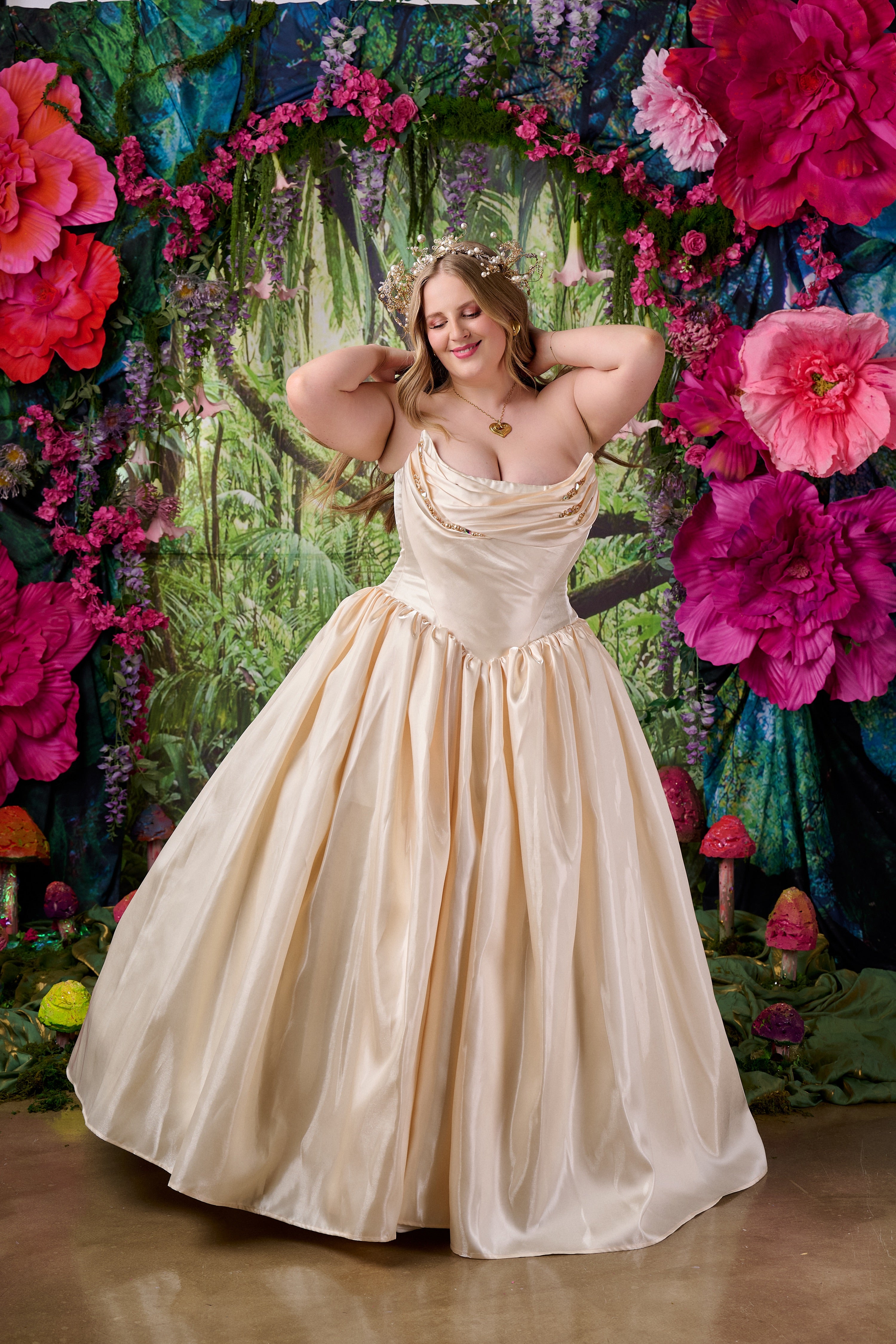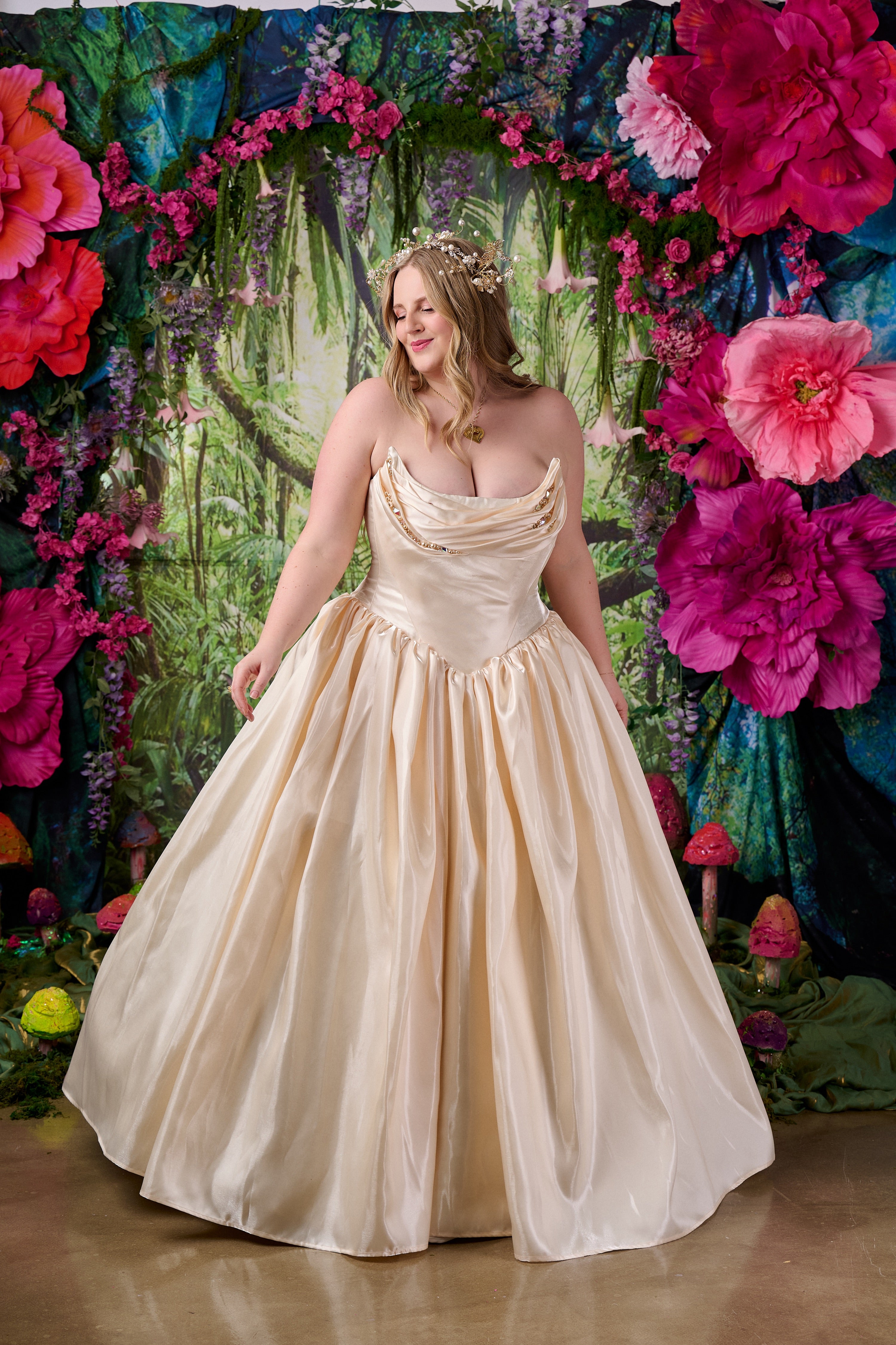 The bodice is constructed with spiral steel boning, creating a fully structured corset that offers support while sculpting the waist into a striking silhouette. Across the bust, the corset is draped with the reverse side of the satin, introducing contrast and texture to the design.
