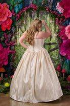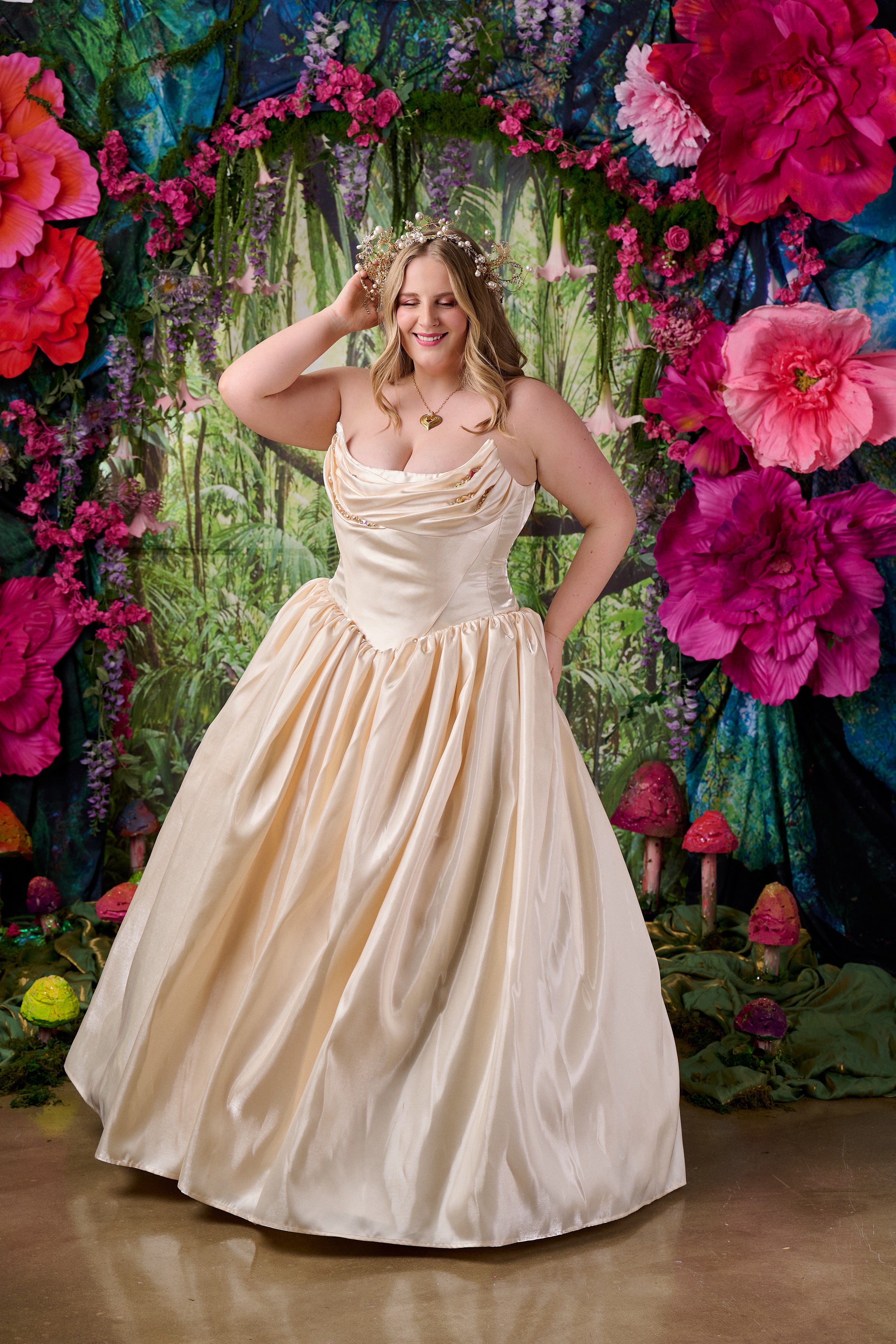 Crafted from extraordinary liquid satin, the fabric flows around the body with a soft, reflective sheen that catches the light with every movement, giving the gown a subtle, magical shimmer.
