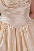 The bodice folds are then filled with hand-sewn vintage pearls and iridescent glass crystals, creating a constellation of delicate sparkle that enhances the richness of the fabric.
