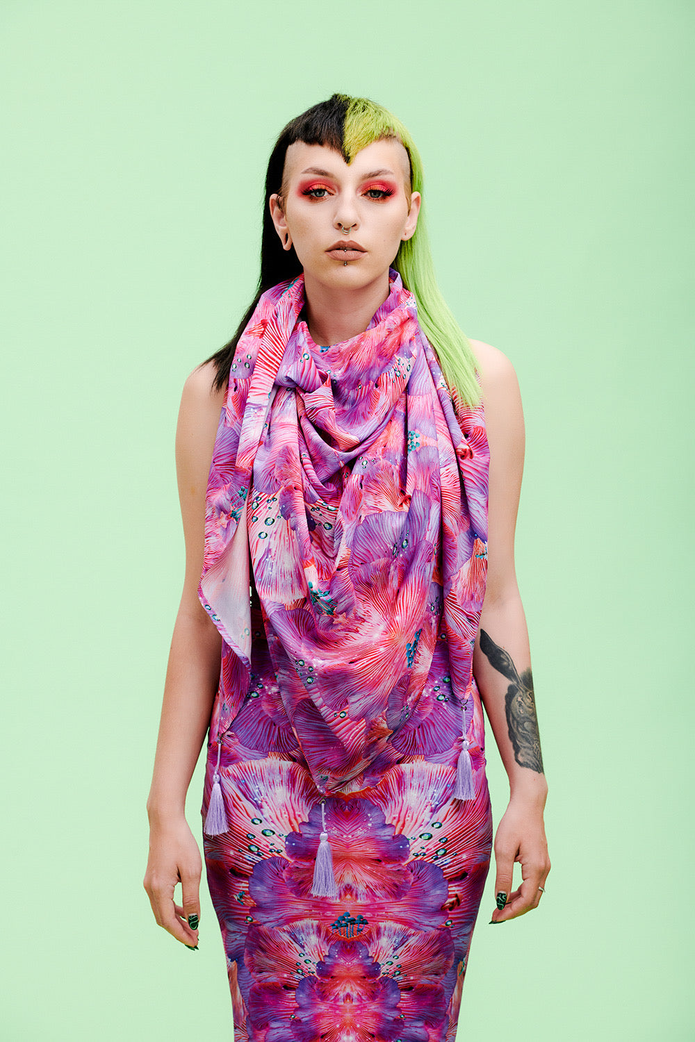 We have created the triangle scarf as a more affordable option to drape yourself in L.O.M. Instead of silk we have used poly crepe de chine, and cut across the diagonal of the fabric, using less material but giving a similar effect to the giant scarfs.