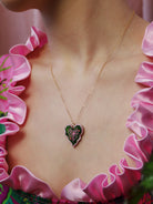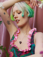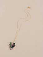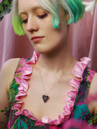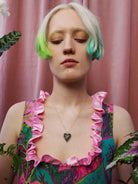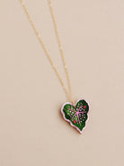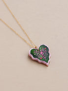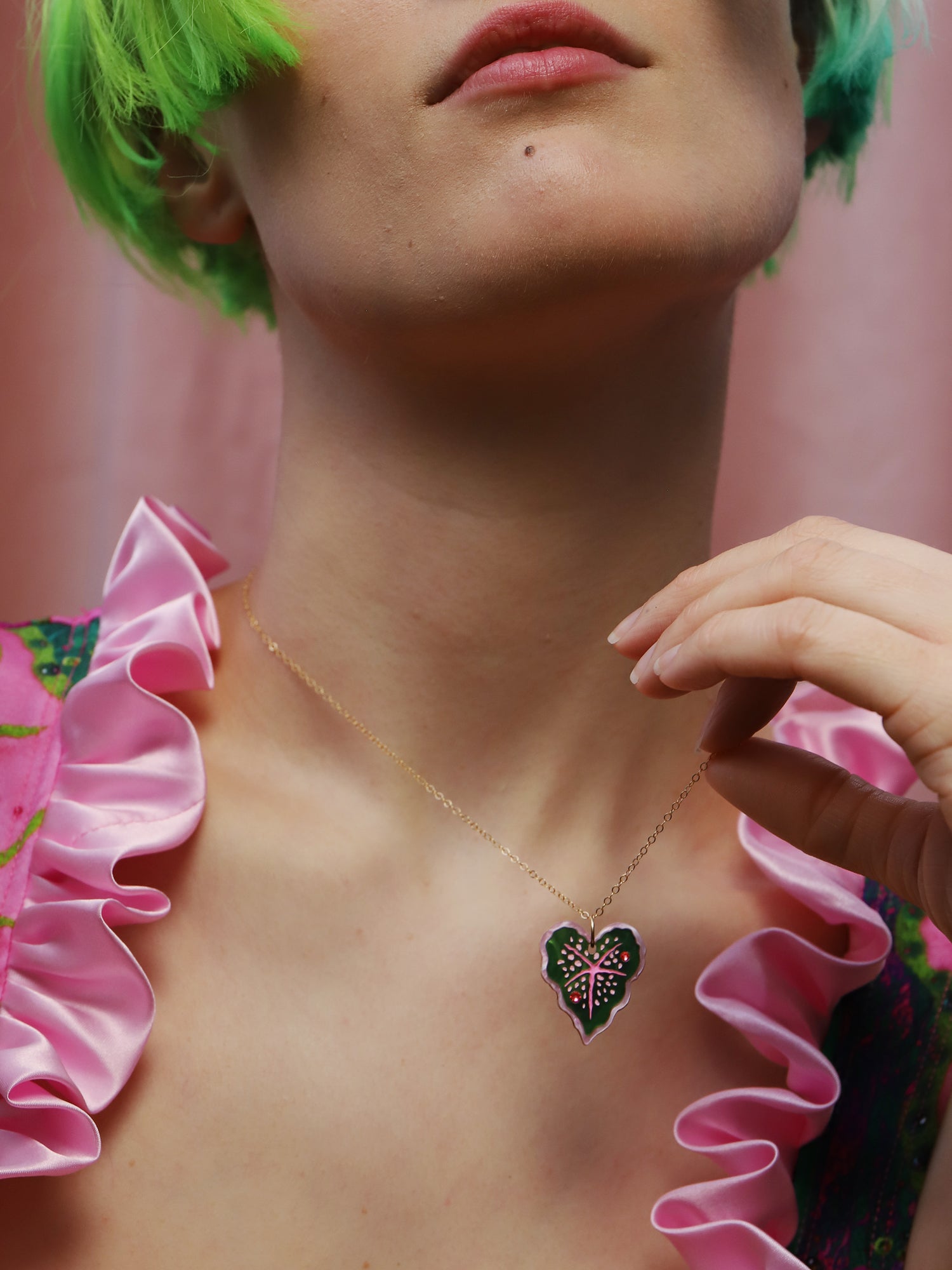 This beautiful statement necklace features a pink and green leaf with glas crystals and wooden backing 🌿💗