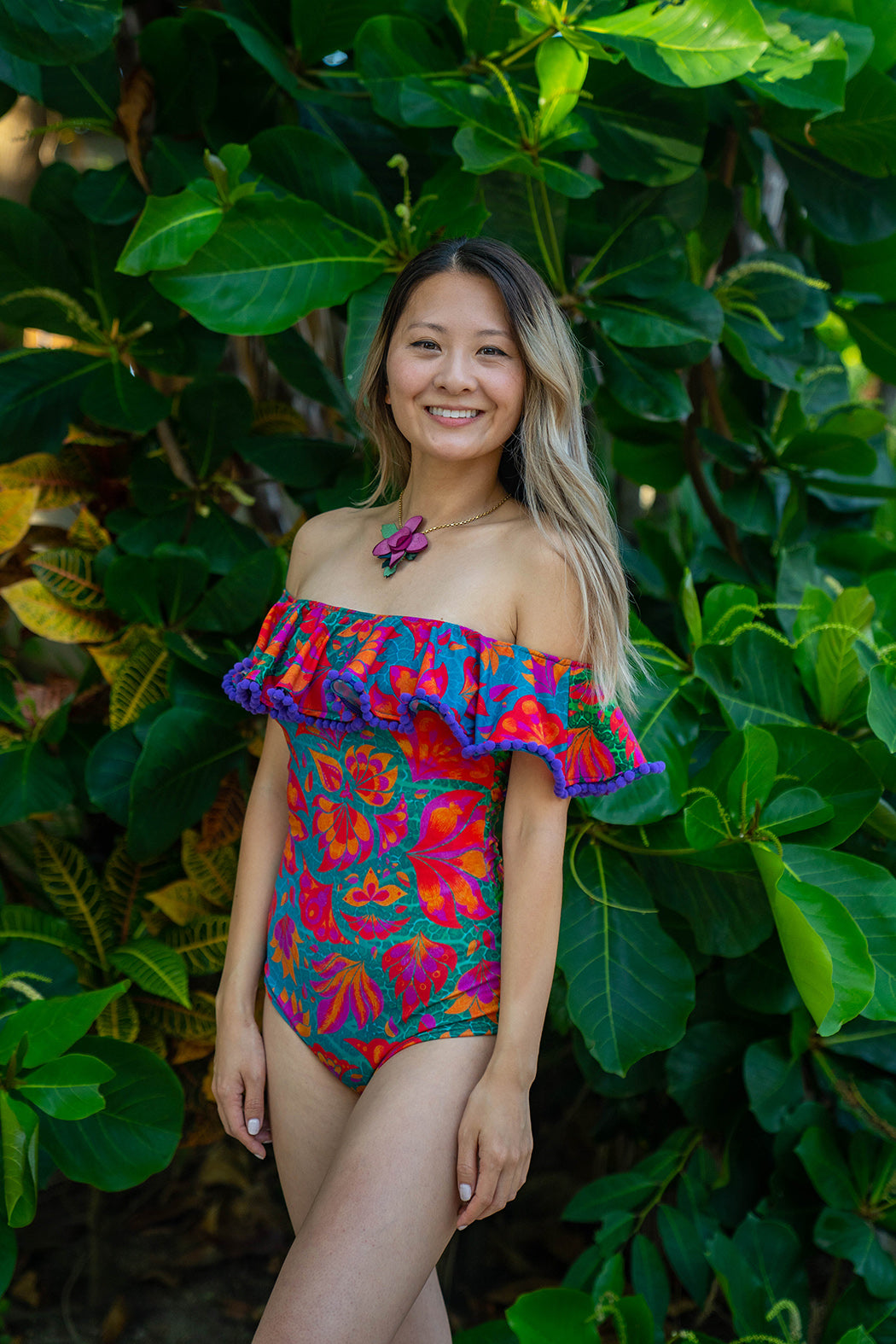 - Schulterfreies Bardot-Rüschenkleid mit lilafarbenen Bommeln – passen Sie die Farbe unten individuell an!