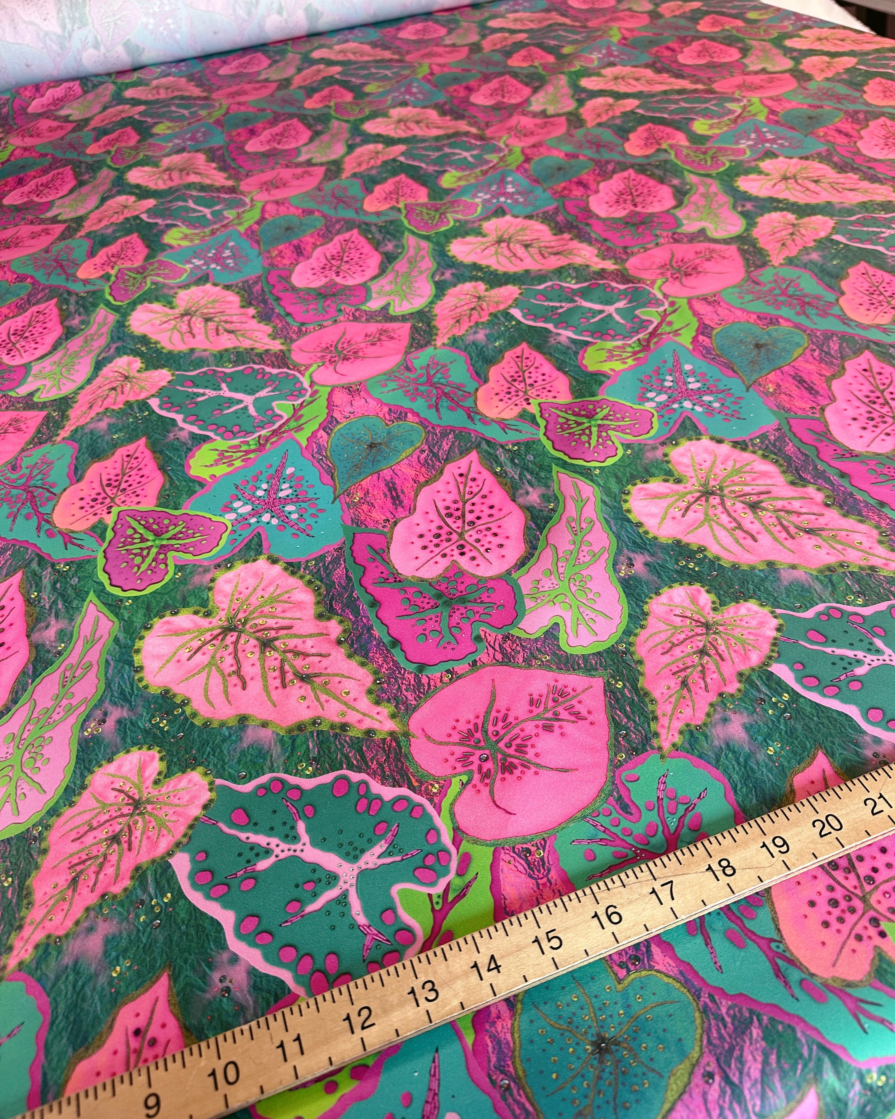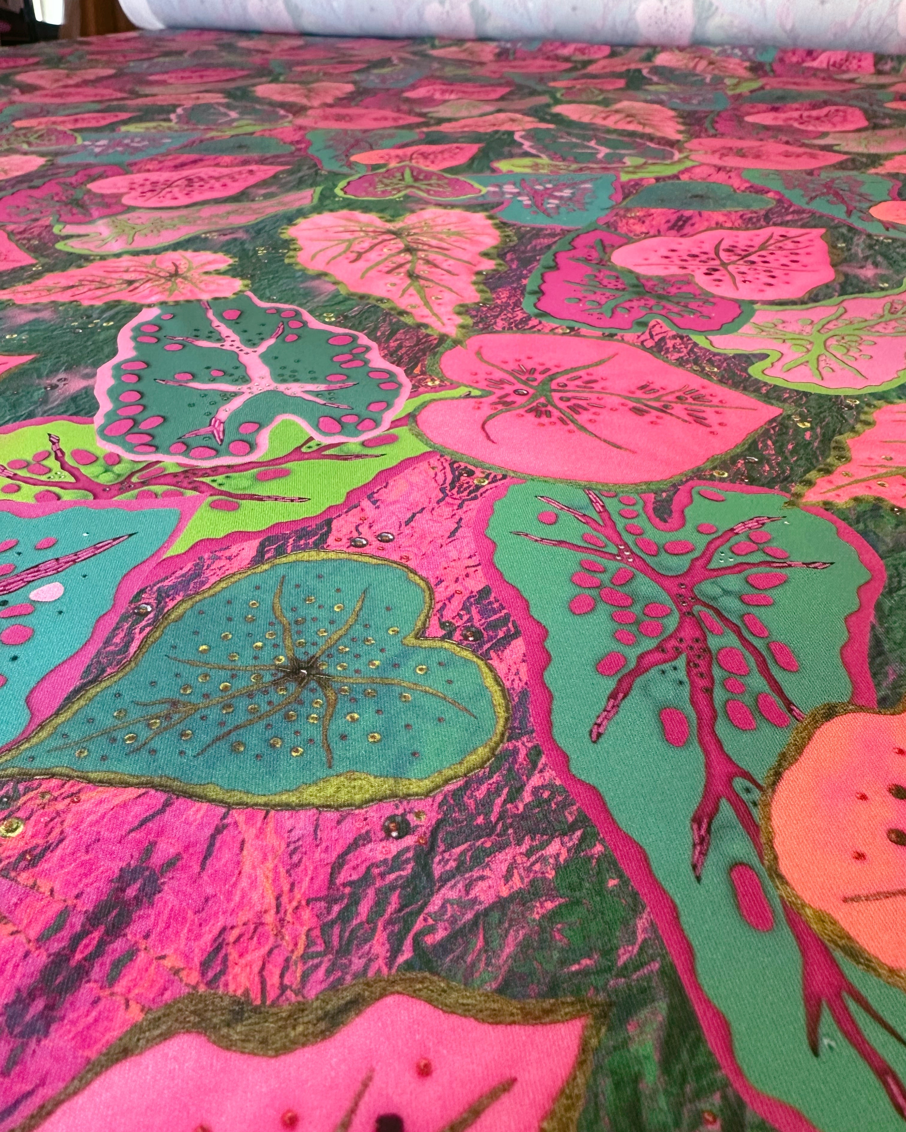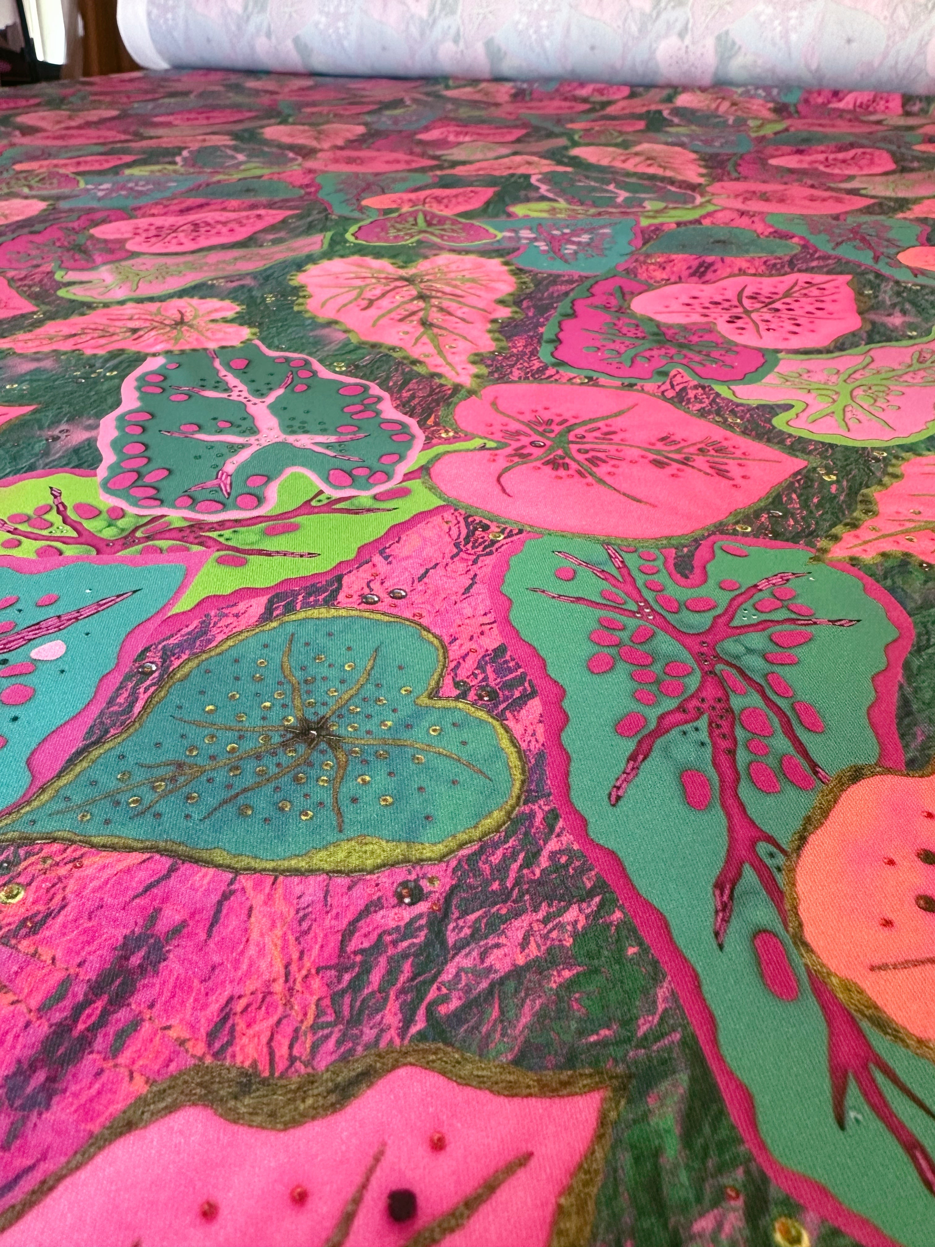 This collection features a gloriously rich tapestry of Caladium leaves, set against a stunning emerald green and pink backdrop. Each leaf, meticulously designed by Louise O'Mahony, embodies a unique blend of hand-cut shapes, machine embroidery, and delicate beadwork.