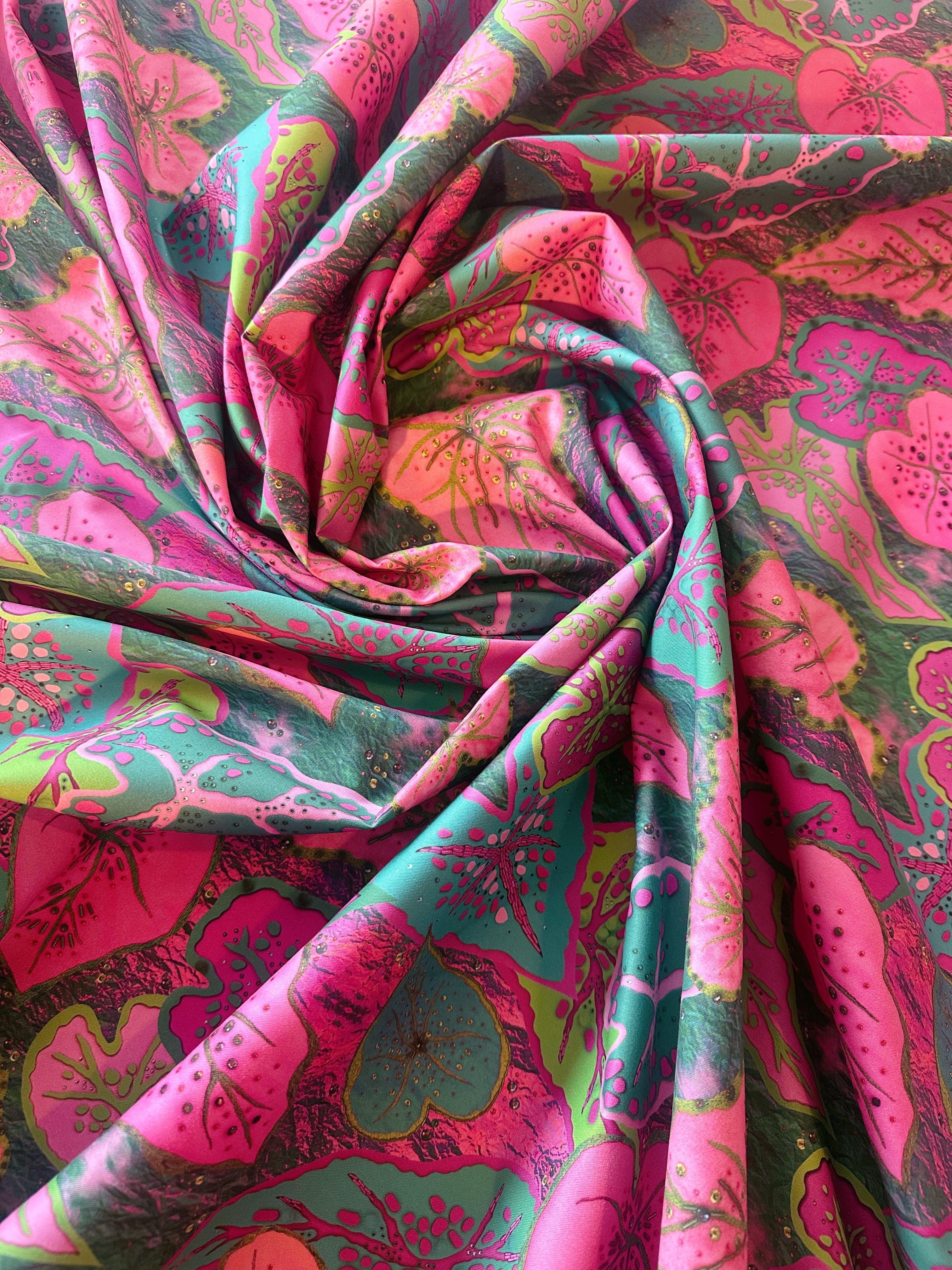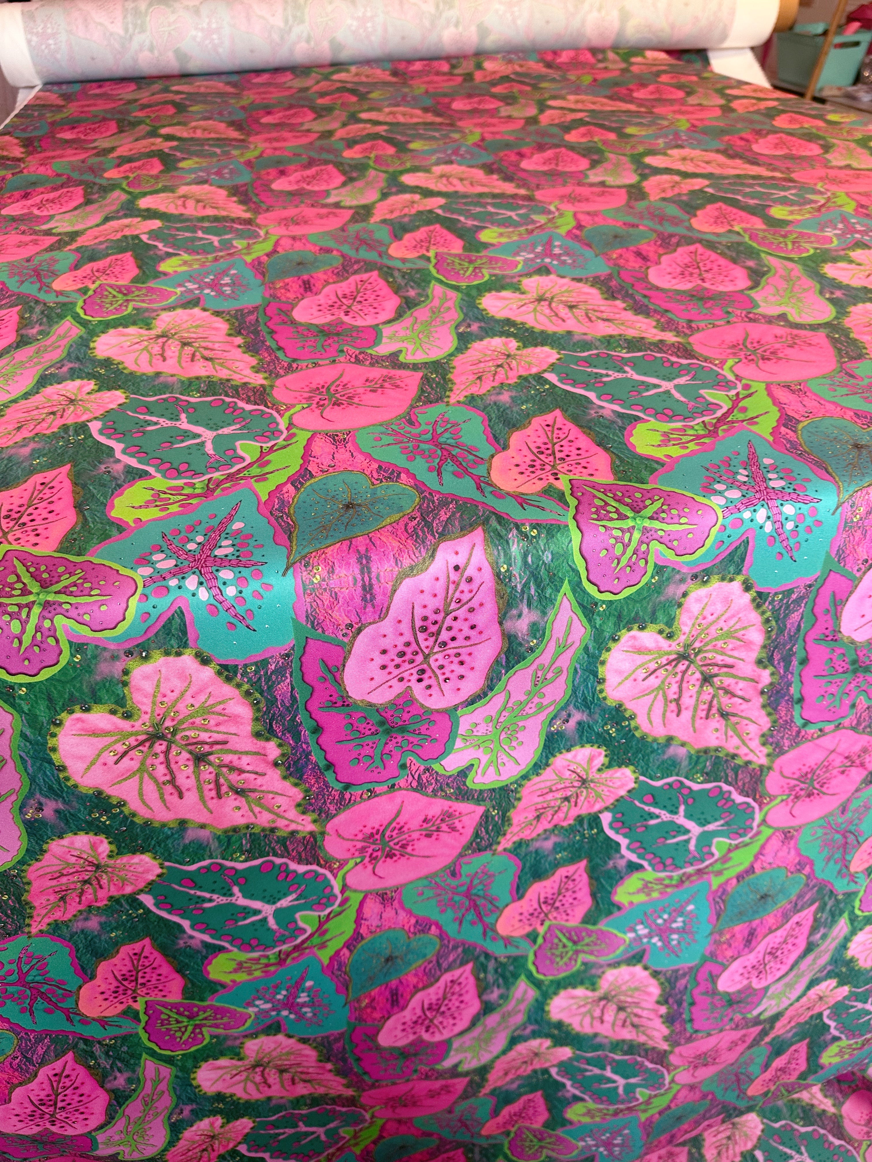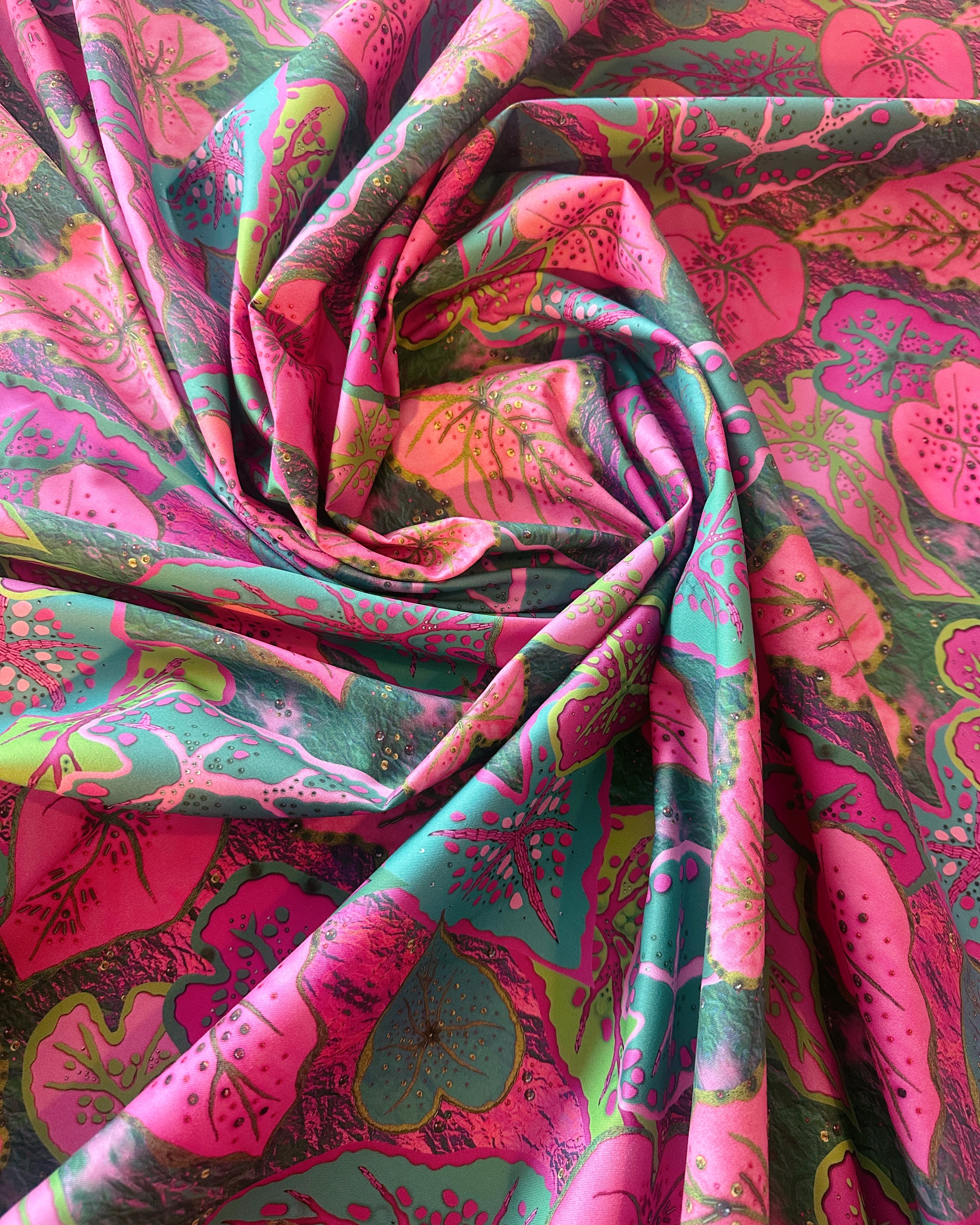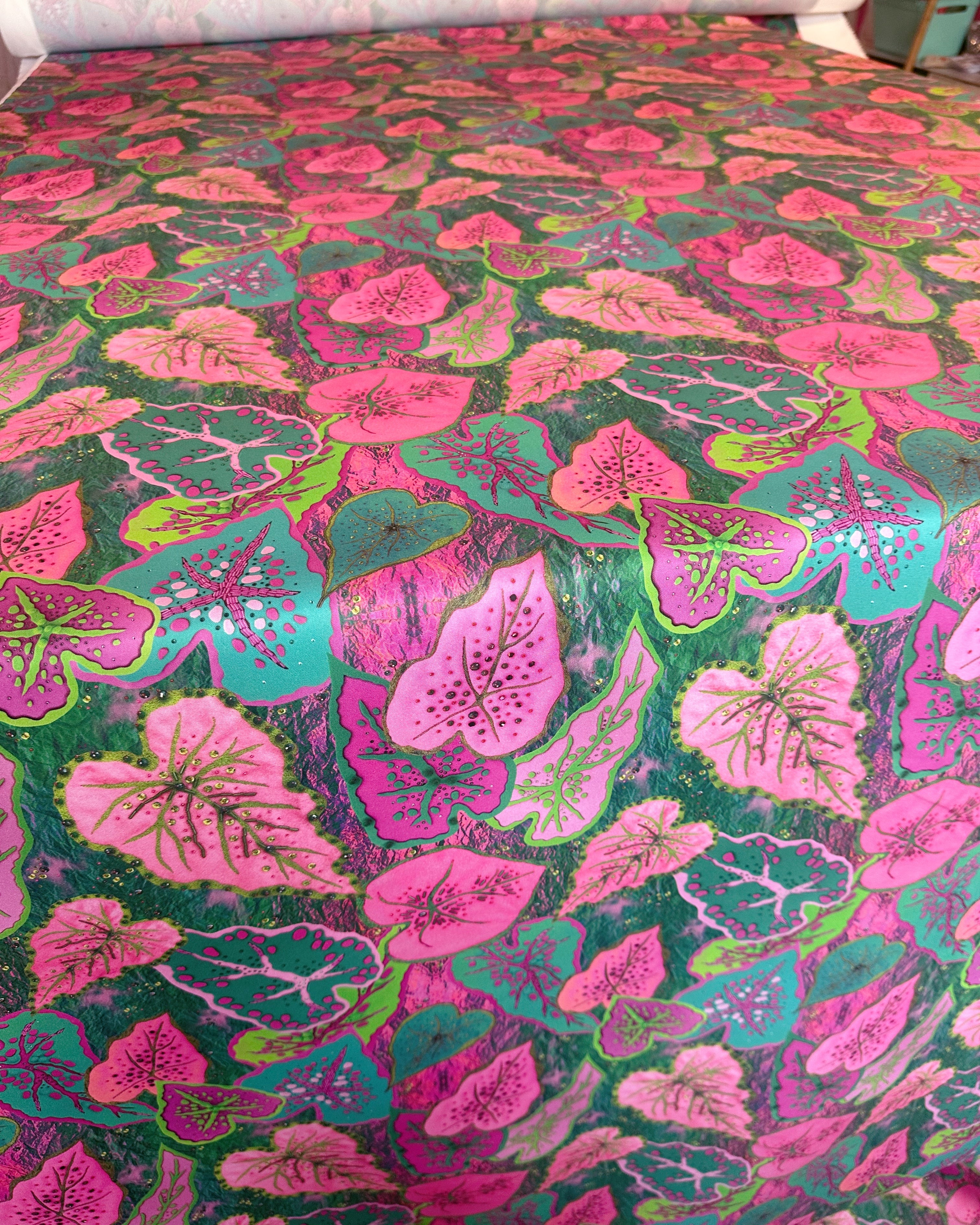This collection features a gloriously rich tapestry of Caladium leaves, set against a stunning emerald green and pink backdrop. Each leaf, meticulously designed by Louise O'Mahony, embodies a unique blend of hand-cut shapes, machine embroidery, and delicate beadwork.