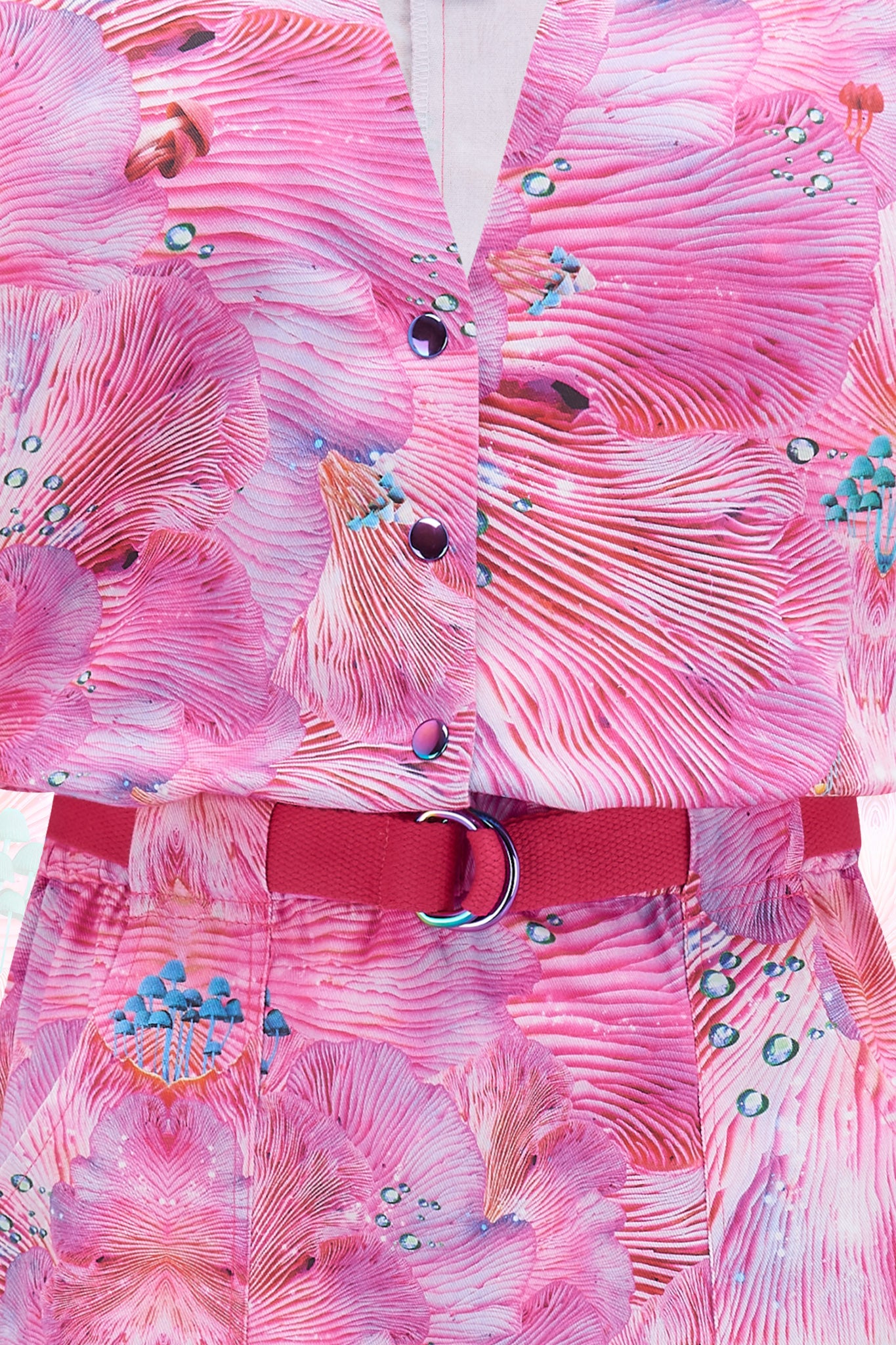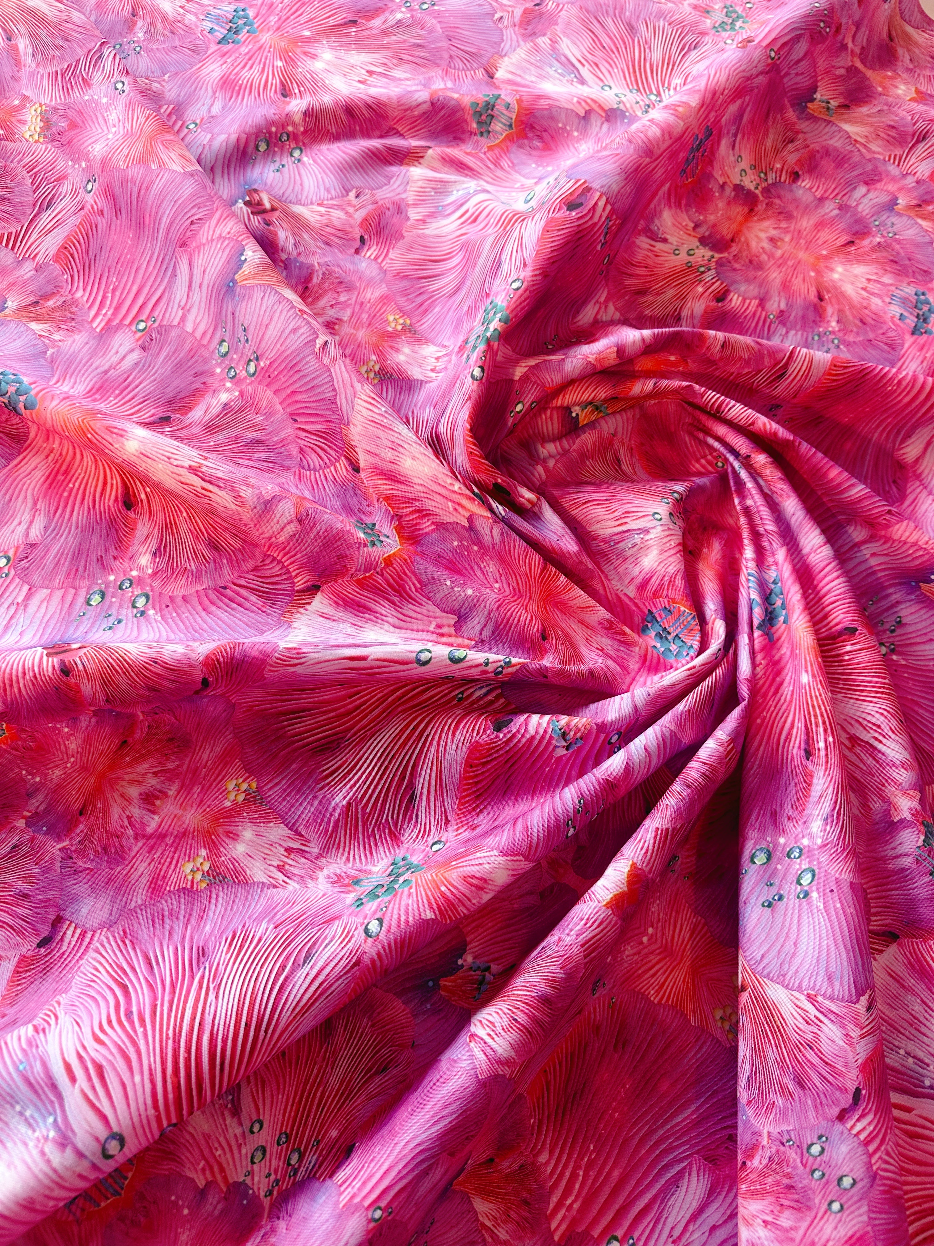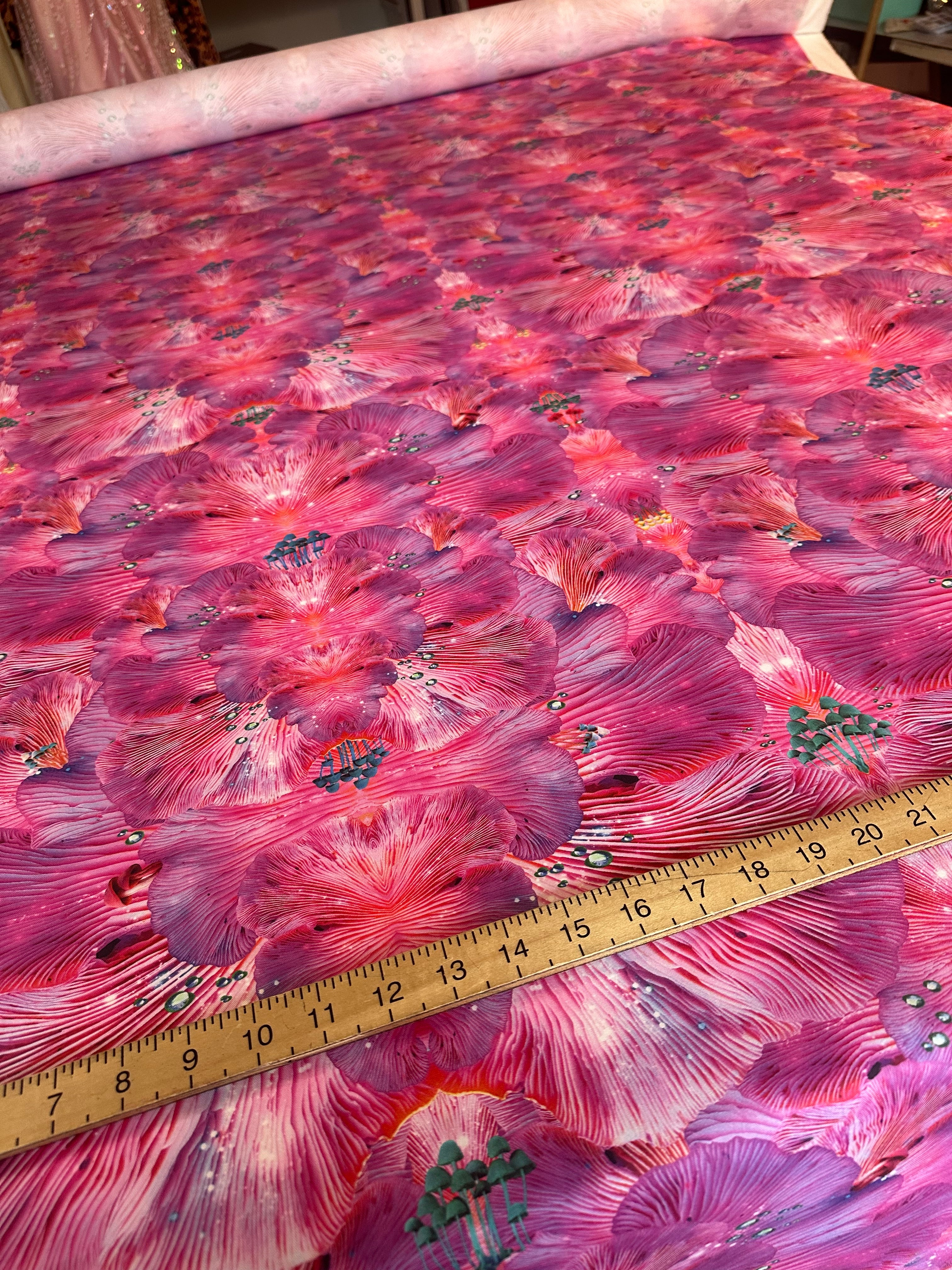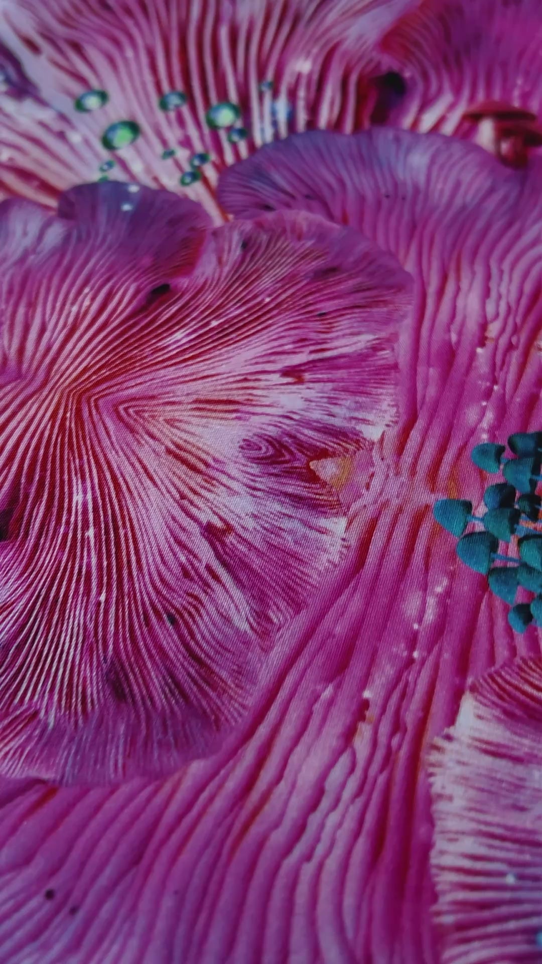 The design is created from photographs that Louise took of the underneath of oyster mushrooms she found in a forest near Berlin and transformed it into this psychedelic repeat pattern.