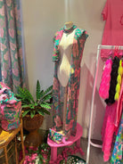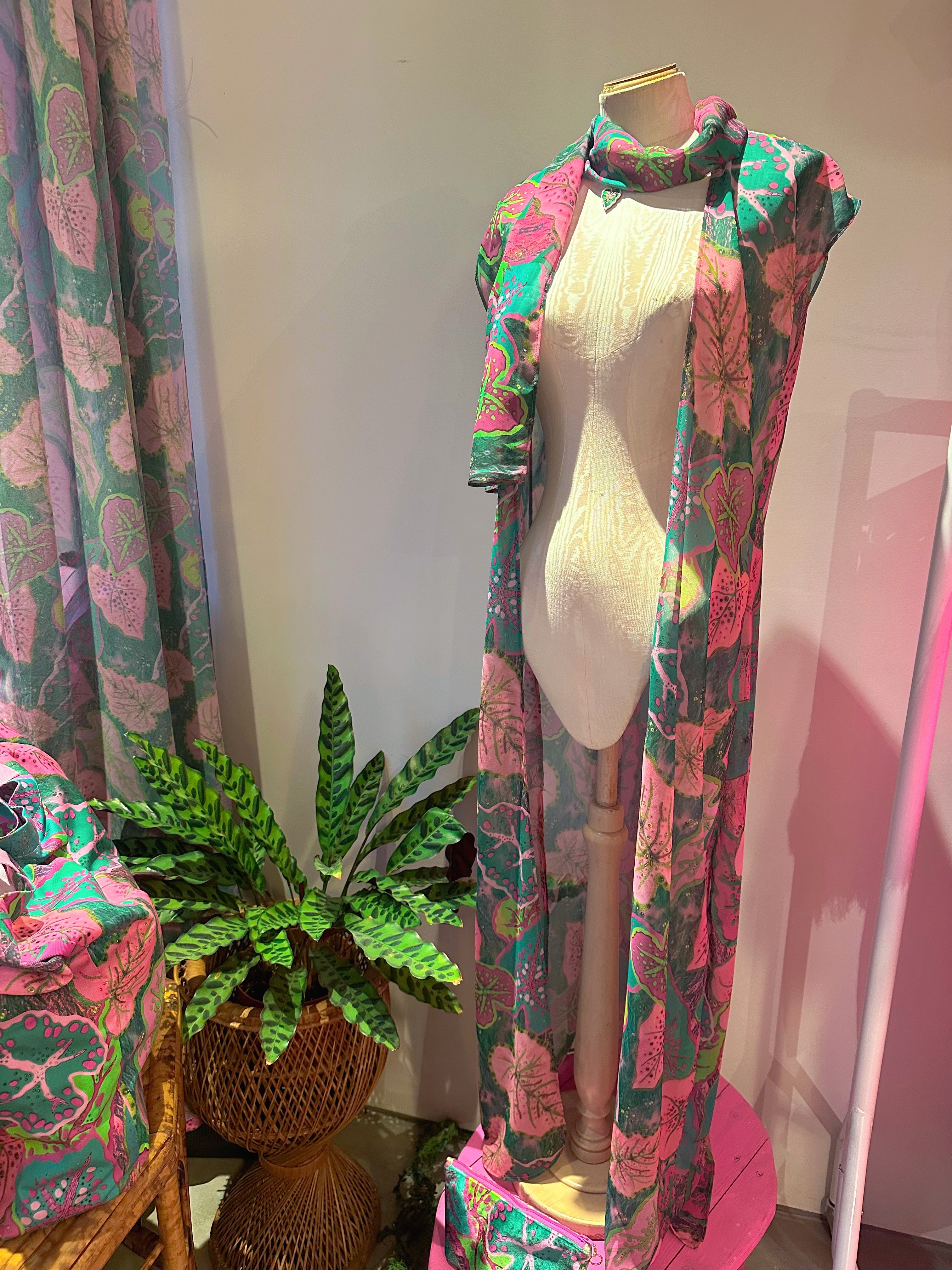 • Made with our luxuriously light and floaty georgette which has been printed to the highest quality with our vibrant green and fuchsia leafy pattern, Cala Elysium.