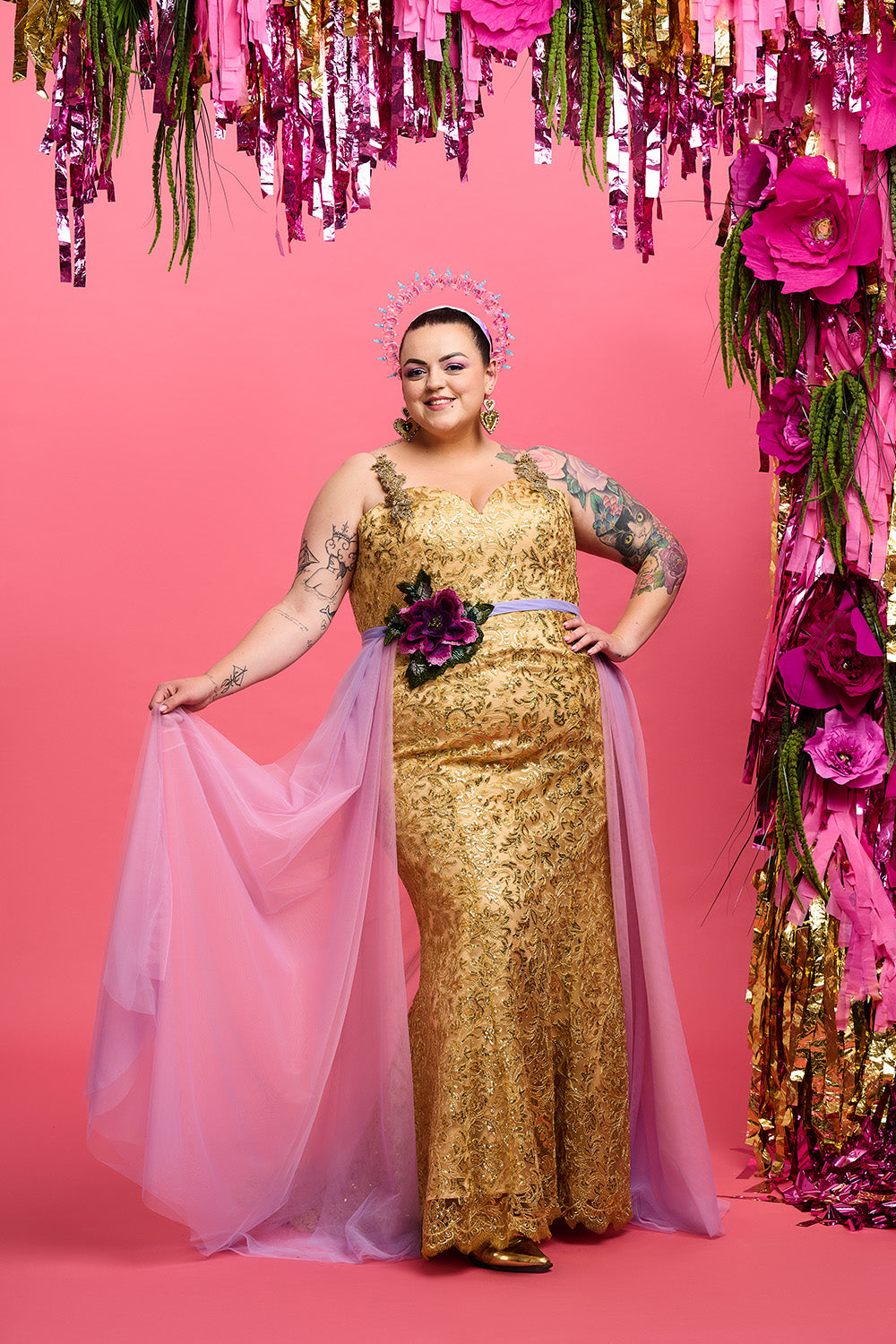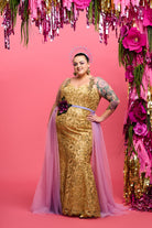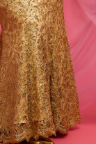 Crafted to flatter all sizes, this gown features a base of sumptuous gold satin adorned with a layer of intricately sequinned golden-threaded lace. Delicately embroidered with swirling floral and leaf motifs, it creates a mesmerising tapestry of beauty.