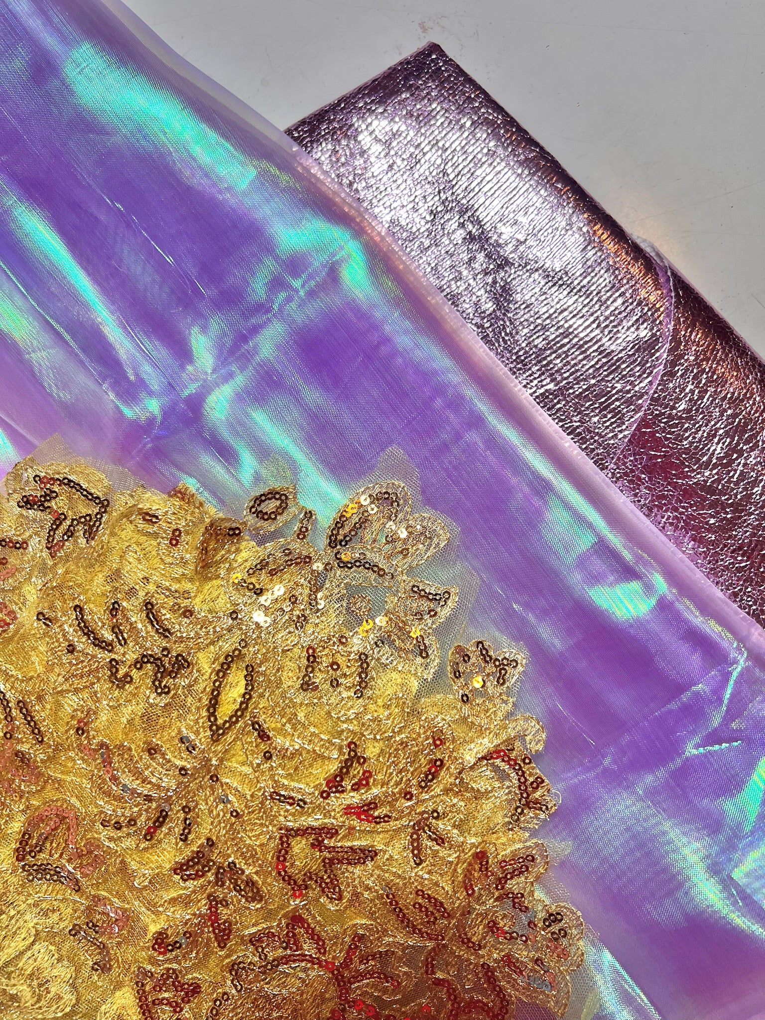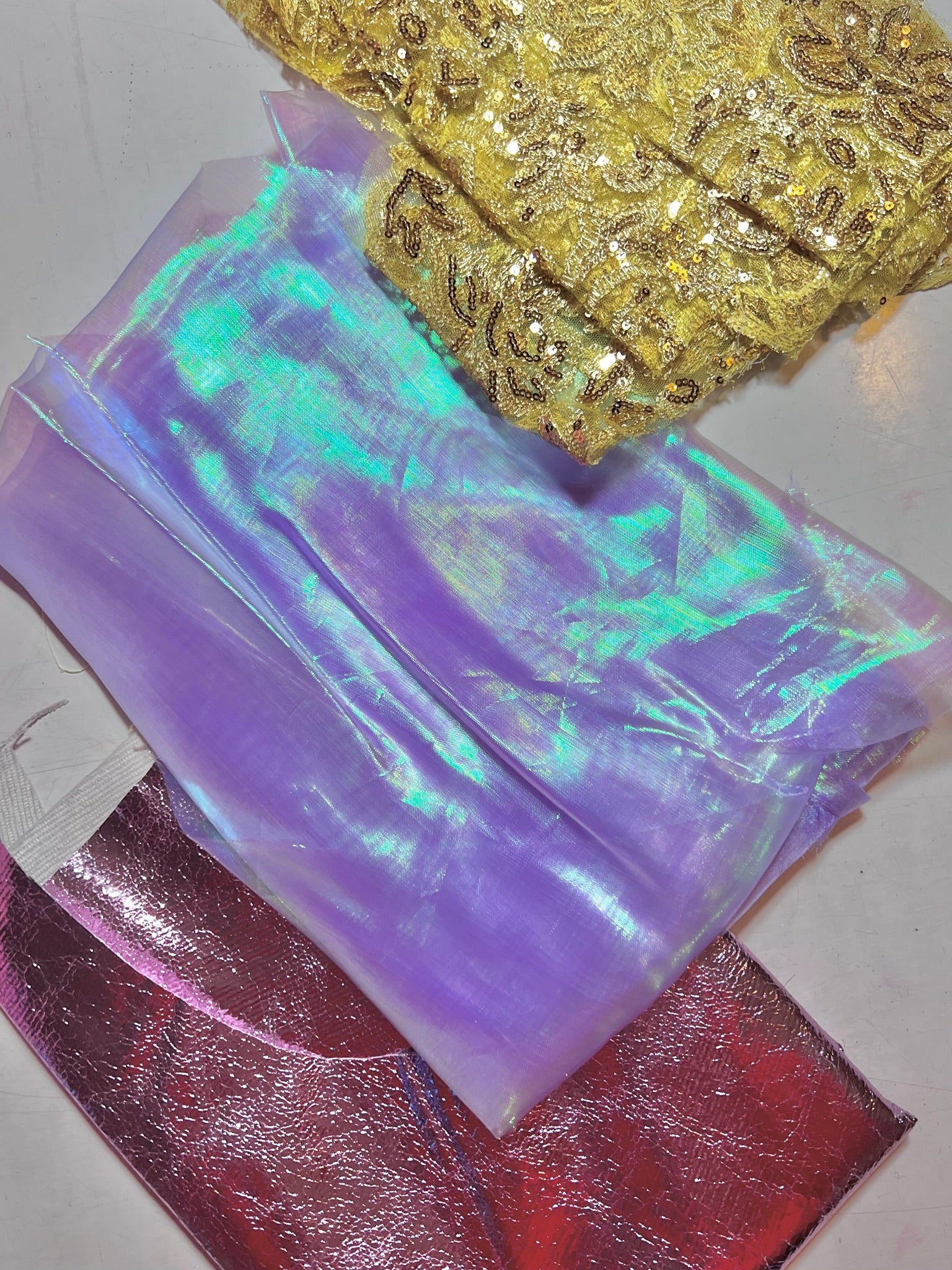 Three fabrics, small scraps, good for costumes, headdresses etc