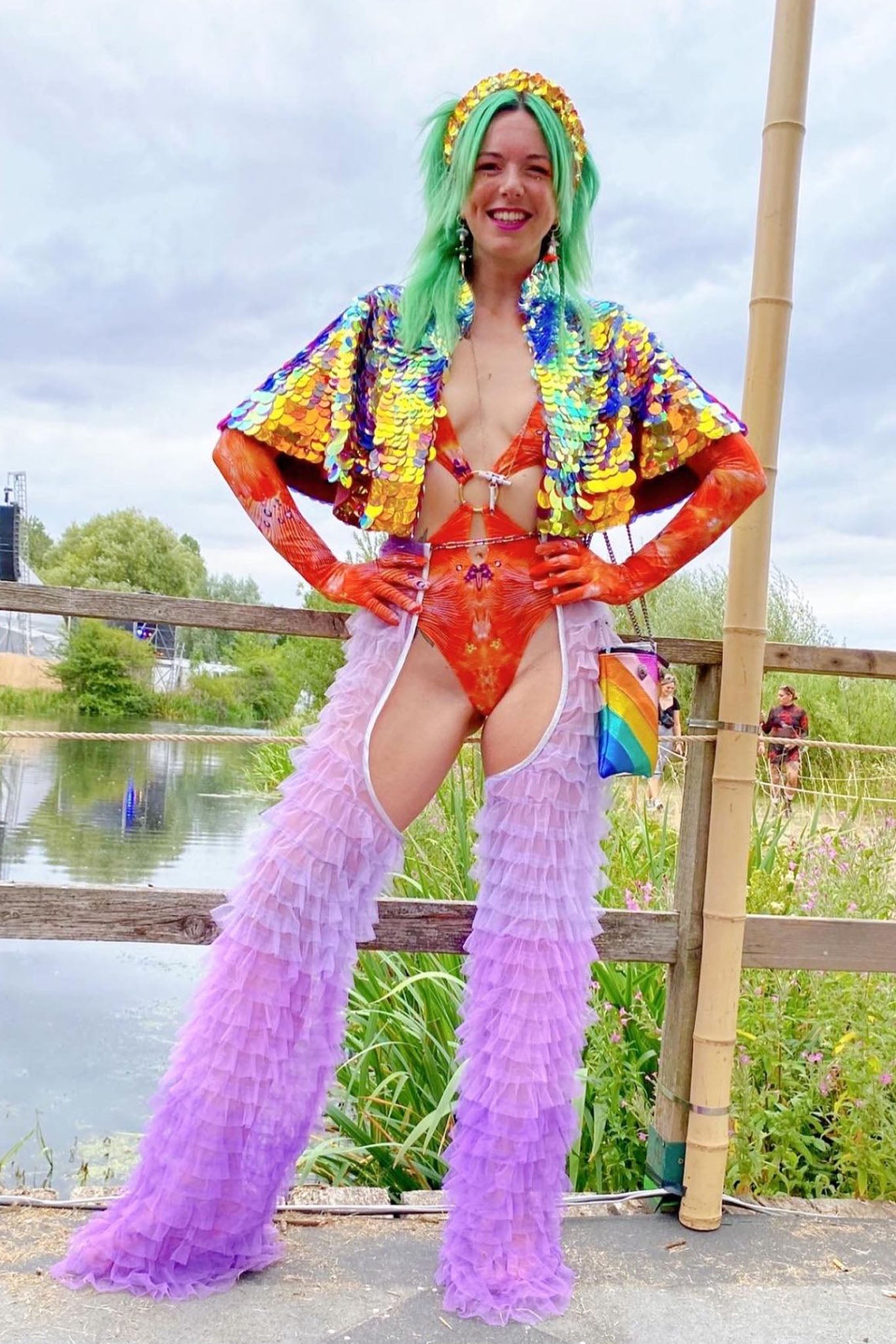 Louise usa los tipos en capas con el mono naranja recortado , guantes a juego y diadema de lentejuelas doradas.