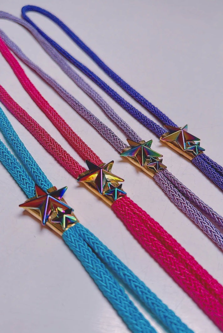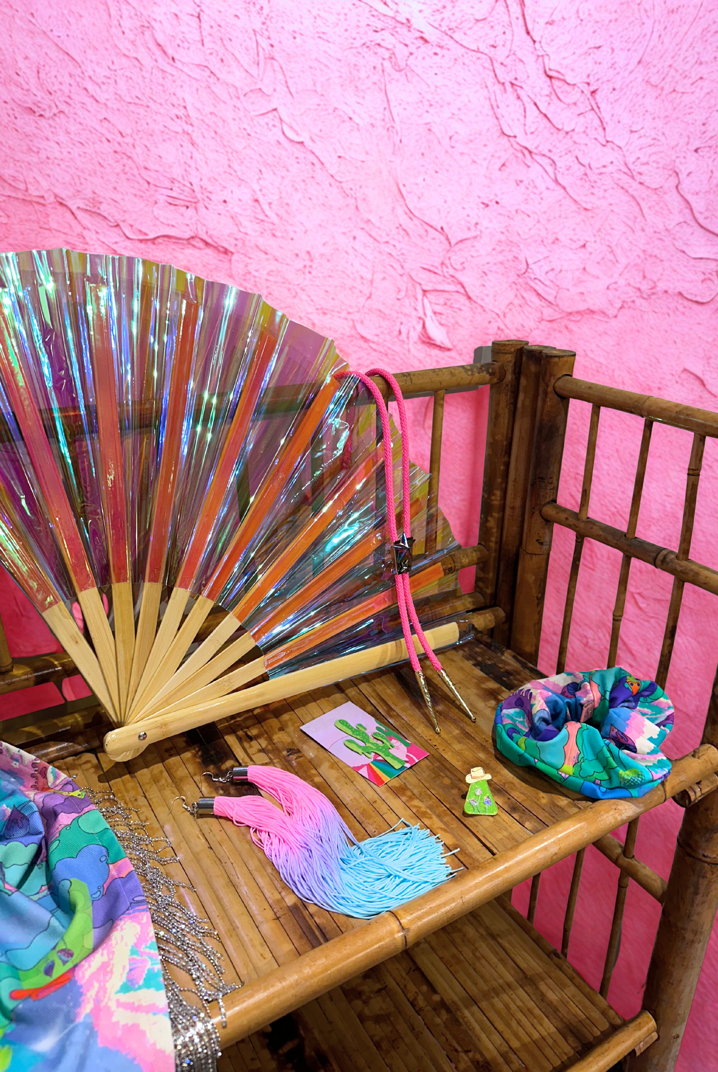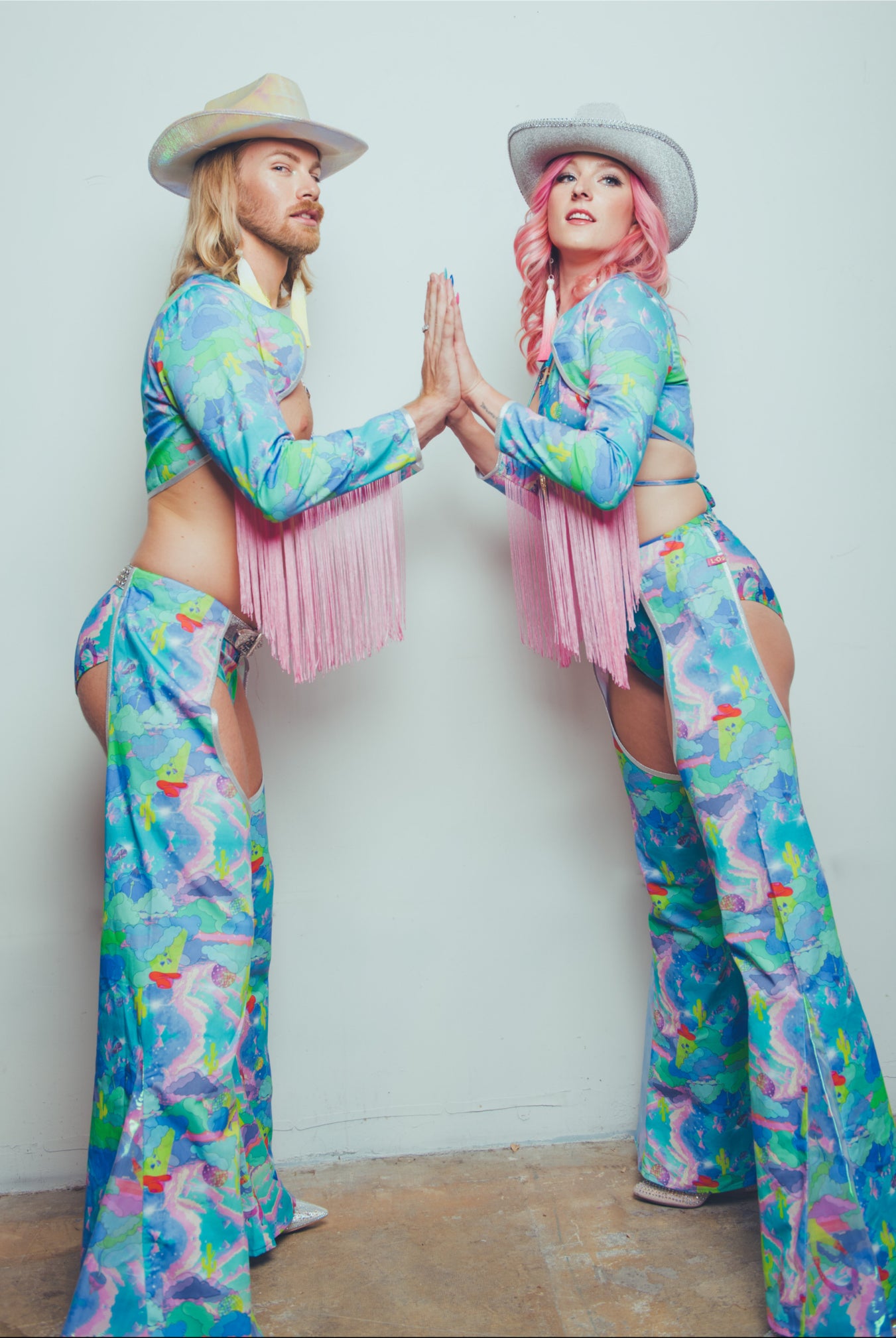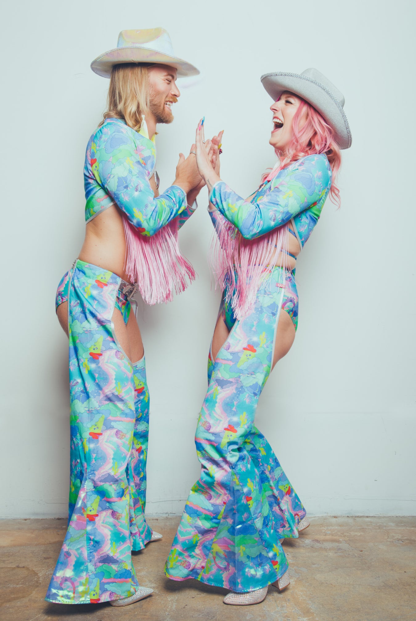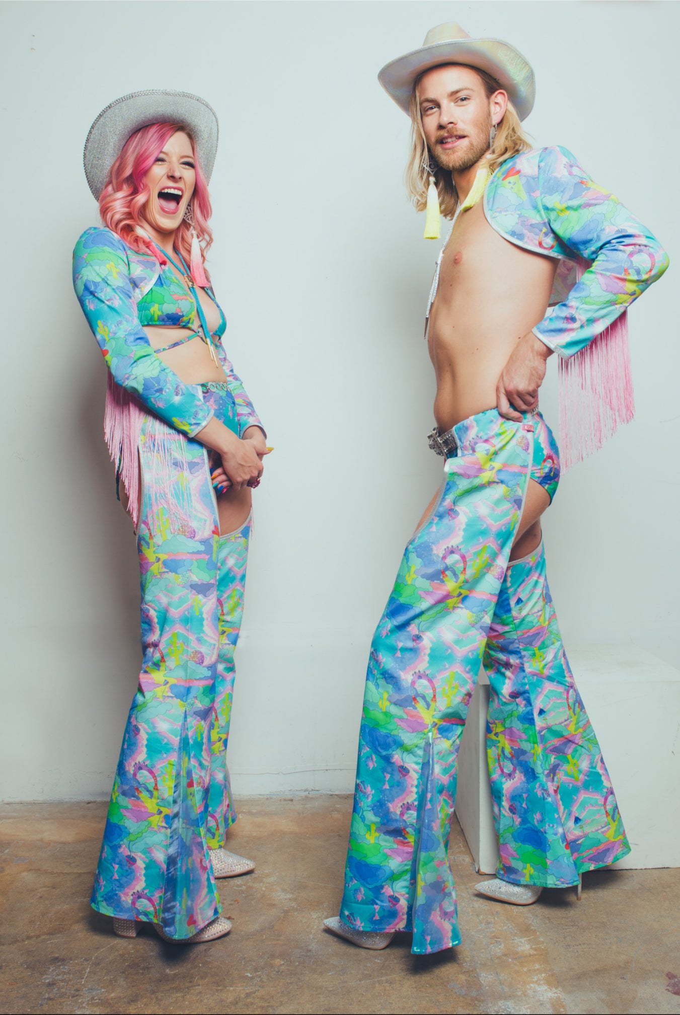 Los tonos iridiscentes intergalácticos acompañan a nuestras nuevas piezas inspiradas en Rodeo, que incluyen chaparreras, pañuelos forrados con diamantes y fundas para abanicos, entre las nuevas incorporaciones.