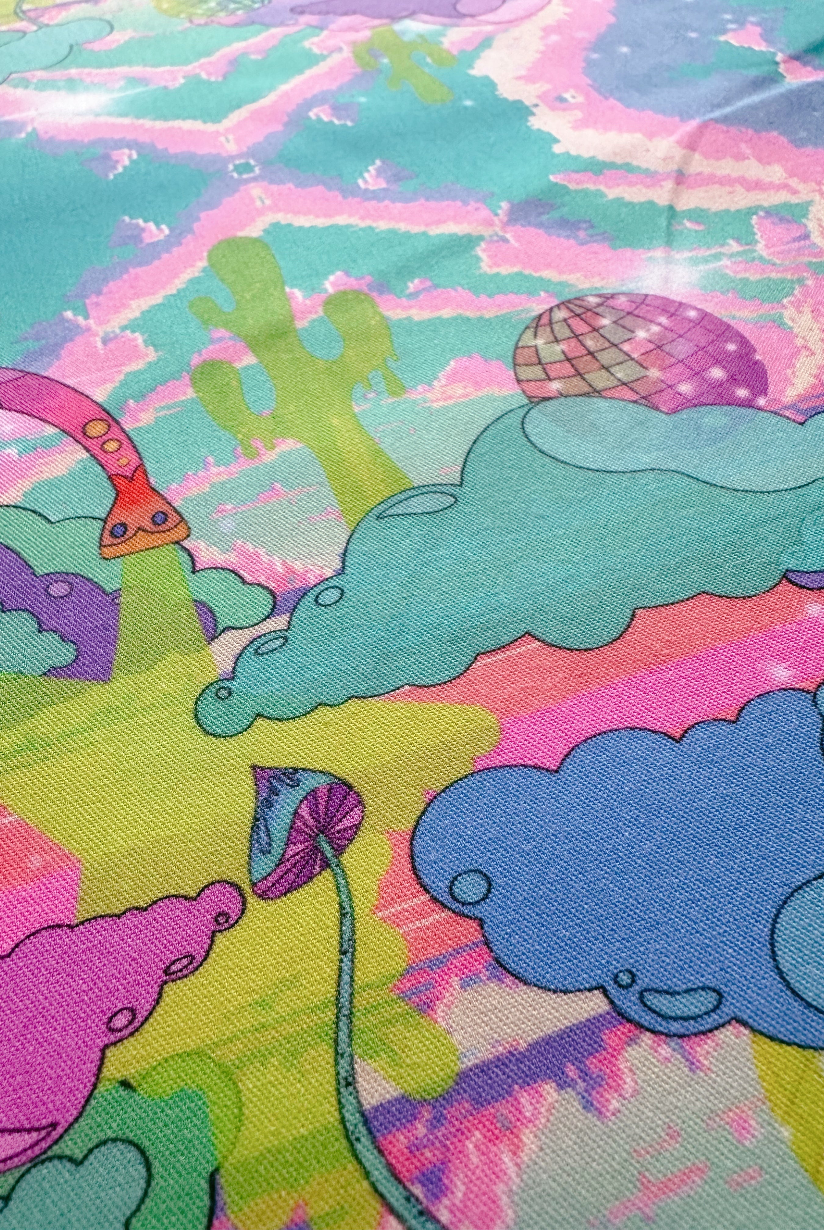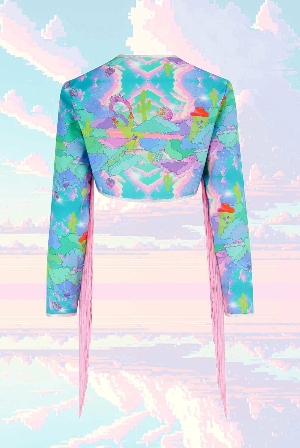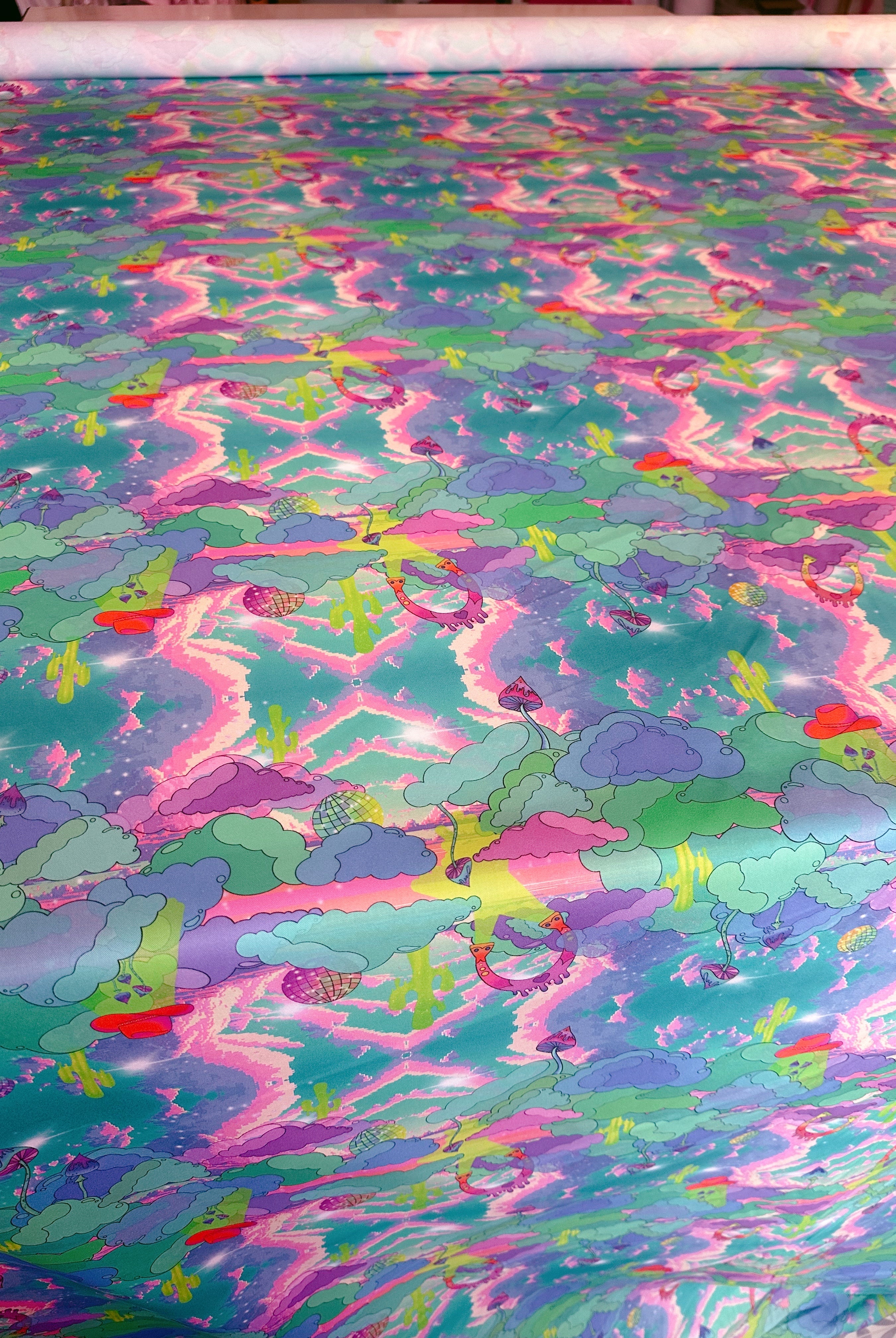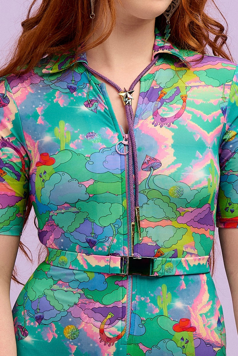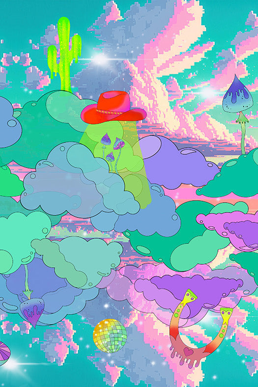 Con un diseño de impresión inspirado en carteles psicodélicos de la década de 1970, horizontes distorsionados y escenas de películas de vaqueros, puedes ver cactus derritiéndose, herraduras voladoras y ovnis con sombrero de vaquero lanzando hongos mágicos al espacio exterior.