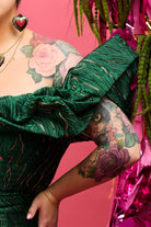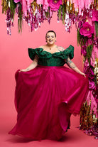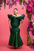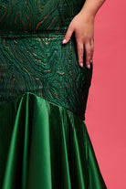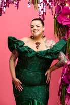 The off-the-shoulder bodice, delicately boned with spiral steels, ensures a flattering silhouette while providing comfortable support. Its gracefully draped wrap-around shoulders feature hidden covered elastic for added ease of movement, and the figure-hugging mermaid-style skirt with beaded fringe detail effortlessly complements your natural curves.