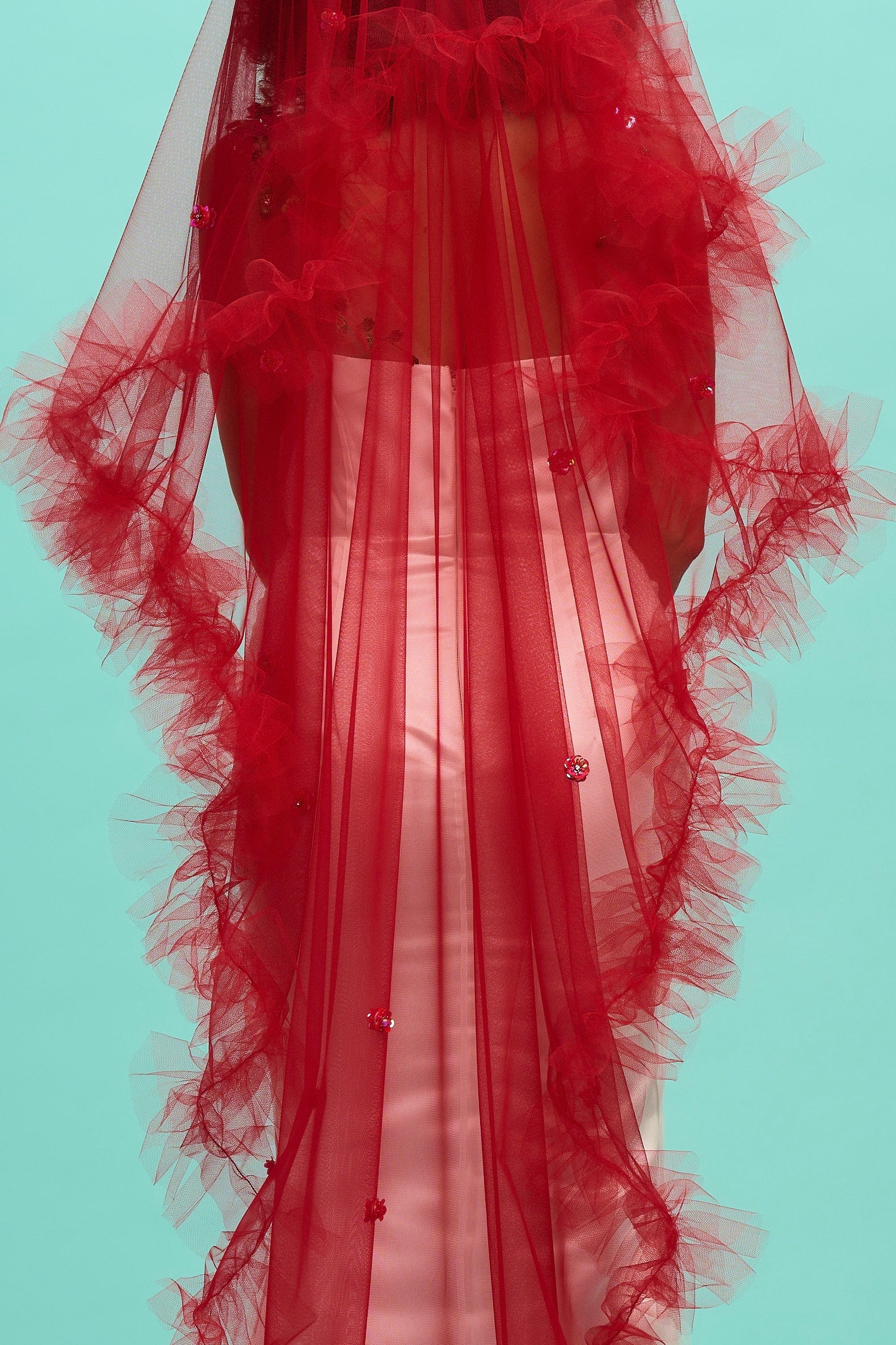 Crafted with the softest tulle, this veil is as dreamy as it is dramatic. Adorned with gathered tulle frill edges and embellished with sequin motifs throughout, it exudes an air of whimsical elegance with a playful twist.