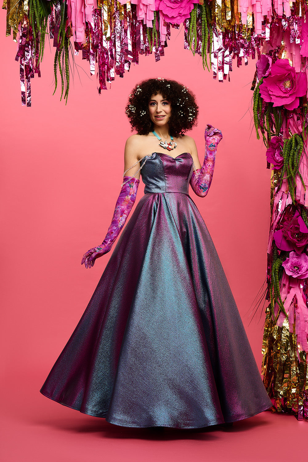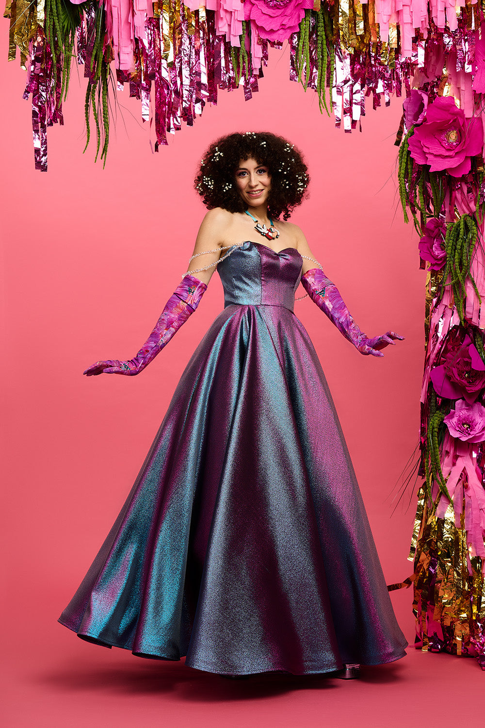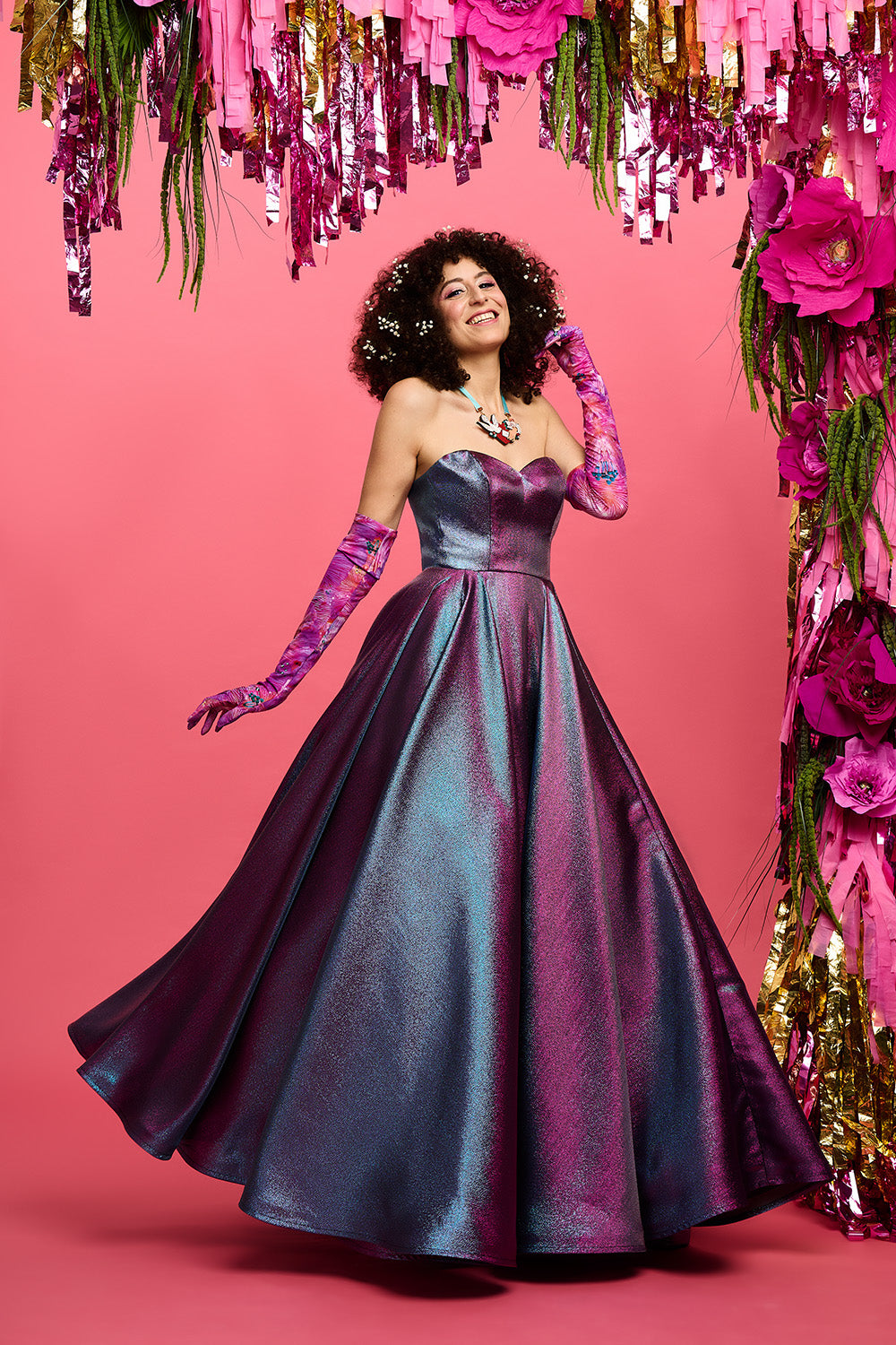 Named after my gorgeous friend who modelled in our studio shoot, the Sophia gowns main attraction is the mesmerising fabric—a shimmering symphony of turquoise and fuchsia hues that exudes unparalleled allure. To showcase this exquisite material to its fullest potential, the gown features 1.5 circle skirts, allowing metres of fabric to flow gracefully and beautifully with every movement - just wait til you get this piece on the dancefloor!
