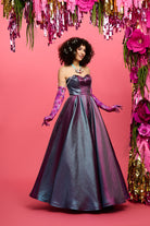 For an added touch, the gown offers the option of a string of crystals cascading from the bodice, delicately wrapping around the arms. These iridescent tones reflect the shades in the fabric, adding an extra layer of enchantment to an already stunning piece.
