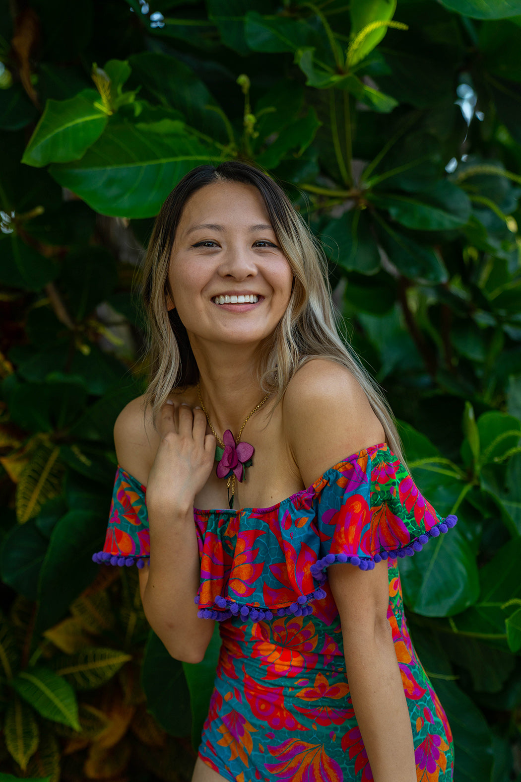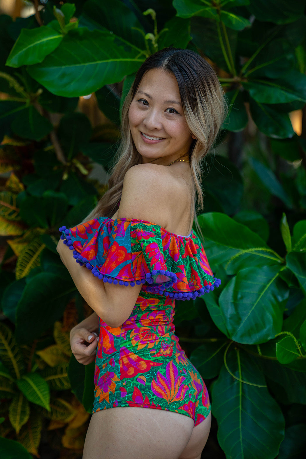 • Volante Bardot con hombros descubiertos y pompones morados: ¡personaliza el color a continuación!