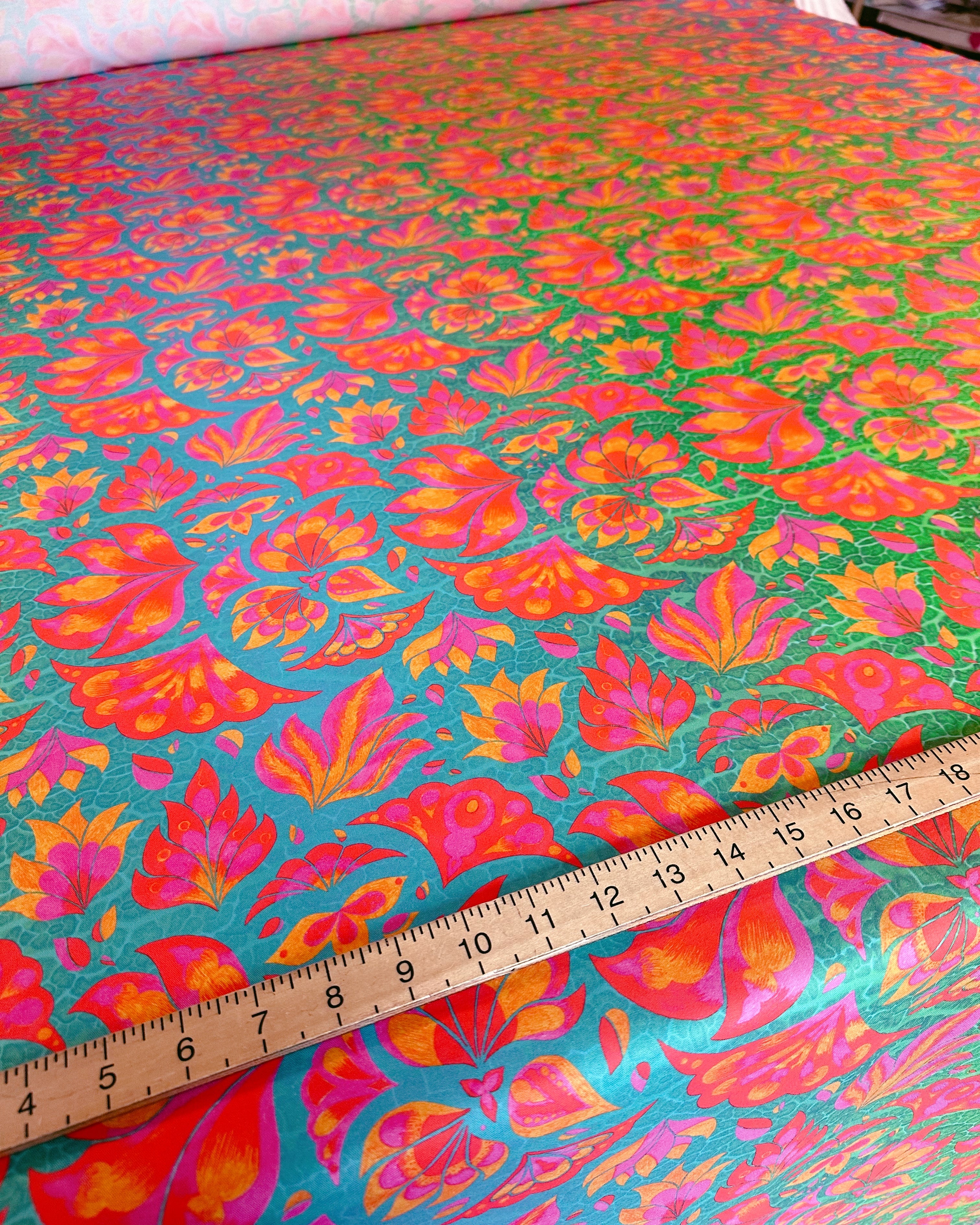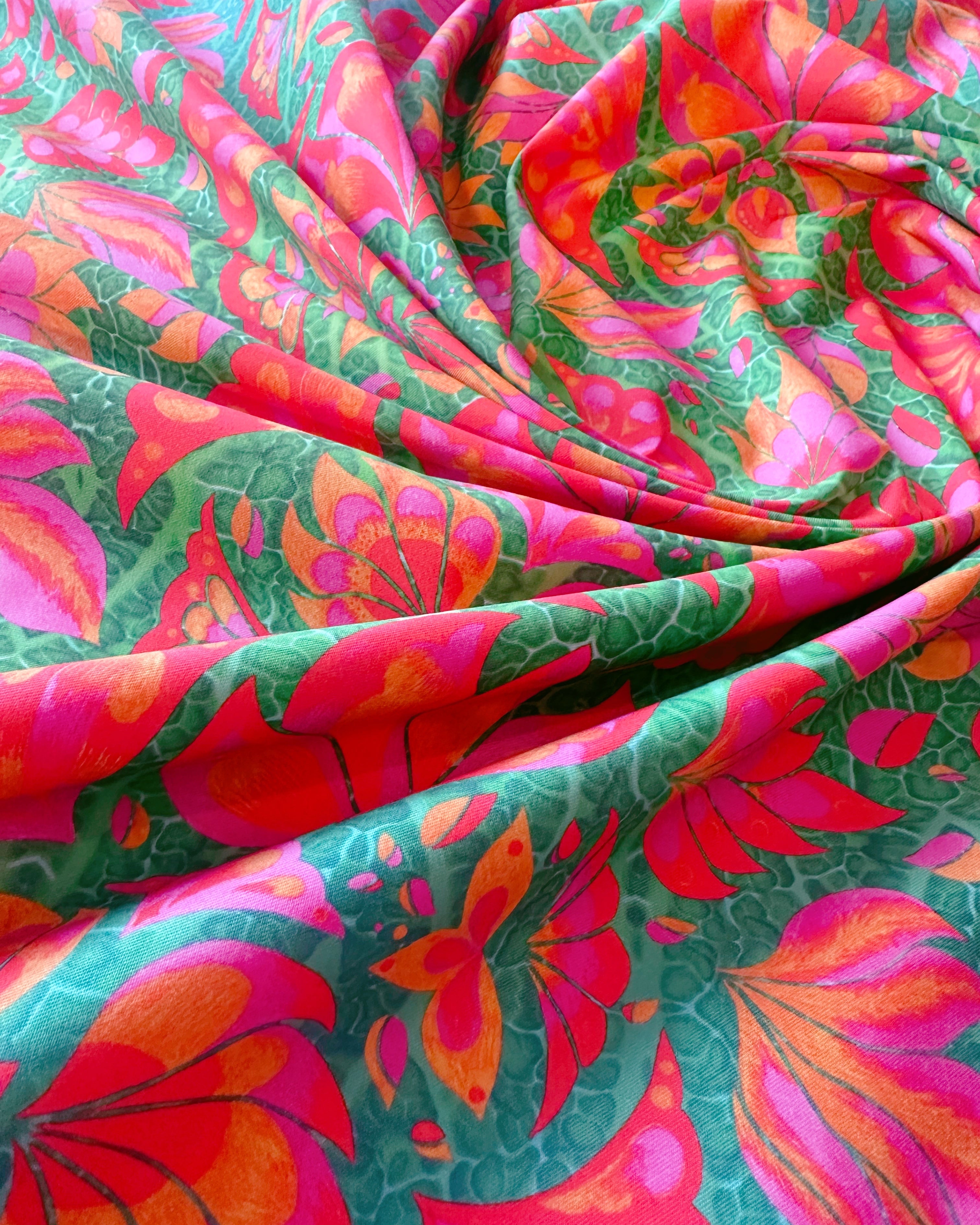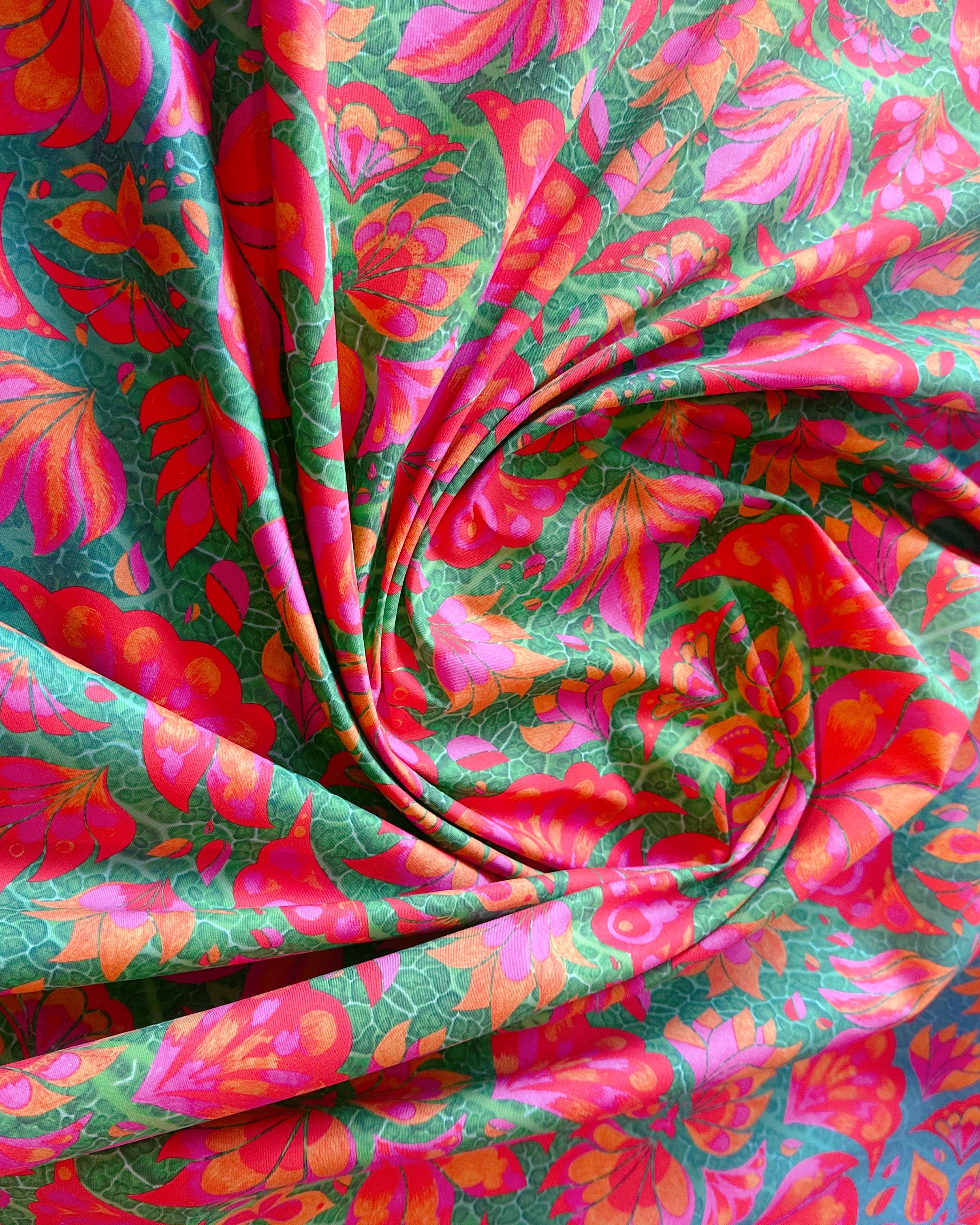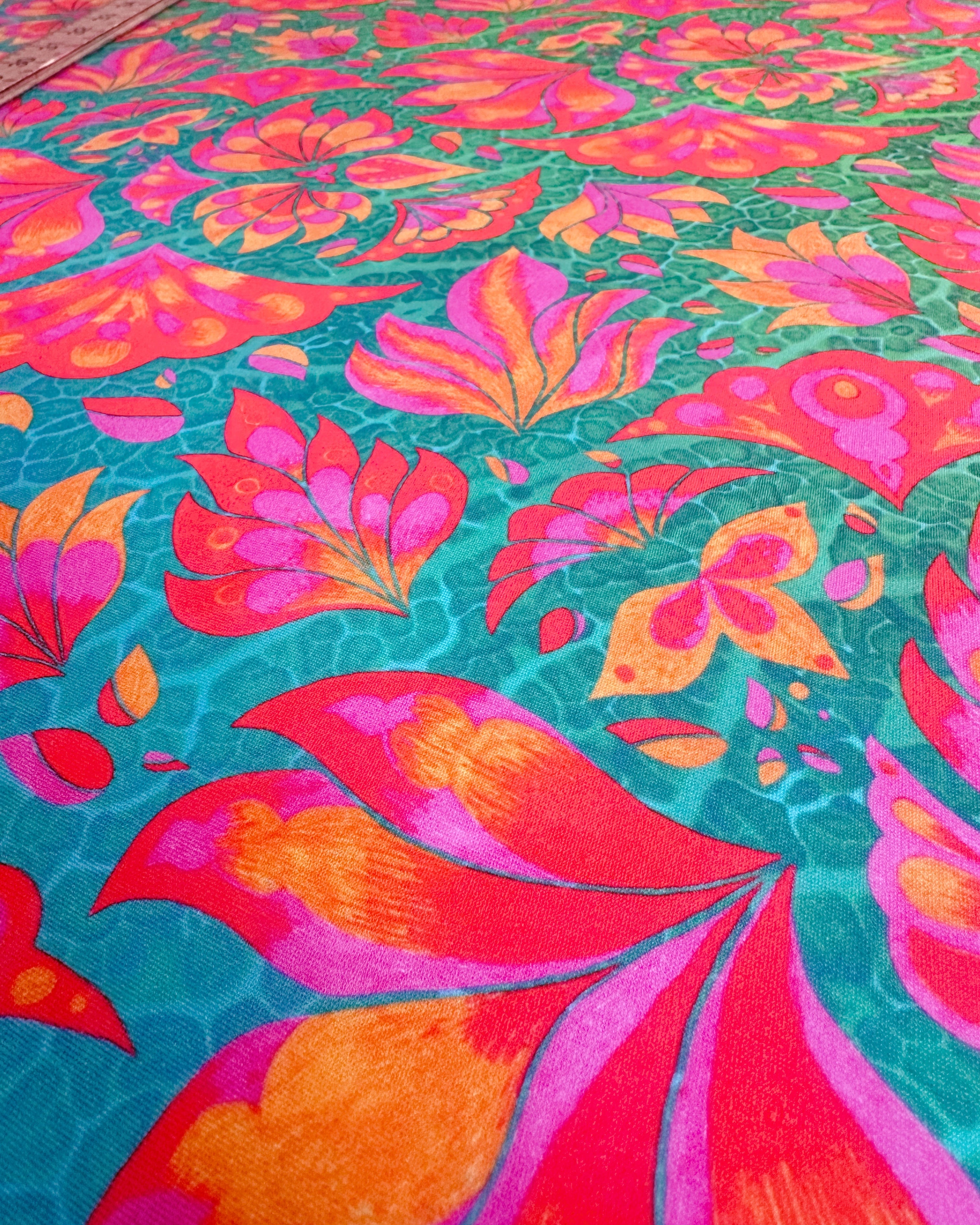 What makes Vendala truly unique is its layered depth. A mirrored macro image of a leaf was added behind the hand-drawn elements, while a subtle ombré turquoise gradient flows through the print, making the Vendala design perfect for creating stunning two-tone outfits.