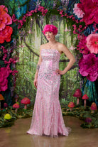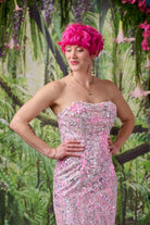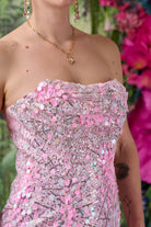 Crafted from ivory tulle densely embellished with baby pink, white and iridescent sequins, the gown glimmers with every movement. Beneath the embellished tulle sits a satin base layer that subtly blushes through the fabric, giving the dress its soft pink glow.