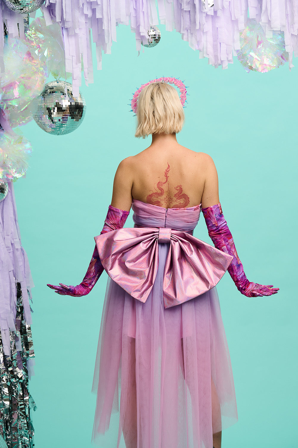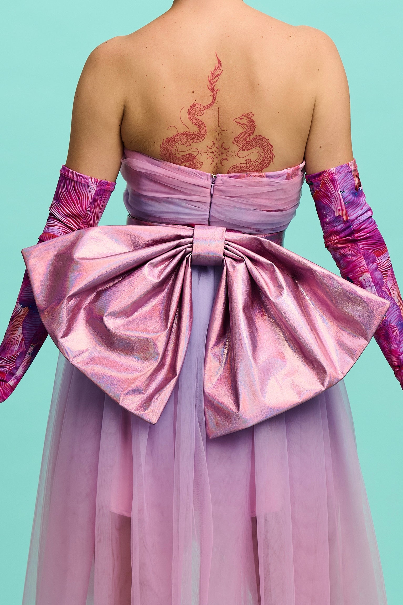 Make a bold statement on your special day with this show-stopping metallic pink bow—it's the perfect finishing touch to your epic bridal outfit.