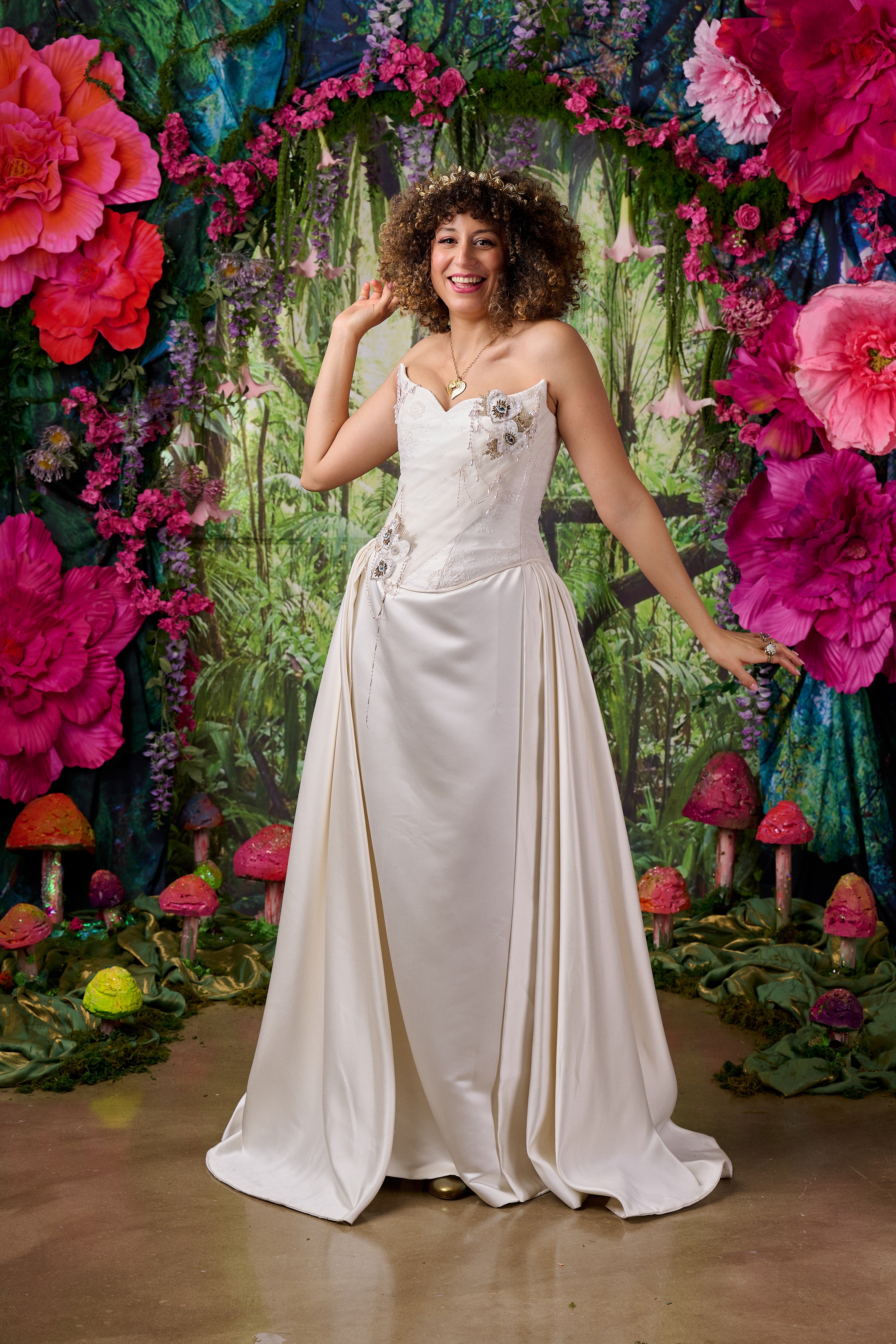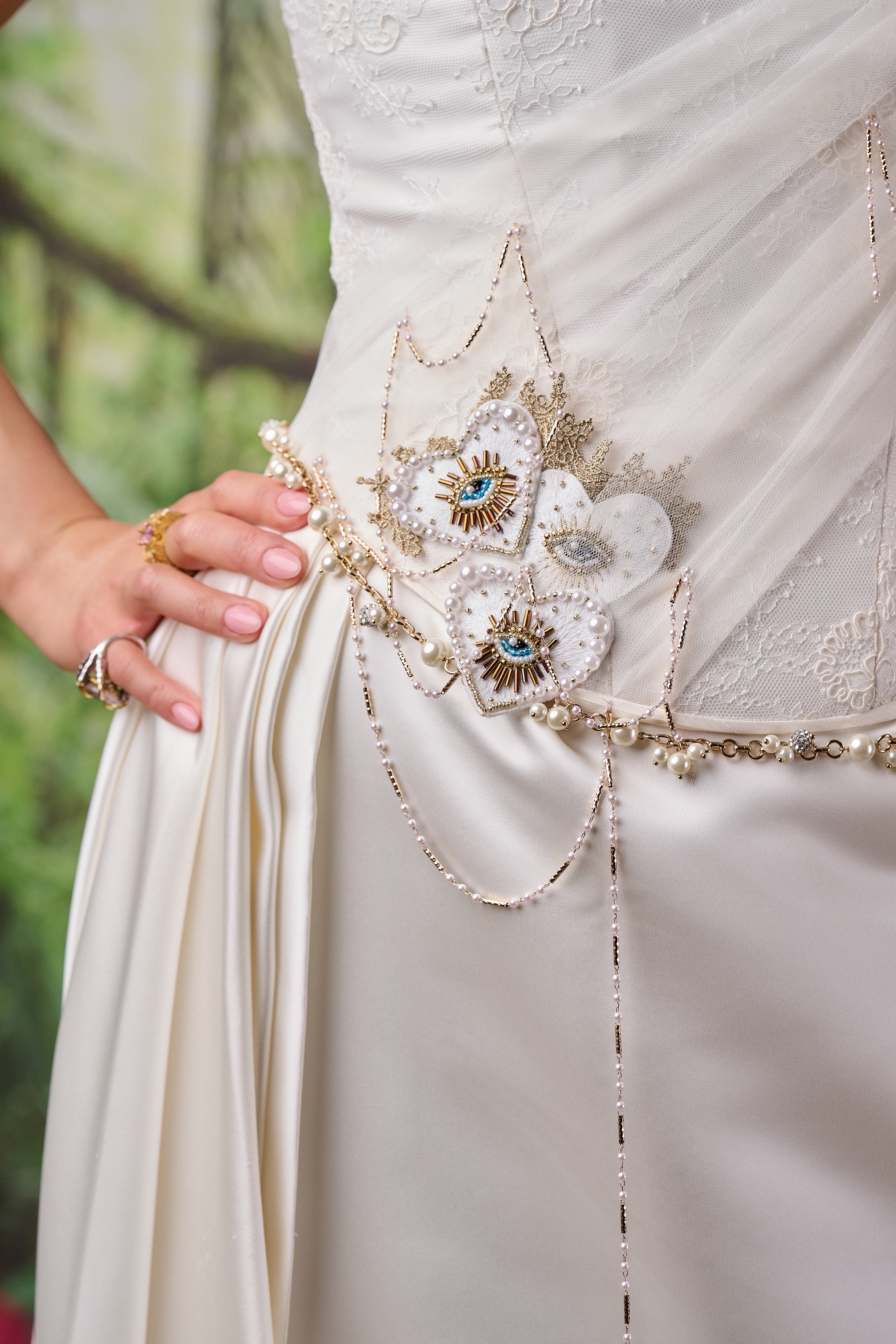 Intricate embellishment completes the design, featuring sacred heart motifs with gold and blue detailing, gold lace accents and delicate drips of faux pearls and chain that cascade across the bodice.