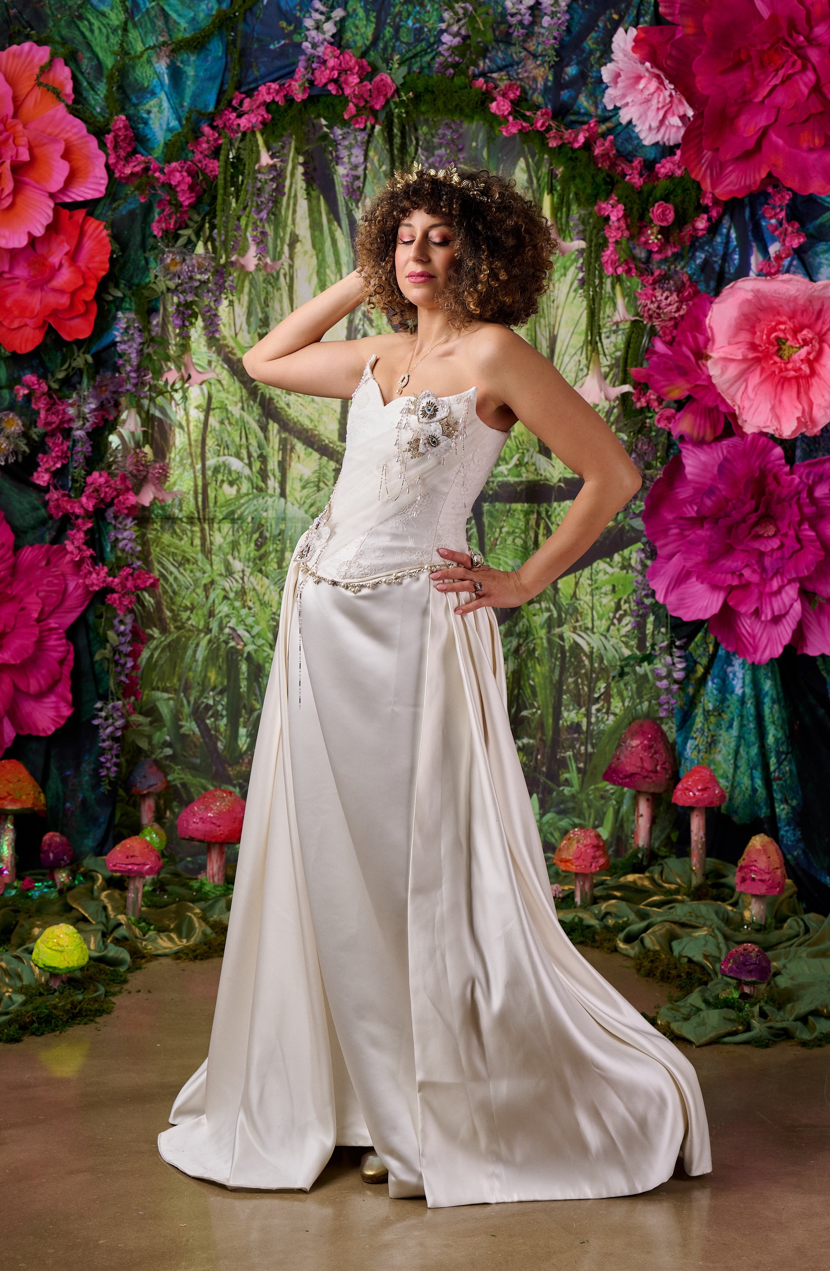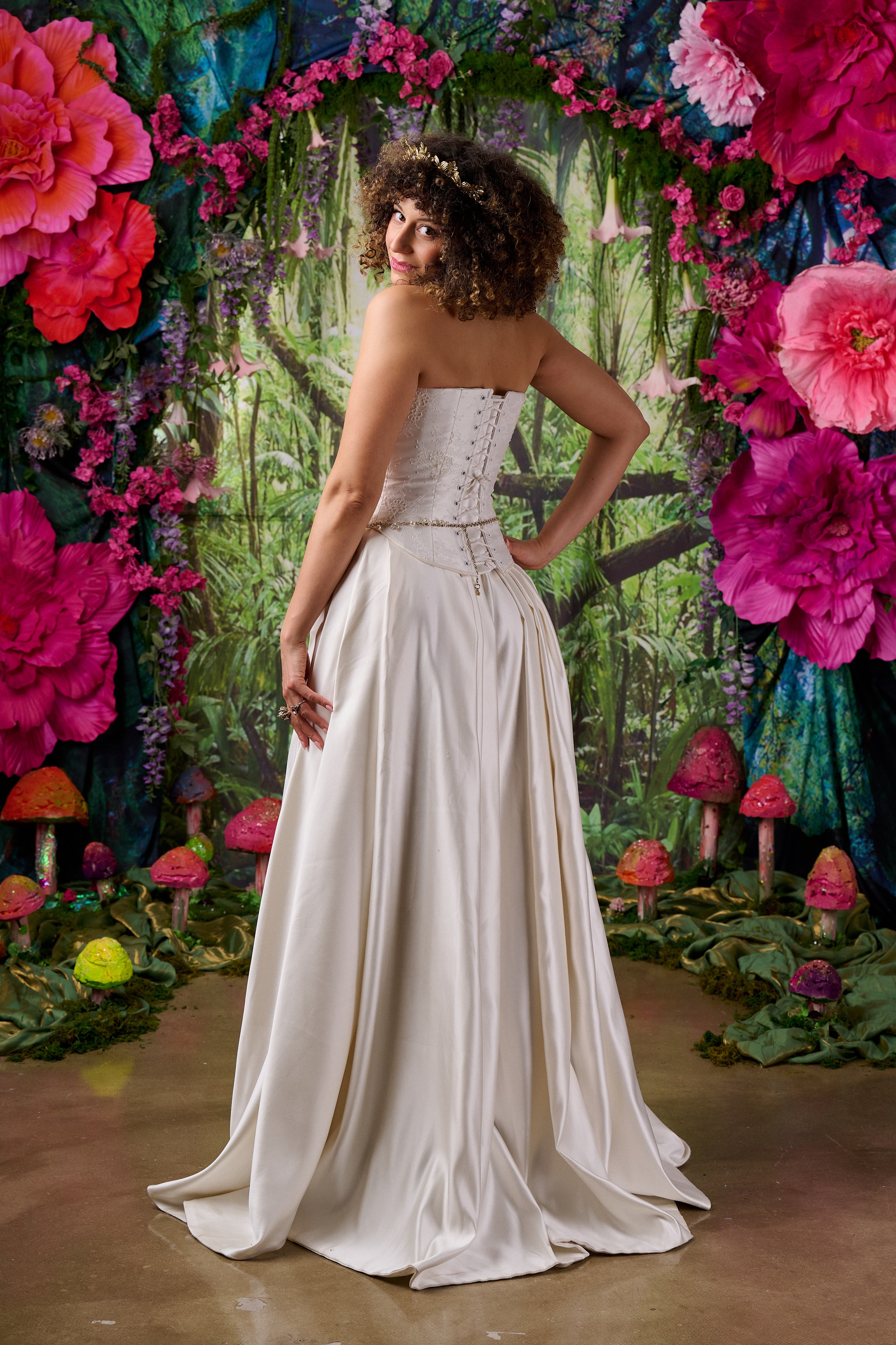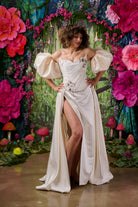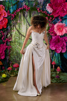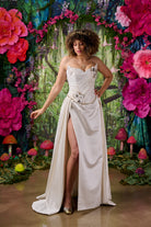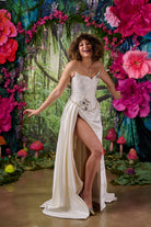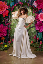 The Celine dress combines couture-level corsetry with the fluid drama of a sweeping satin skirt.