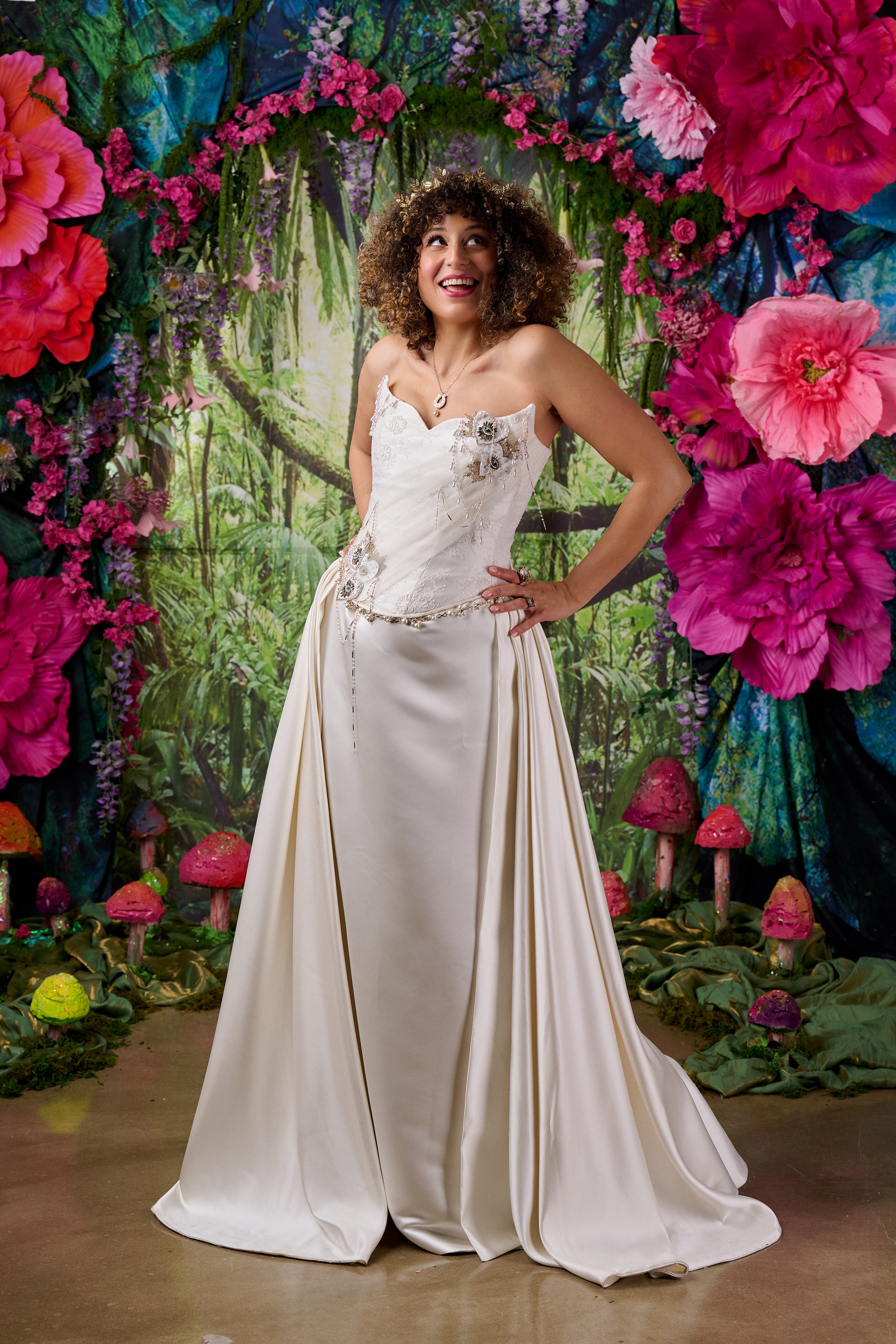 The look is paired with a spectacular fully boned steel corset, constructed from over 48 individually layered fabric panels. The corset is topped with delicate Chantilly lace and partially draped in pleated tulle, creating softness against the strong structure beneath.