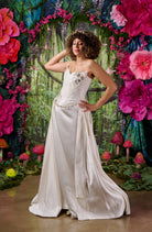 The skirt is crafted from over twelve metres of sumptuous satin, carefully pattern-cut so that the folds fall naturally around the body, creating elegant movement and volume. A high slit at the front adds a sense of drama and modernity, with the option to have this closed for a more traditional look.
