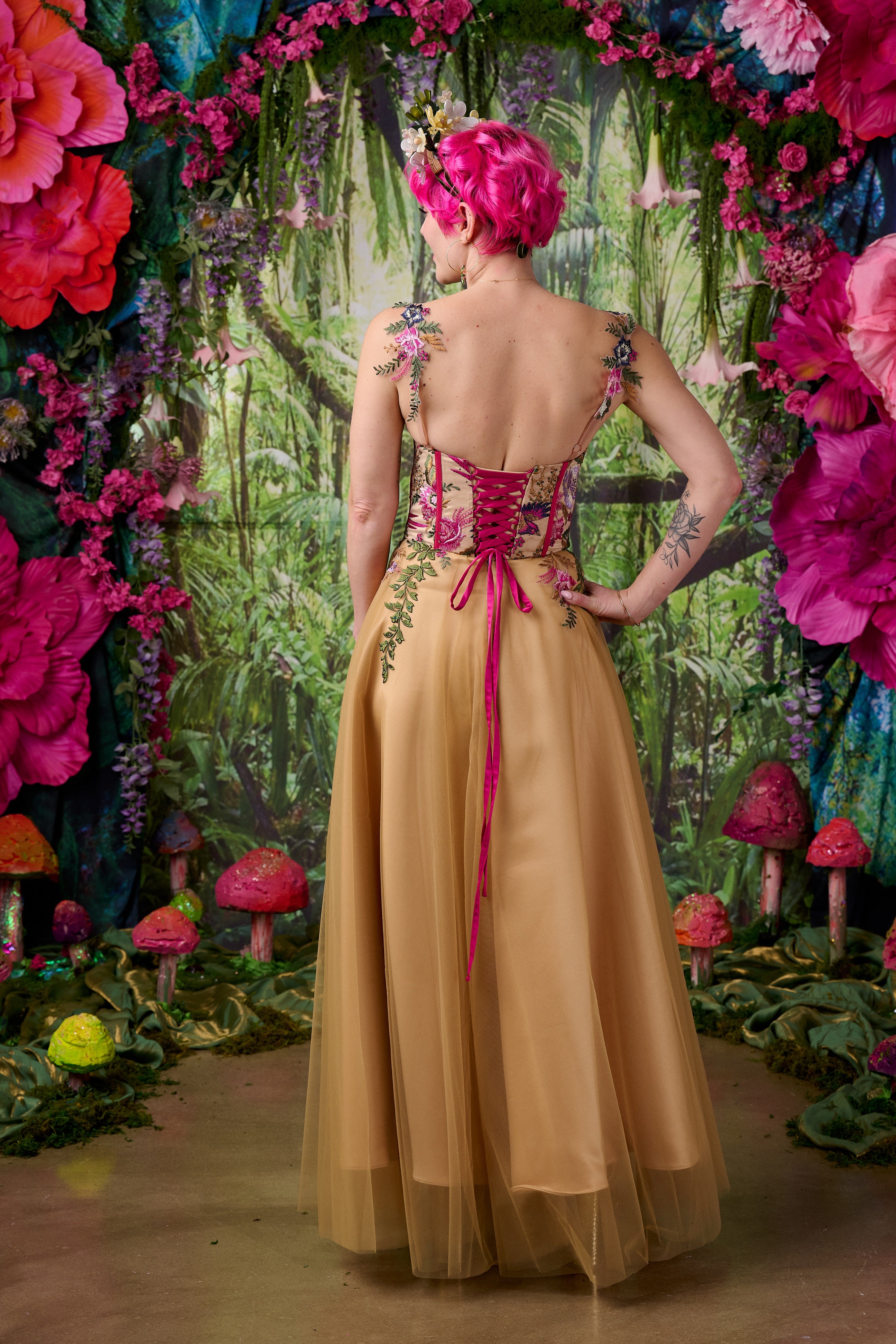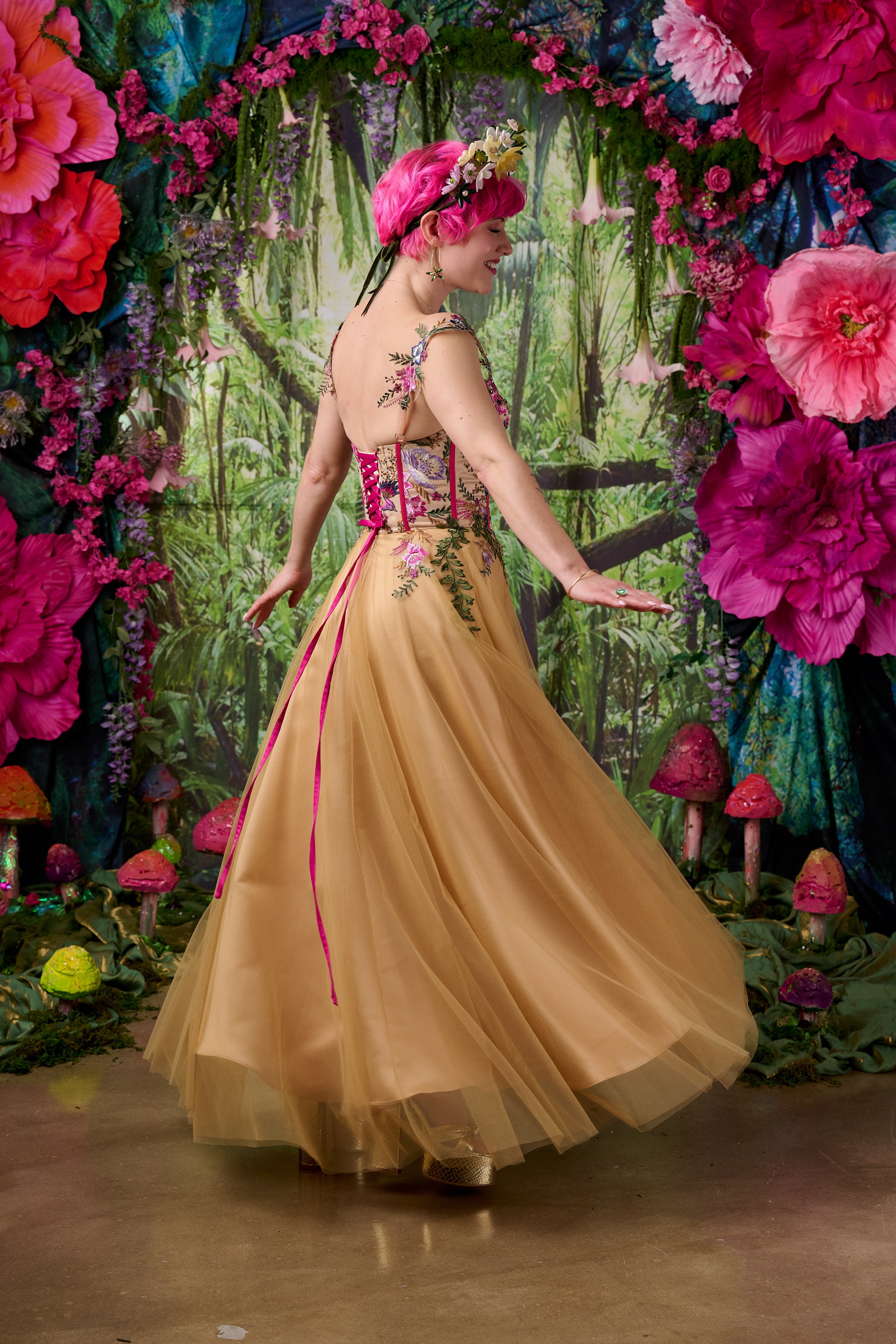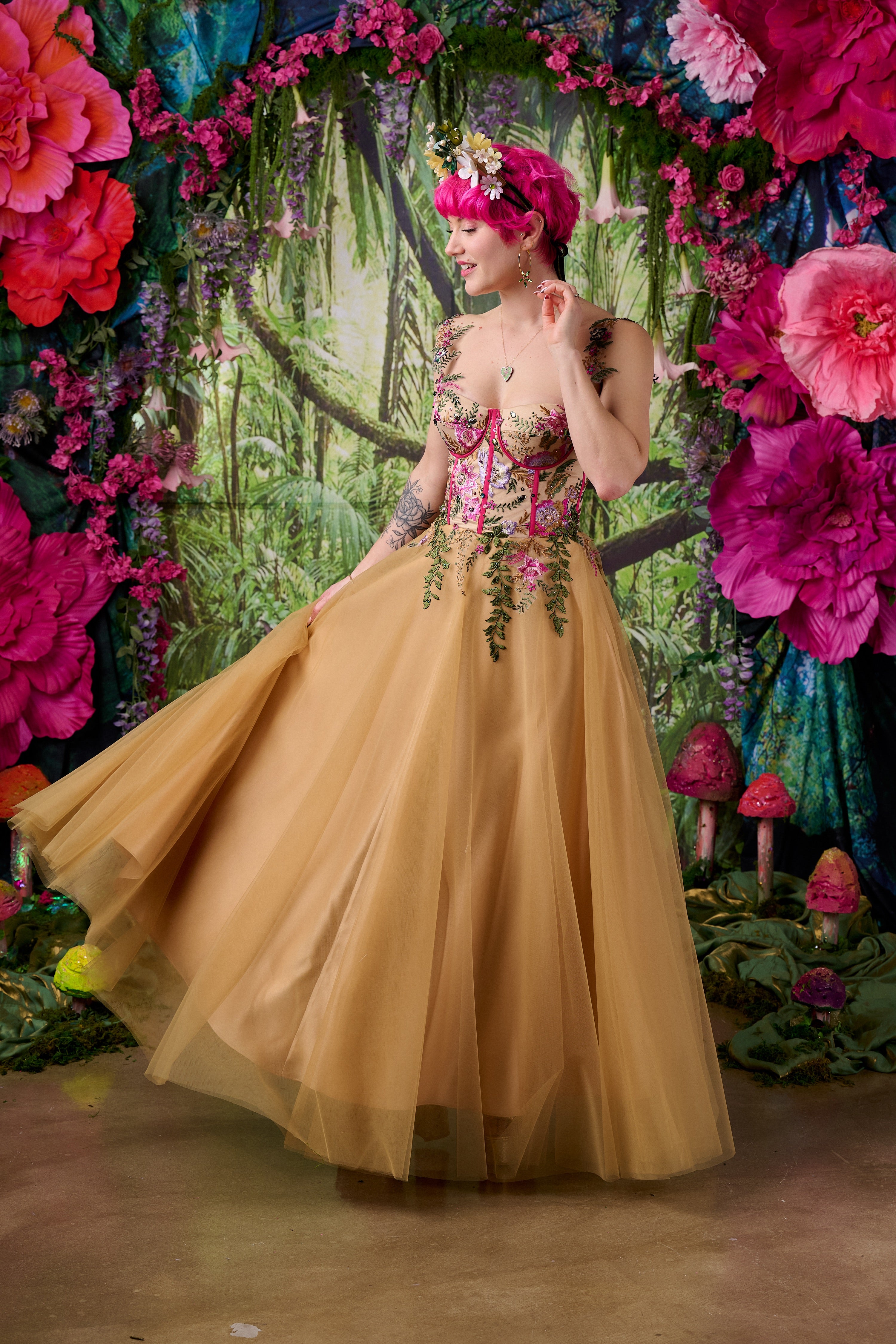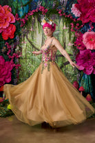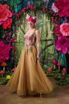 The skirt is formed from soft layers of golden tulle that float over a rich gold satin base, creating movement and depth as the fabric catches the light. The result is a warm, radiant glow that feels both dramatic and romantic.
