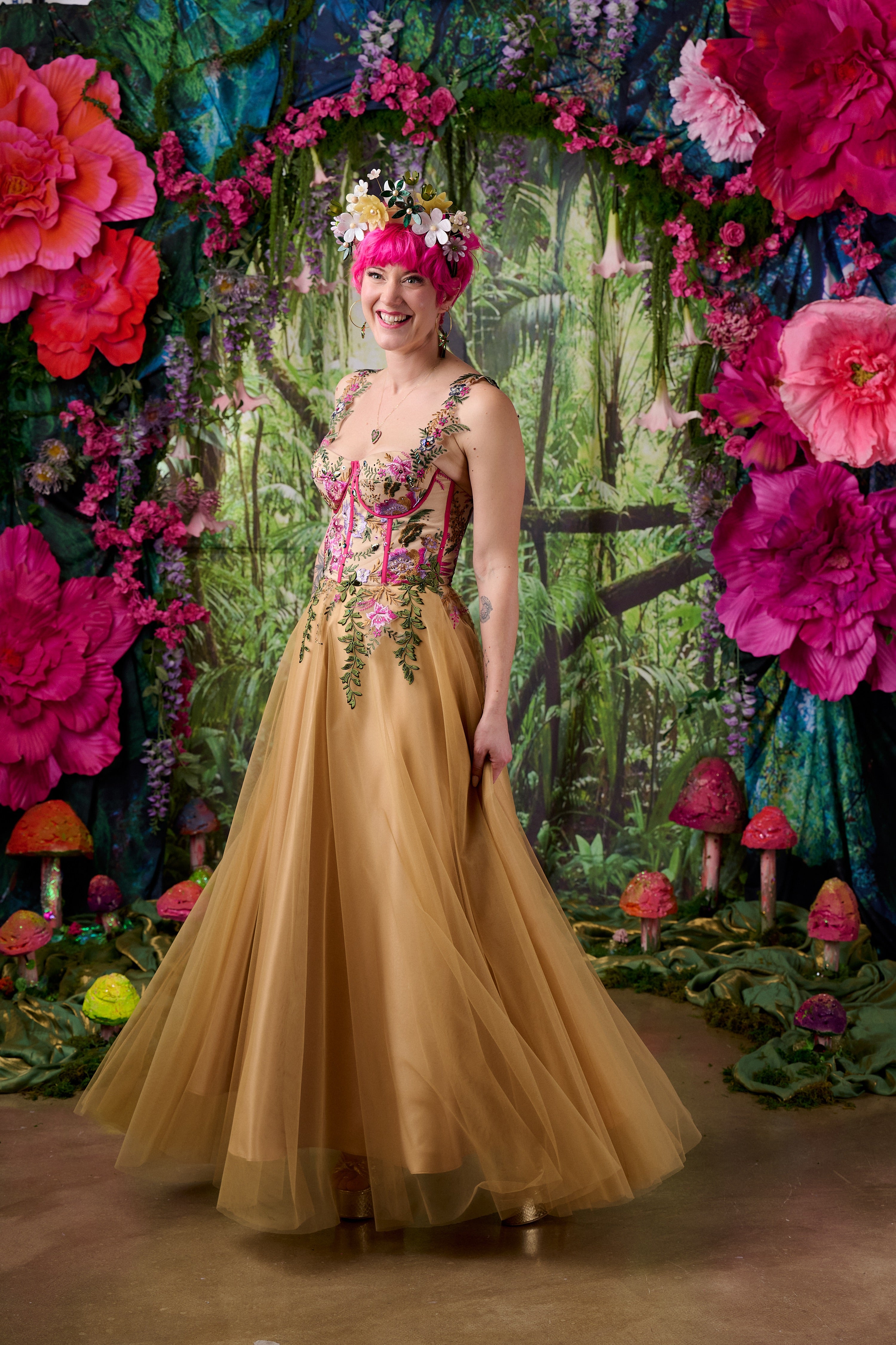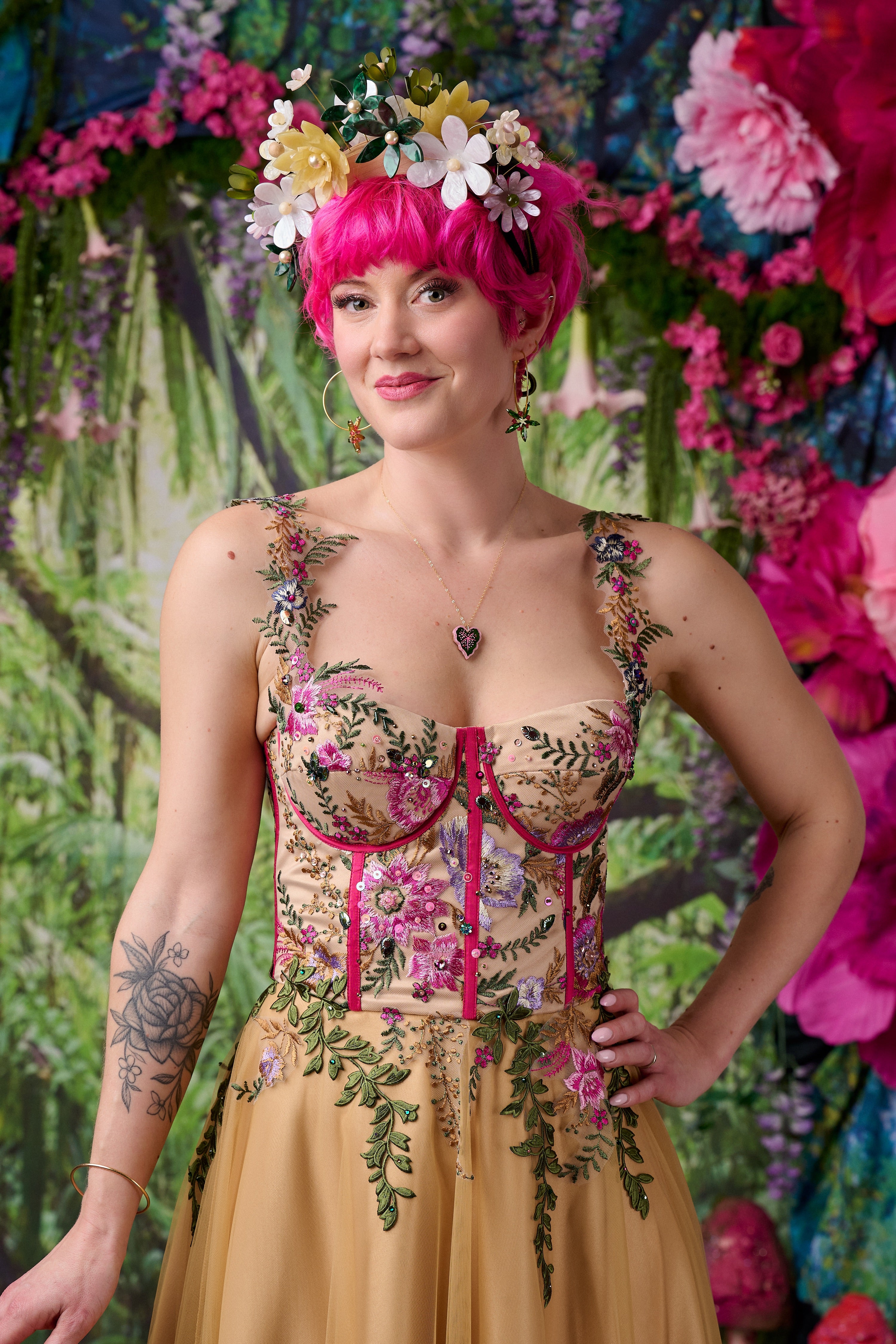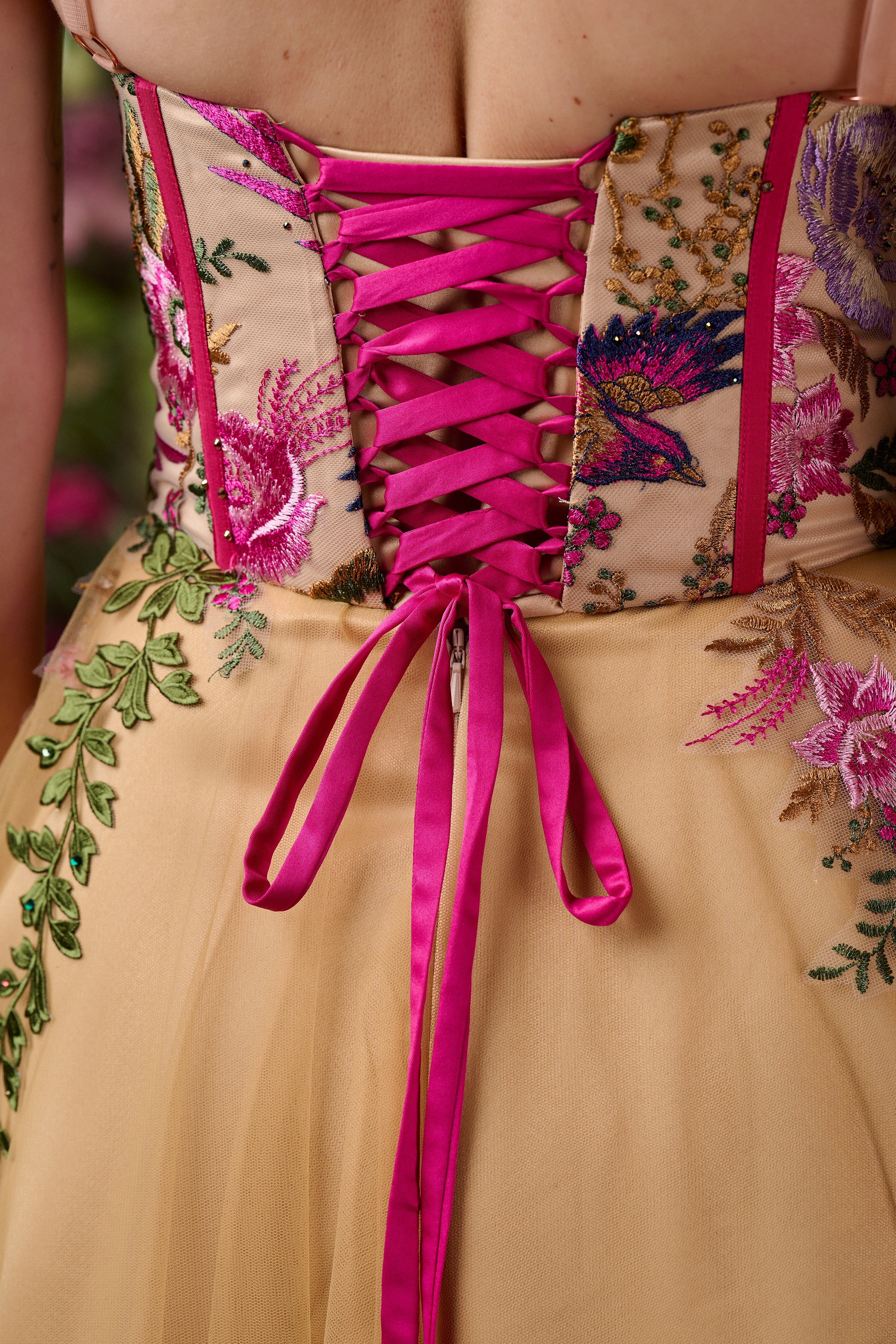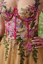 The bodice is carefully constructed with built-in cups, underwire and internal boning to create a beautifully sculpted silhouette. Sectioned panels of embroidered fabric feature delicate flowers and foliage which are then further enhanced with hand embellishment, adding texture and dimension to the design.