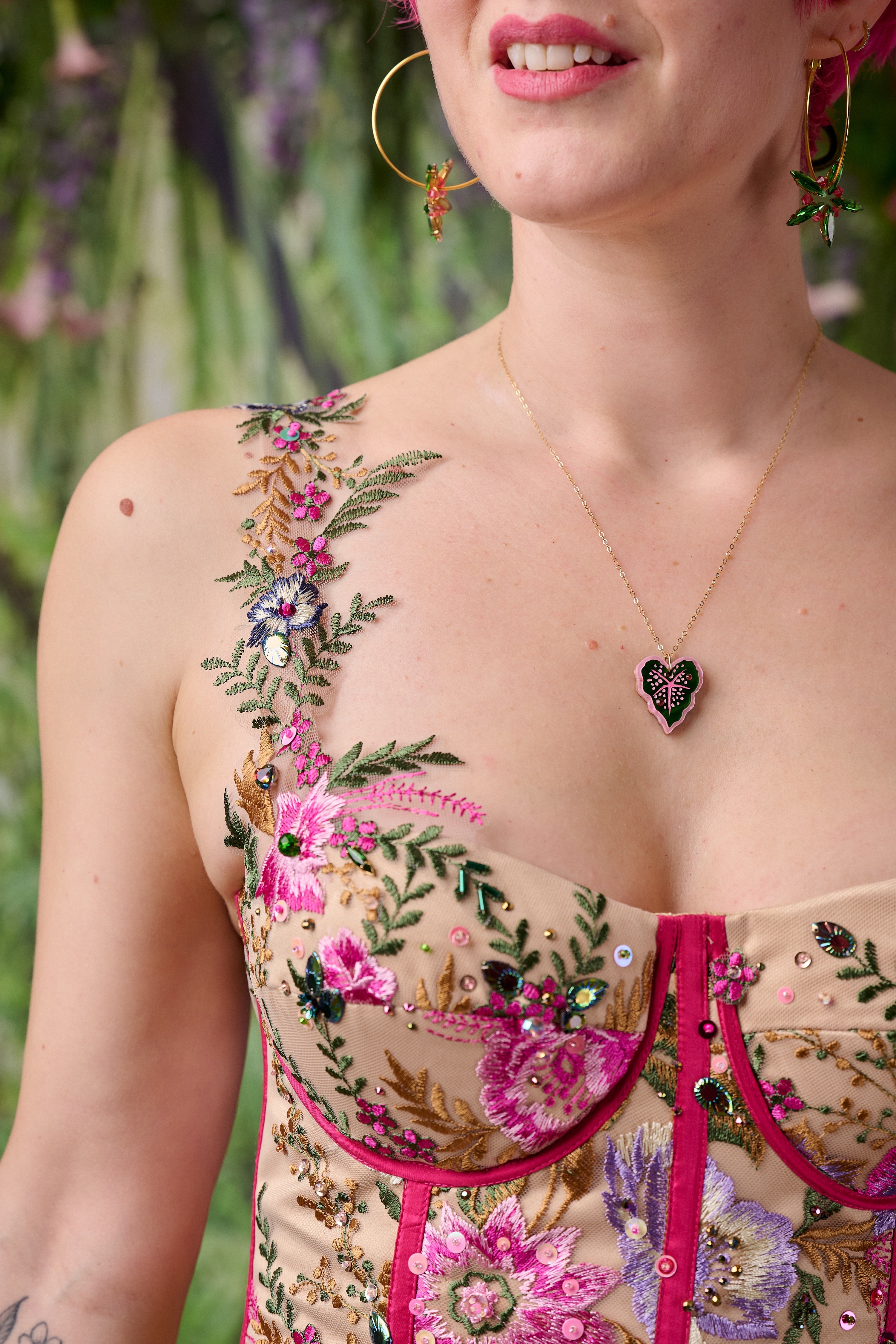 • Embroidered floral bodice panels