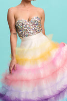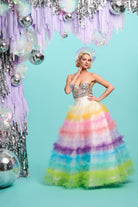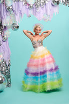 The Oskara skirt - fantastically fun and fabulous floor-length tulle masterpiece adorned with layers of gathered tulle in vibrant rainbow colours sewn onto an ivory tulle base. Beneath the layers of tulle lies a soft satin, ensuring comfort and elegance with every swoosh!