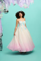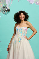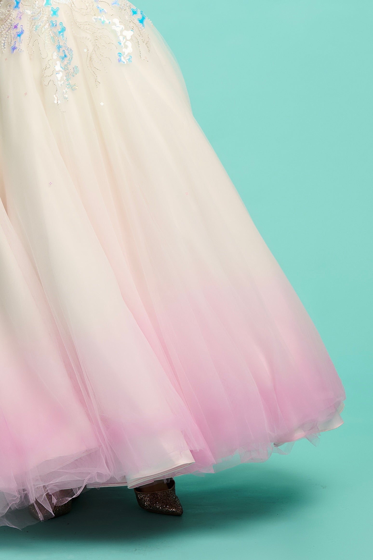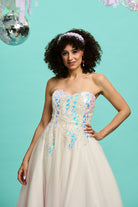 Crafted with layers upon layers of tulle and a captivating pink dip-dye hem, this gown is a vision of whimsy and romance. The bodice is adorned with exquisite tulle, meticulously embellished with sequins, beads, pearls, and sparkles, hand-cut into shapes that cascade gracefully into the skirt. Each detail is thoughtfully crafted to create a mesmerising effect, while tiny iridescent flowers scattered throughout the skirt add an extra touch of magic.