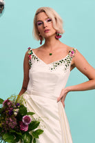 For added comfort and flexibility, hidden elastic inside the straps provides a subtle yet supportive touch, allowing for effortless movement throughout your special day. The straps themselves are adorned with intricate floral and leaf embroidery, meticulously hand-sewn with beads and sequin motifs. For those seeking a more understated look, the option to have the dress without these details is also available.