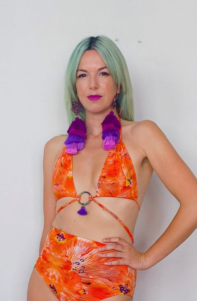 Louise wears with the matching high leg pants and mega purple tassel logo earrings